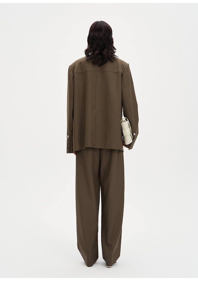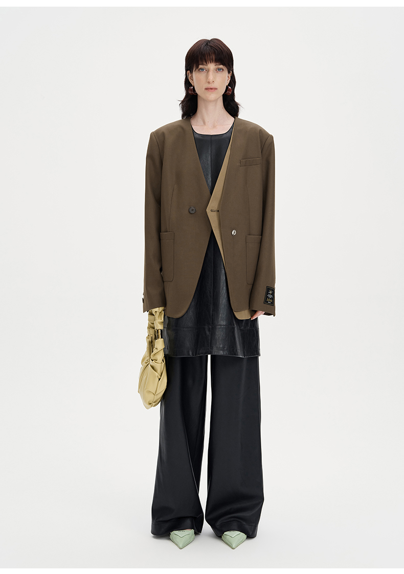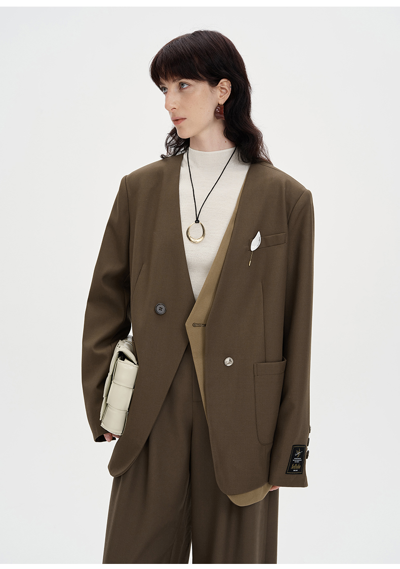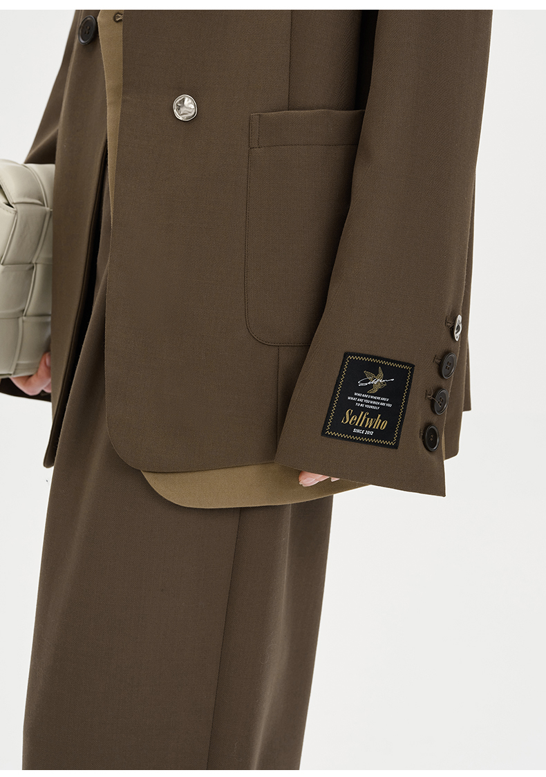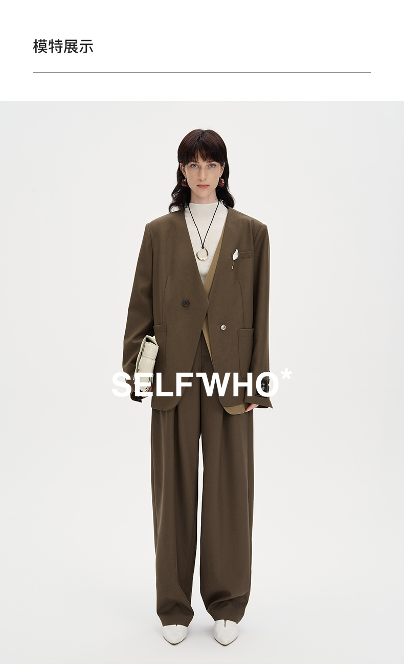 SELFWHO羊毛混纺棕色假两件西装外套女秋季2024新款宽松通勤西服