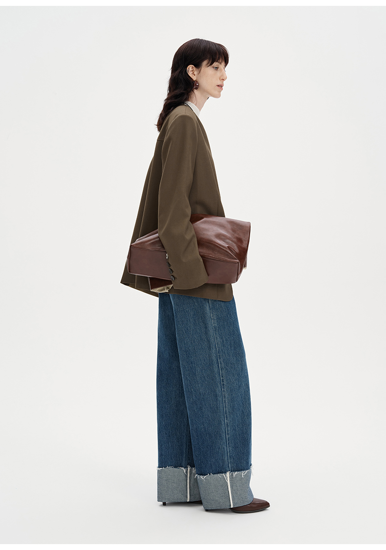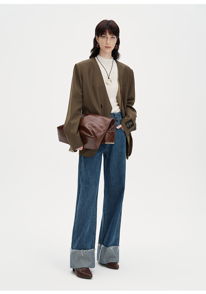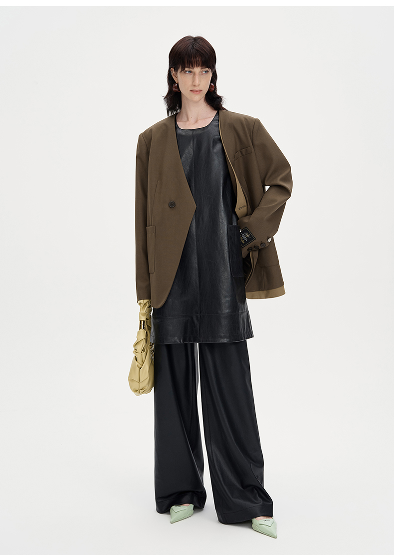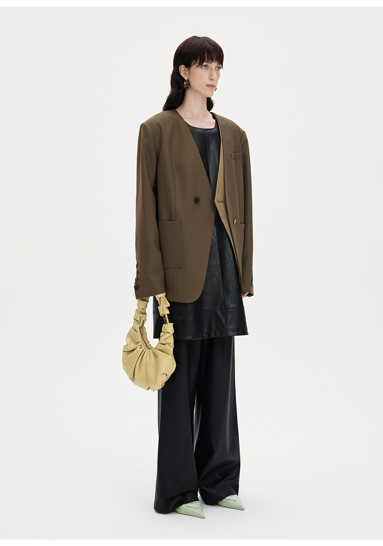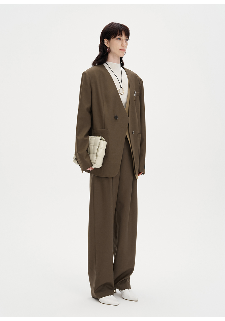 SELFWHO羊毛混纺棕色假两件西装外套女秋季2024新款宽松通勤西服