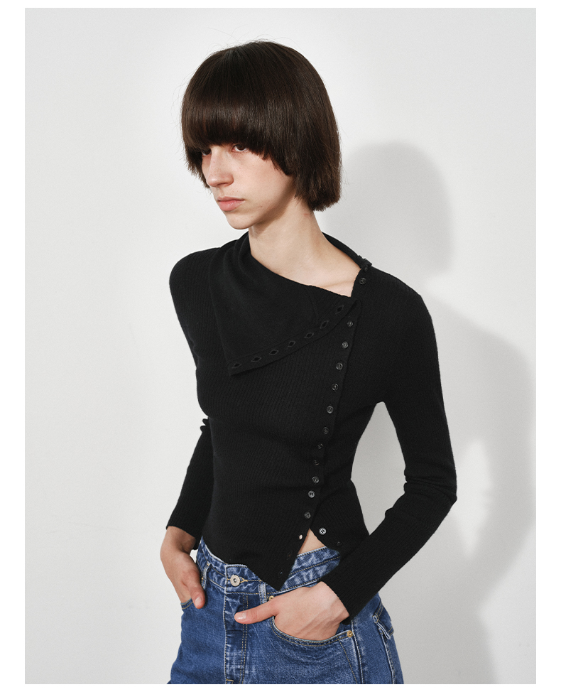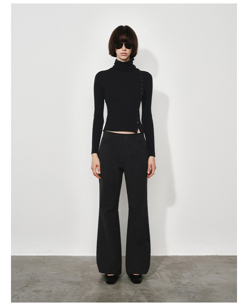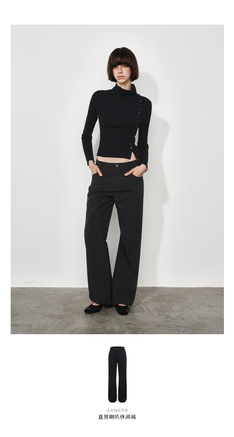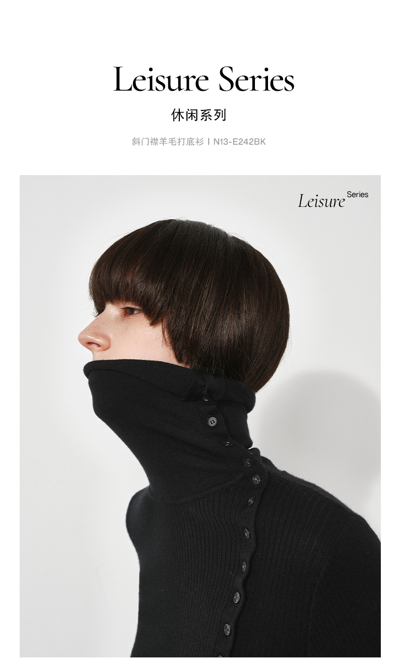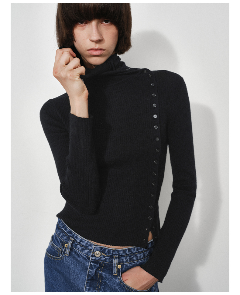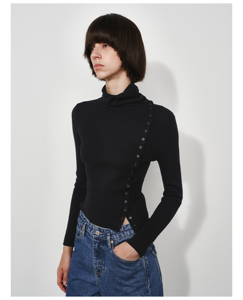 NUTH美利奴羊毛黑色高领修身薄款斜门襟长袖针织打底衫女