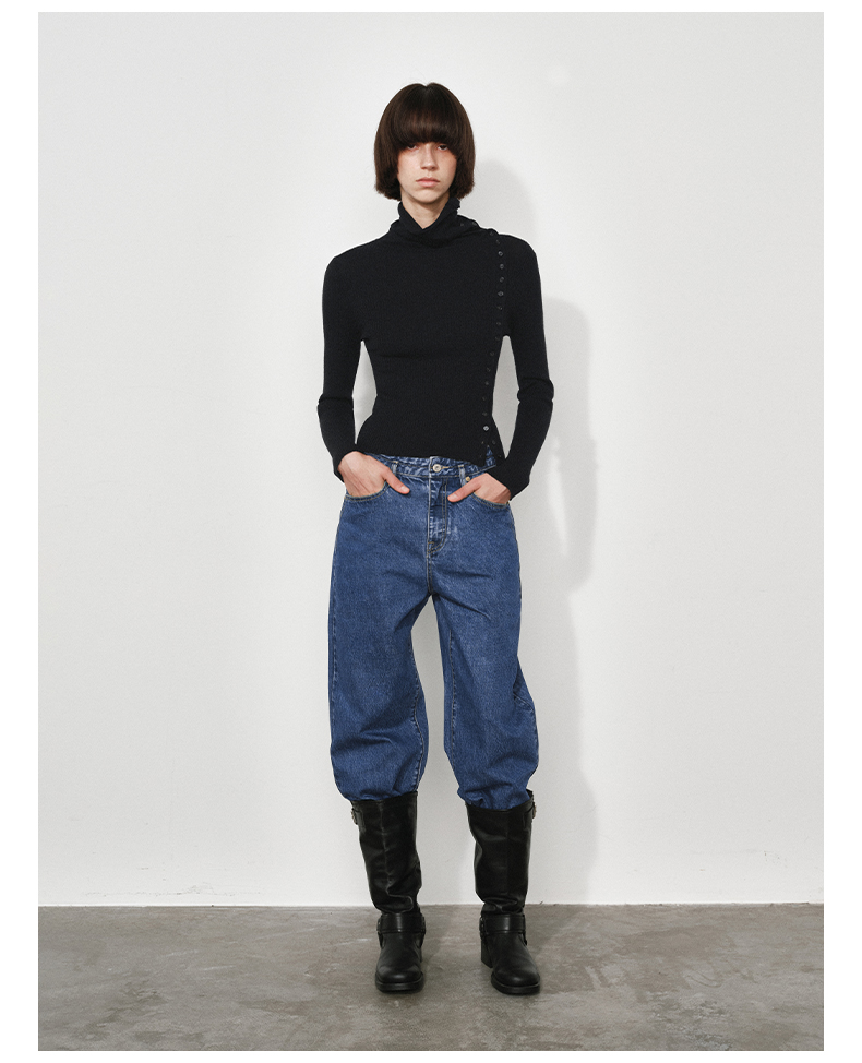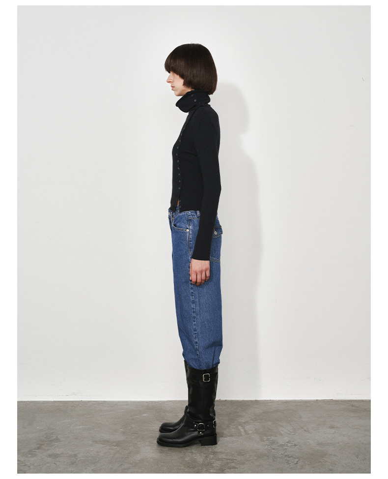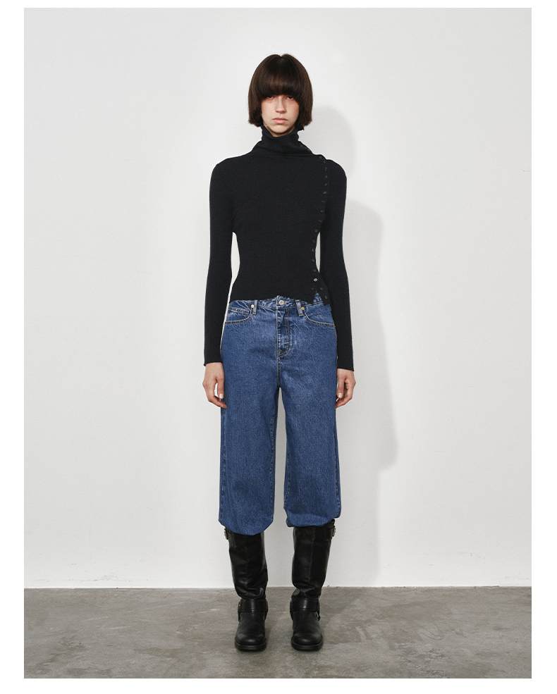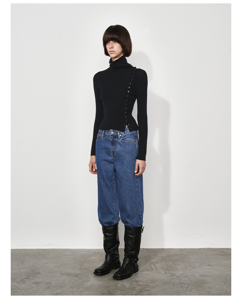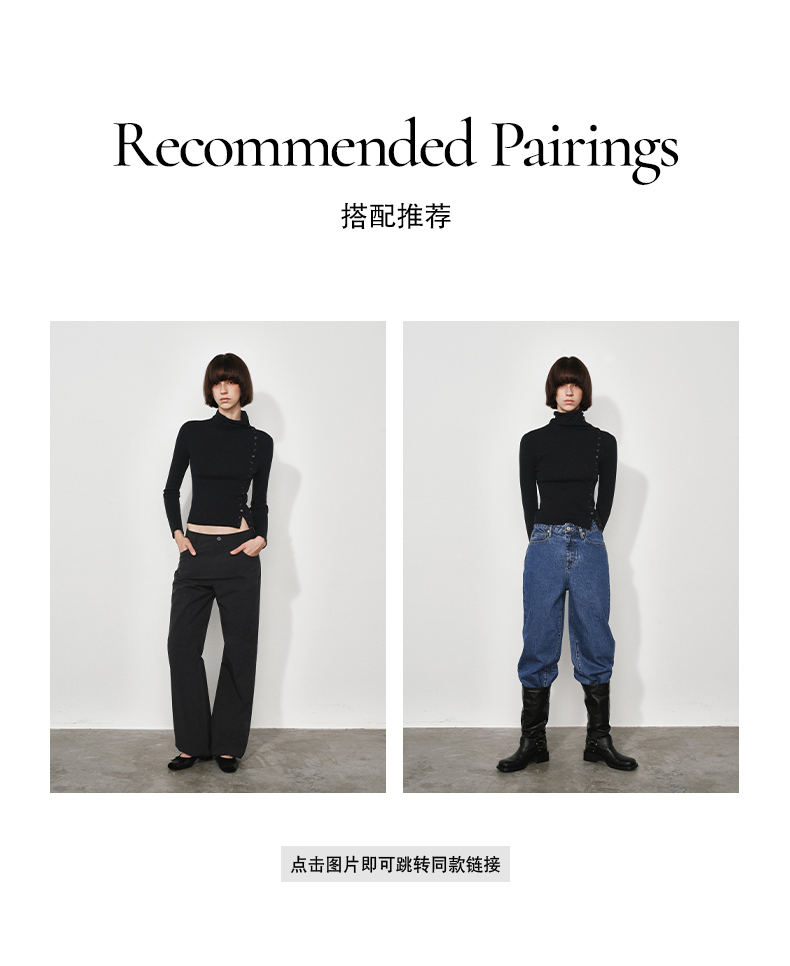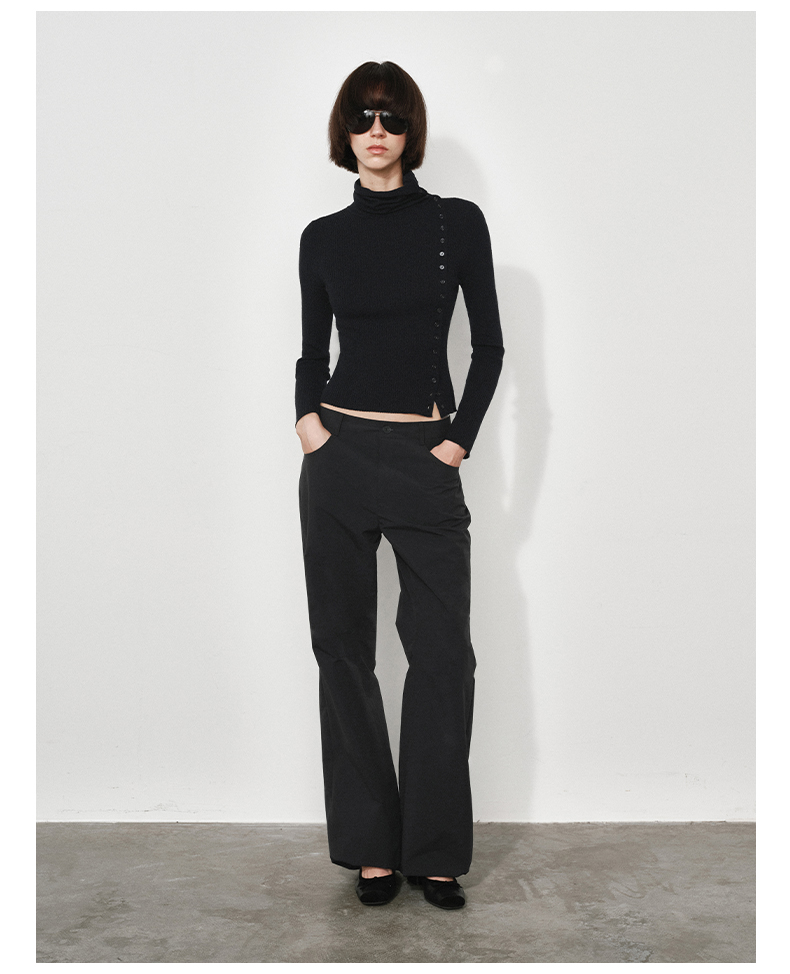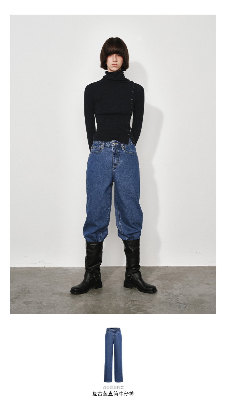 NUTH美利奴羊毛黑色高领修身薄款斜门襟长袖针织打底衫女