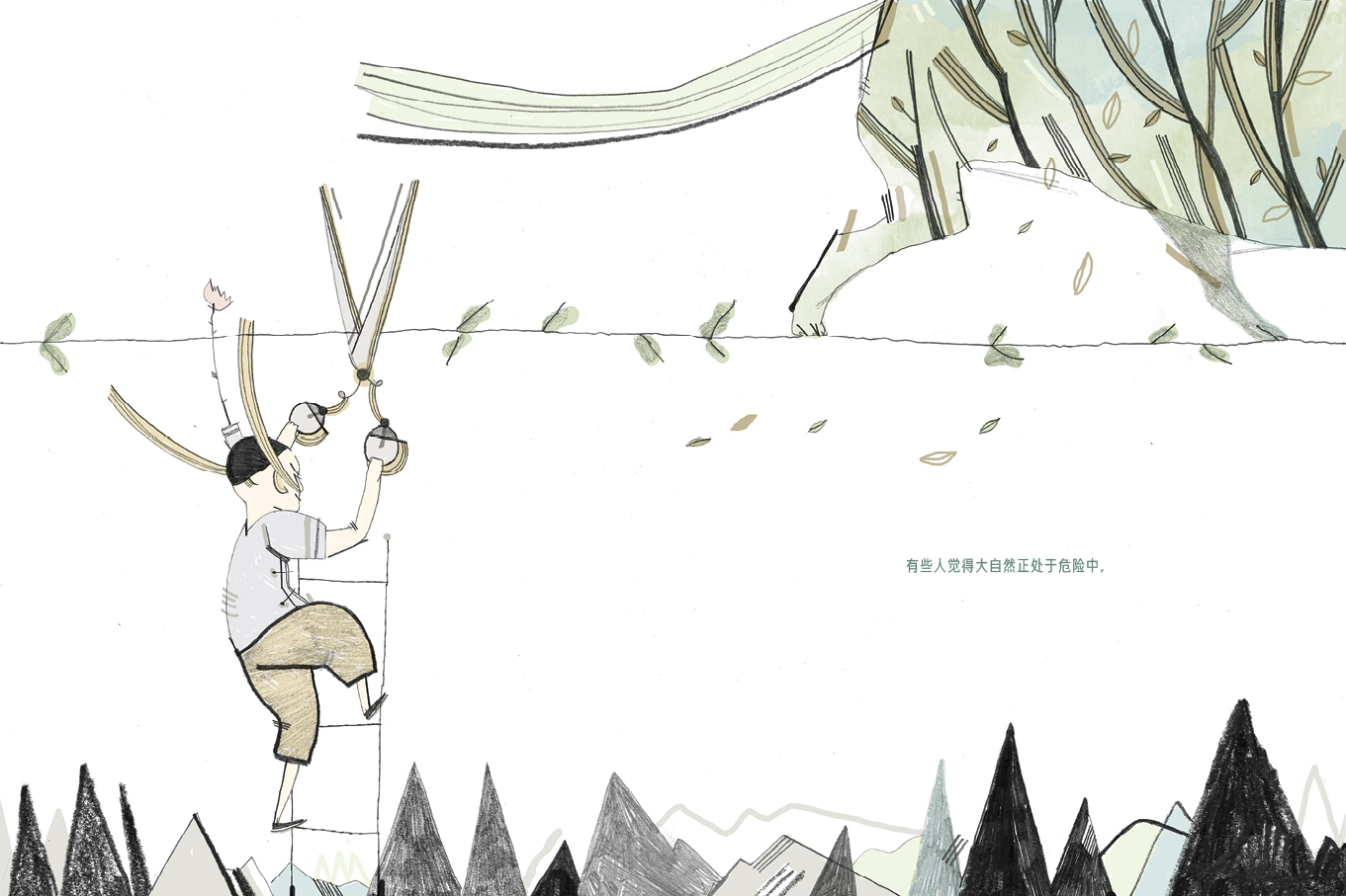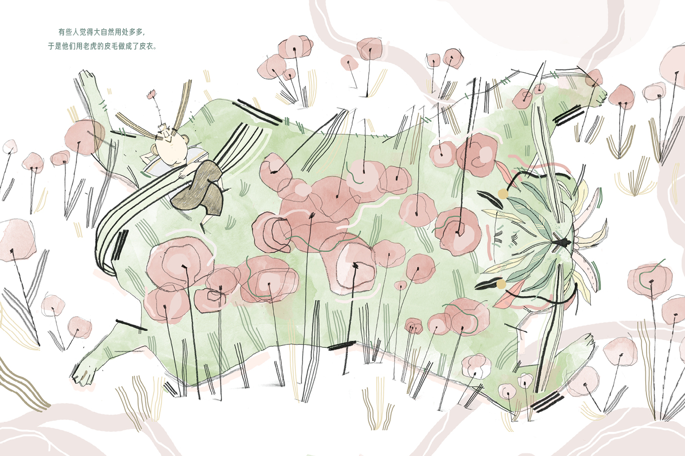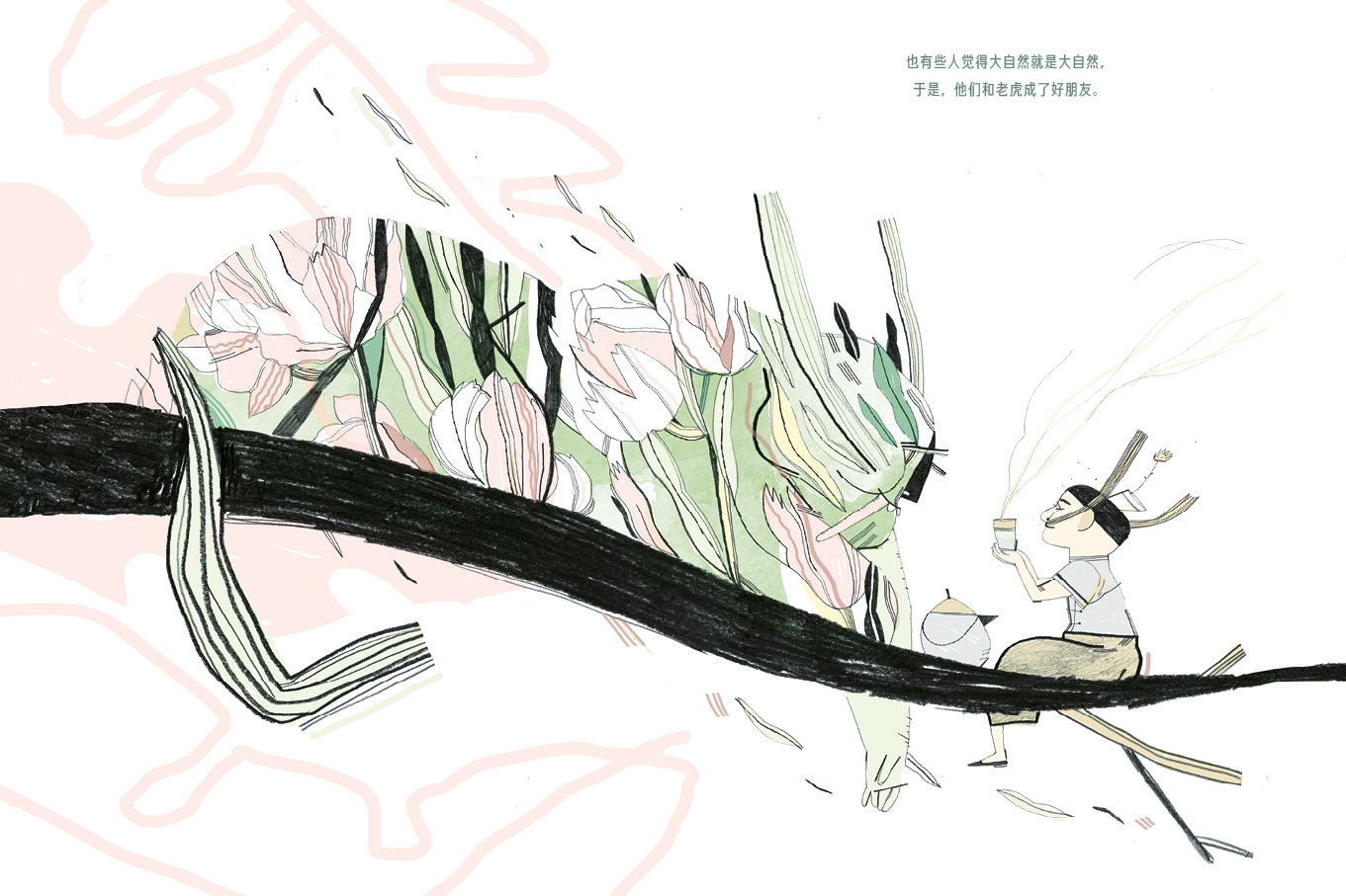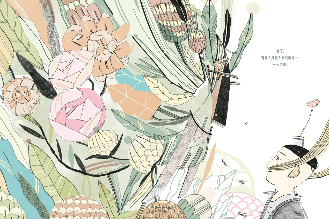 这是一本充满诗意和反讽意义的哲学思考图画书,根据印度谚语改编,面对大自然时,人类是应该支配它,驯服它,还是爱它?故事启发人类去思考人与大自然之间的关系:有人认为大自然是仁慈的,然后就自投虎口;有人认为大自然是有害的,就对老虎开枪;有人认为大自然是美好的,就把老虎给关进笼子里;有人认为大自然是有用的,就用老虎皮做成外套;有人认为大自然是会思考的,就把老虎脑子打开分析;有人认为大自然是天神,就对它顶礼膜拜;有人既不相信天神,也不相信大自然和老虎;有人认为大自然处于危险中,就建保护区把老虎保护起来;有人认为大自然就是大自然,然后成为老虎的朋友;终于有人最后意识到大自然就是老虎,要顺其自然,不要干涉过多。