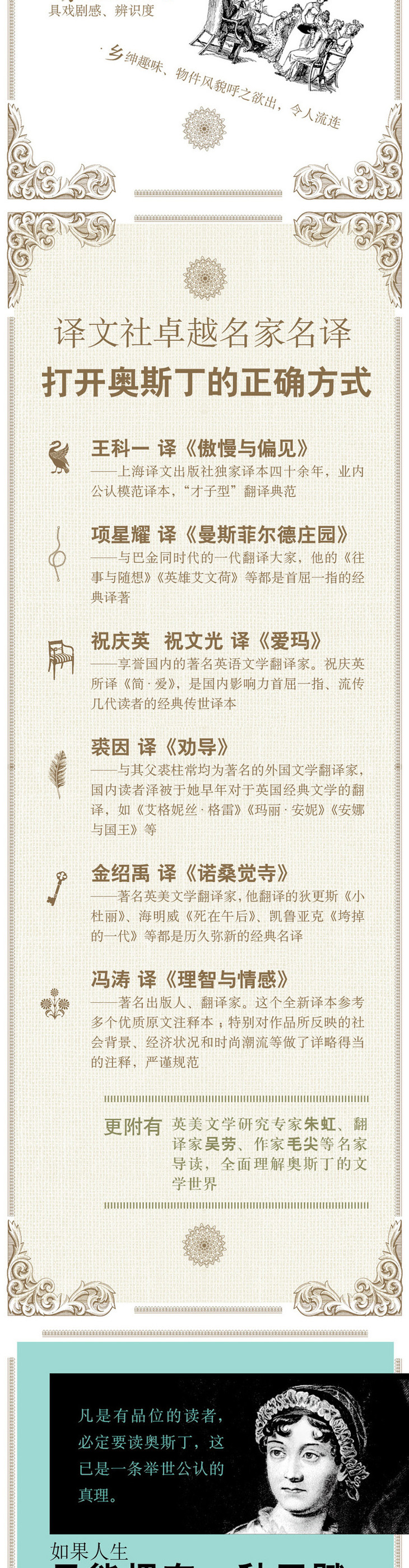 简·奥斯丁(1775—1817),英国十八世纪末十九世纪初最著名的女作家。所著六部小说皆为传世经典:《傲慢与偏见》《理智与情感》《爱玛》《劝导》《诺桑觉寺》《曼斯菲尔德庄园》。用文学评论巨匠埃德蒙·威尔逊的话来讲,就是在英国文学近一又四分之一世纪的历史上,曾发生过几次趣味的革命,惟独莎士比亚和简·奥斯丁经久不衰。