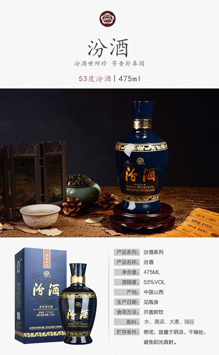 【推荐】汾酒 53度 蓝汾 475mL *6瓶 整箱 清香型白酒