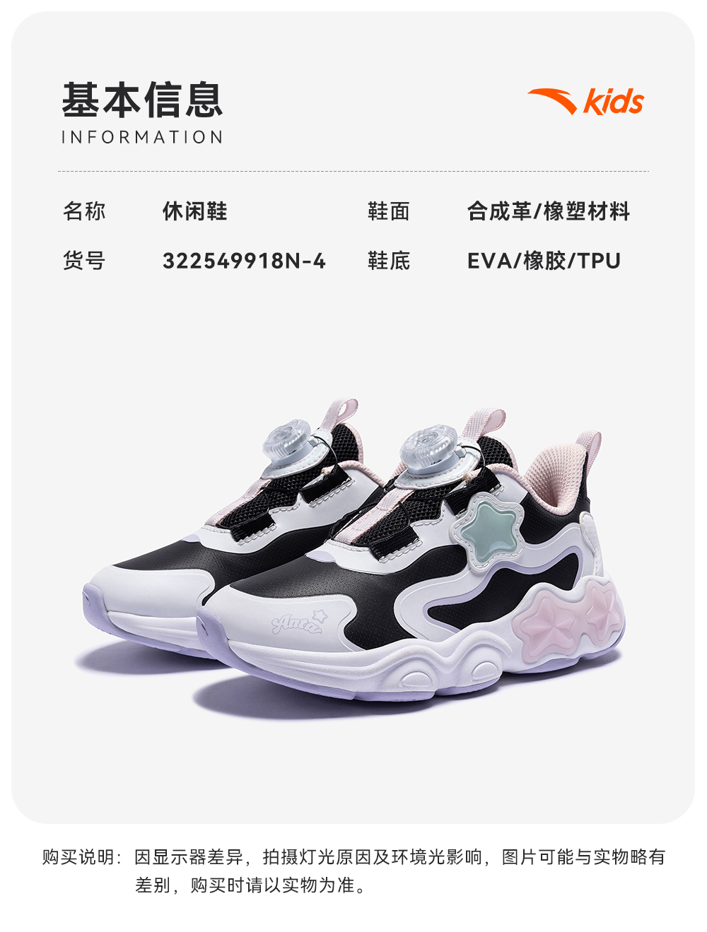 灯鞋安踏儿童女小童休闲鞋2025冬季新款舒适防滑耐磨儿童旋钮童鞋322549918N