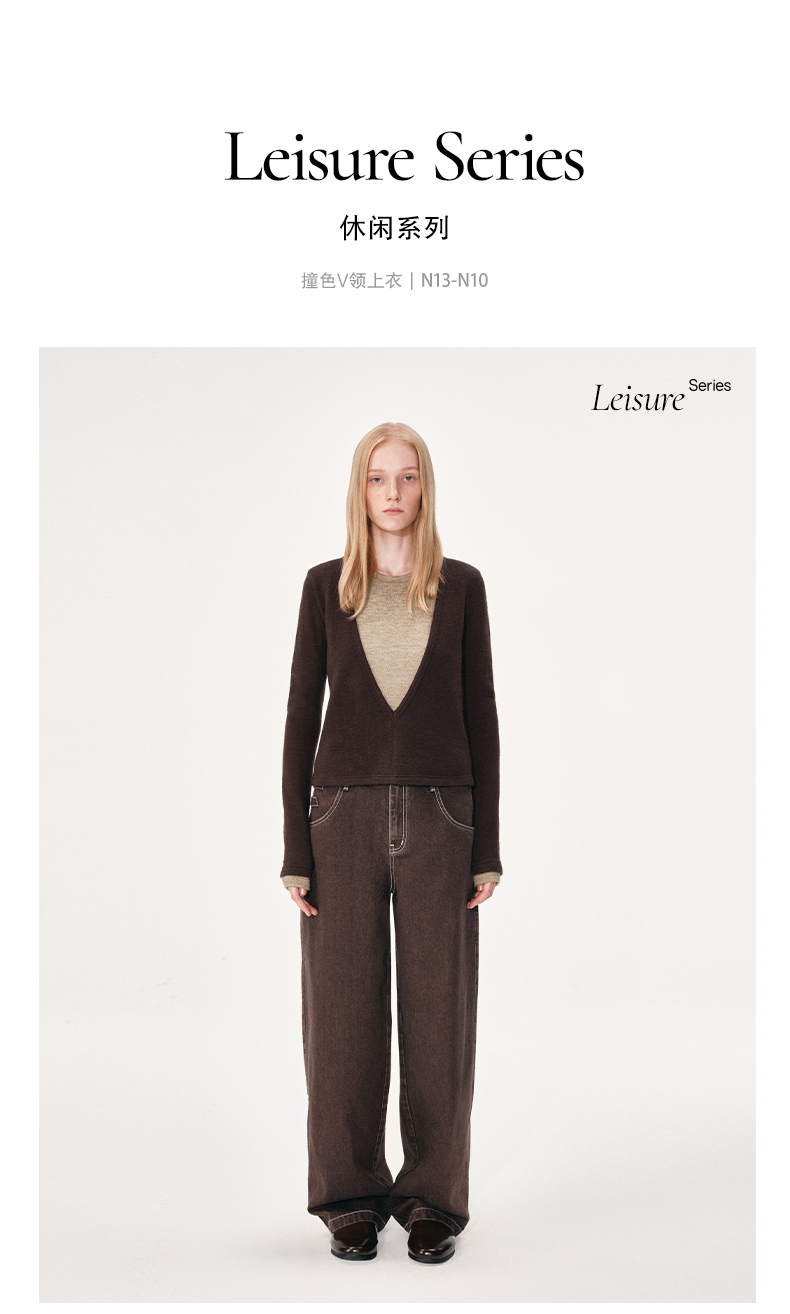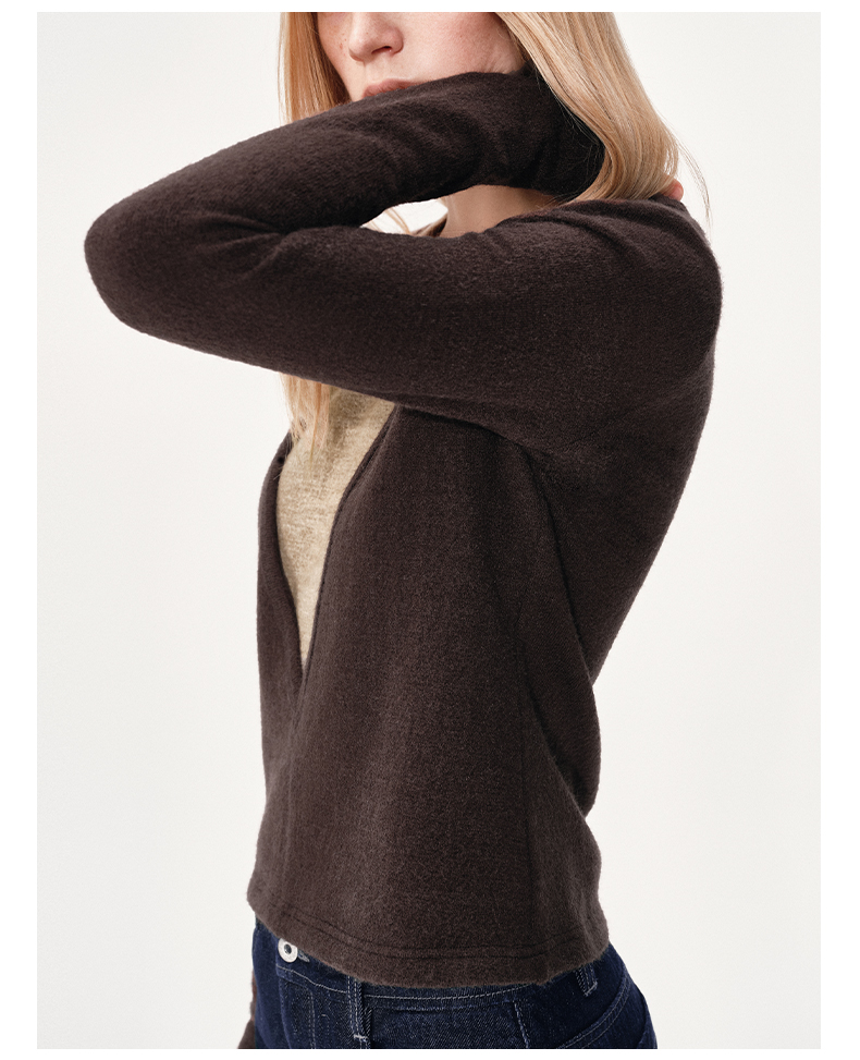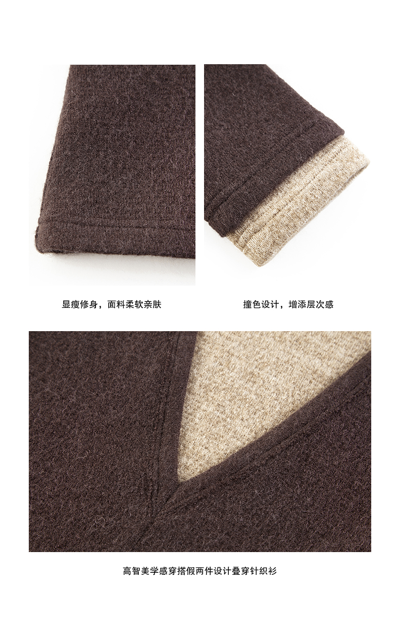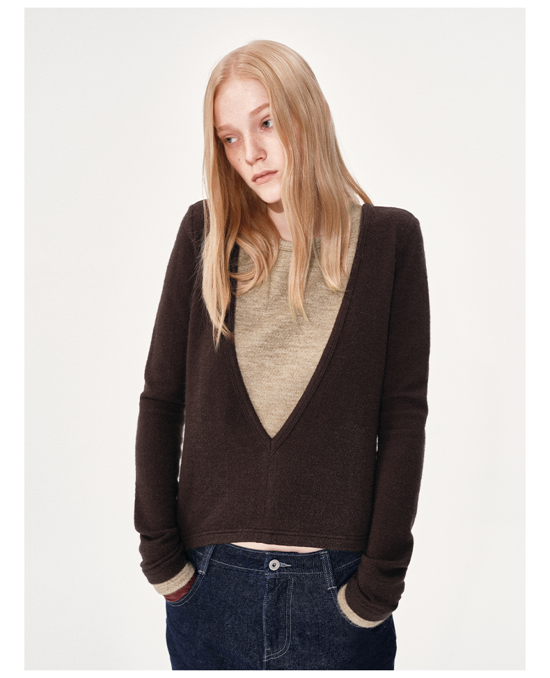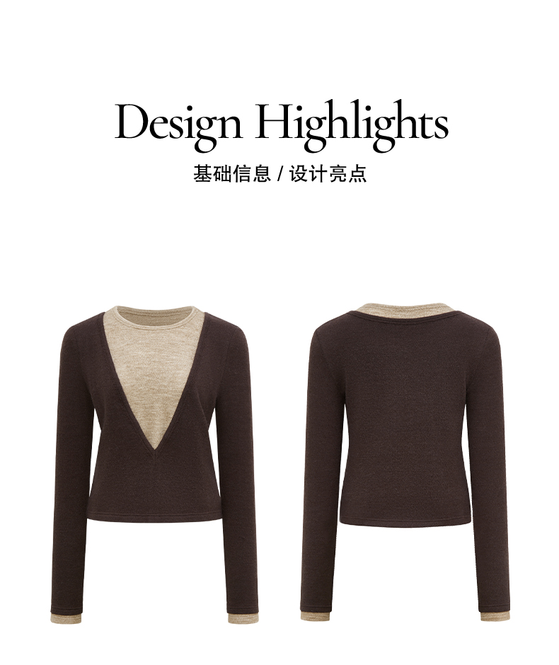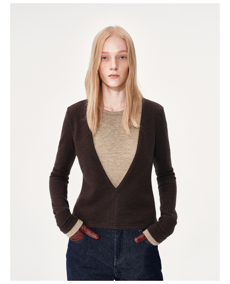 NUTH 假两件撞色修身正肩v领针织衫上衣女 棕色