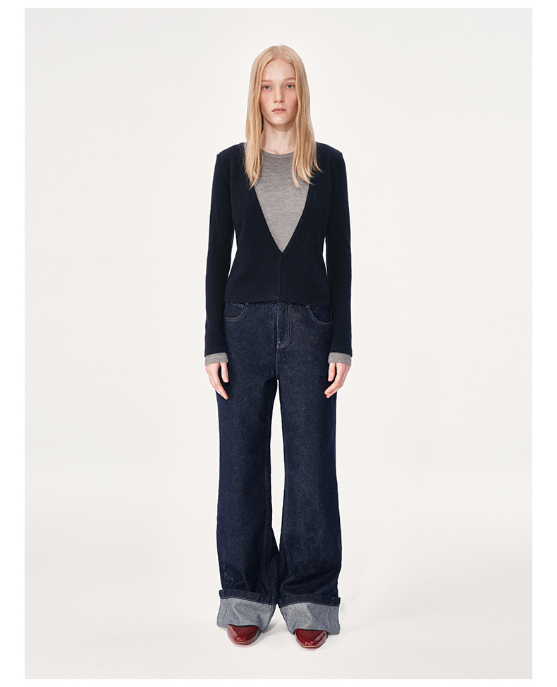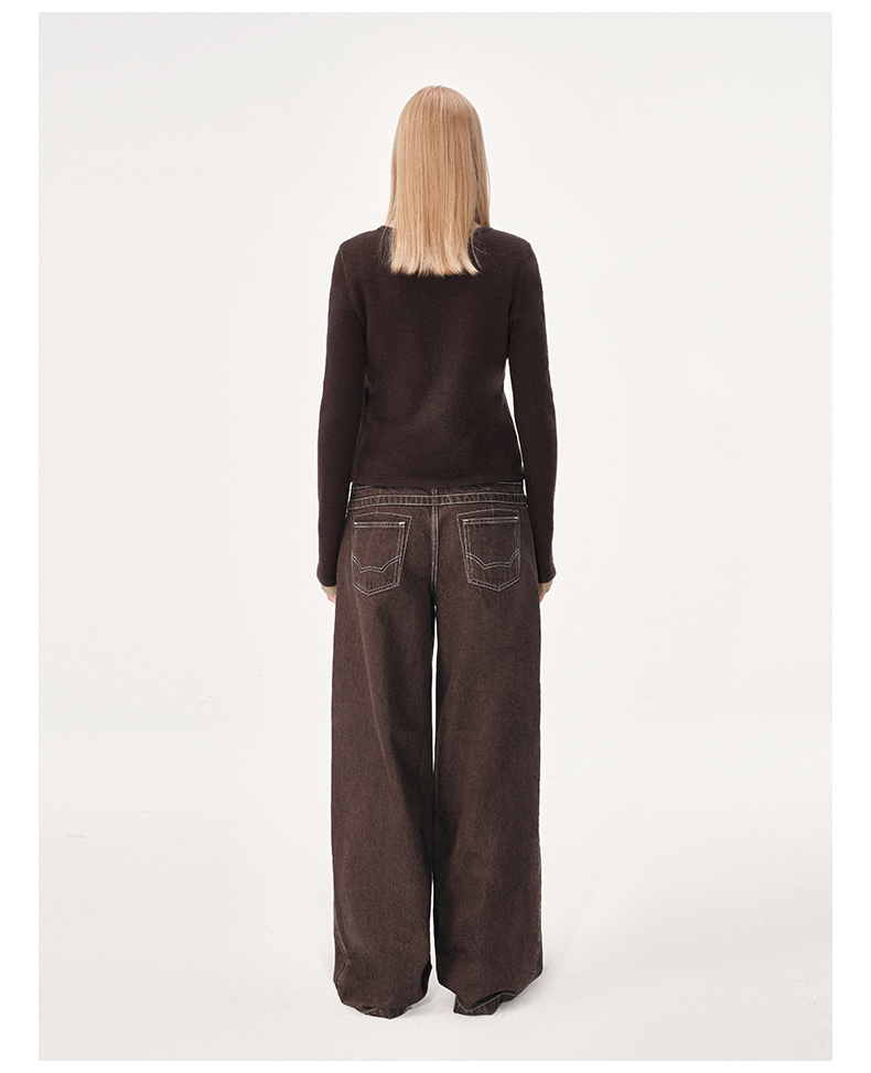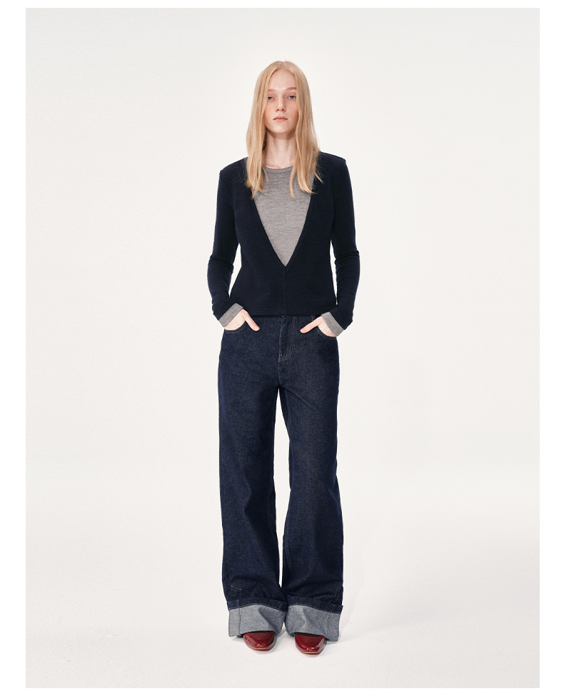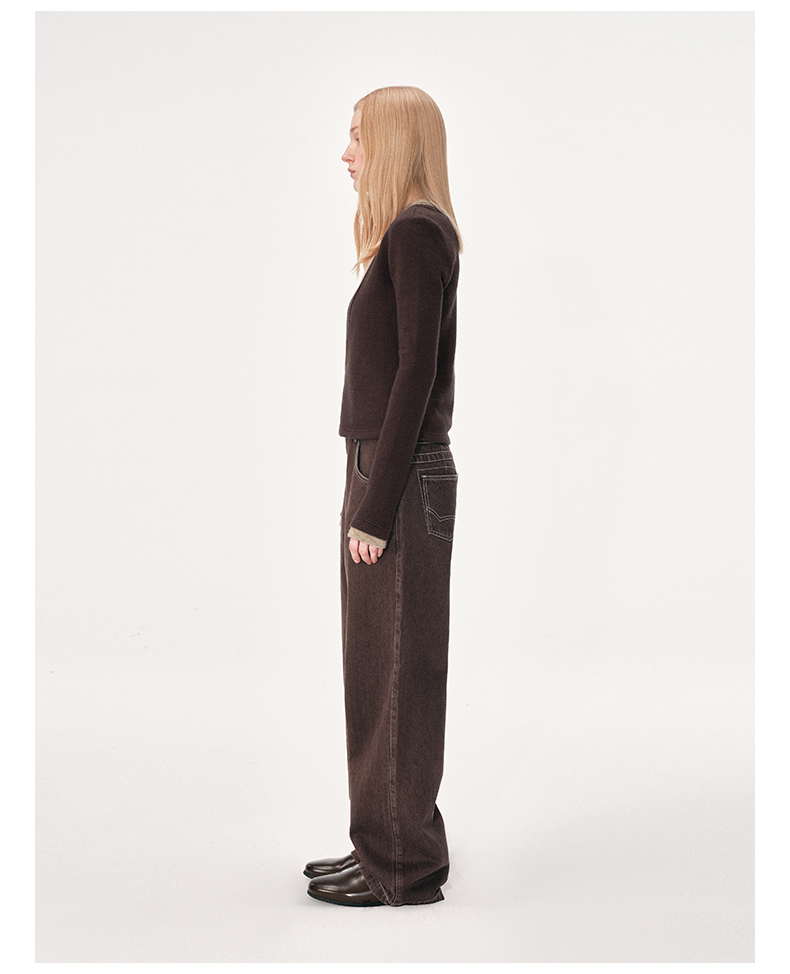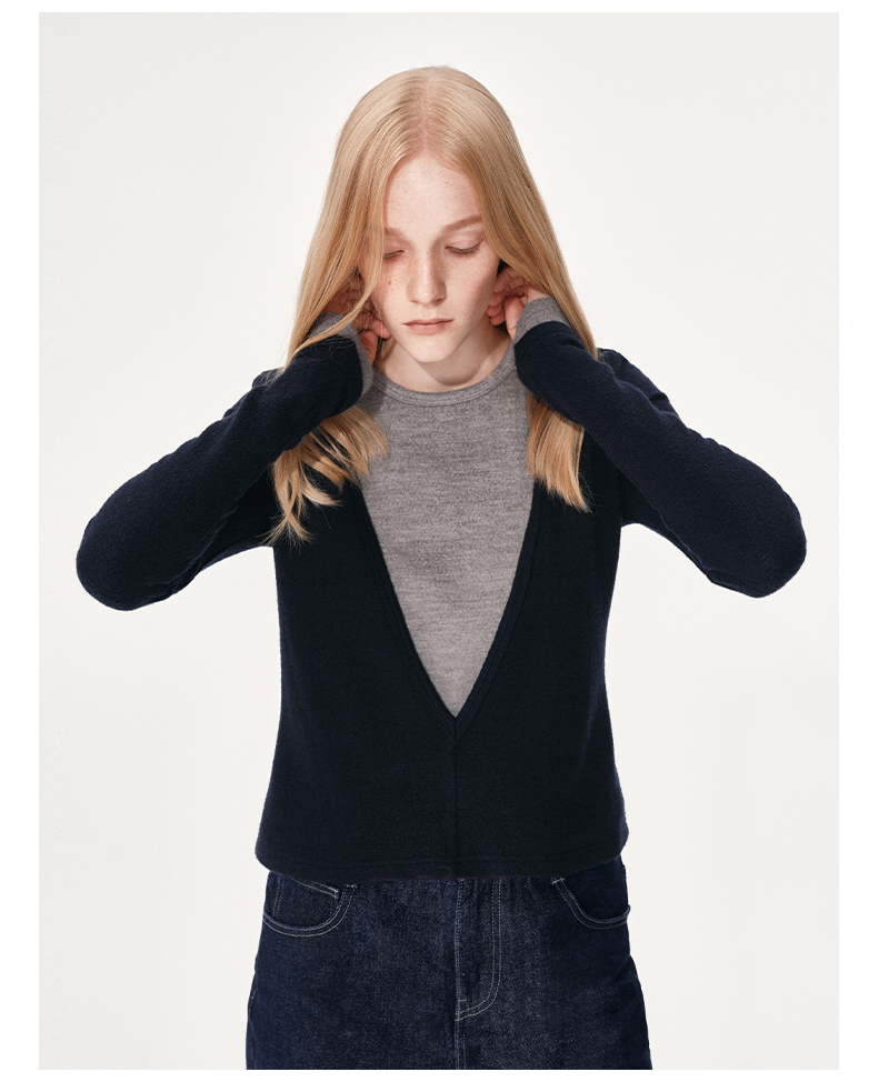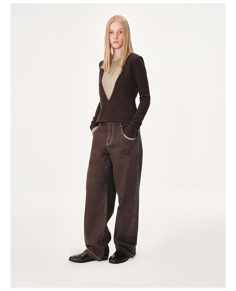 NUTH 假两件撞色修身正肩v领针织衫上衣女 棕色