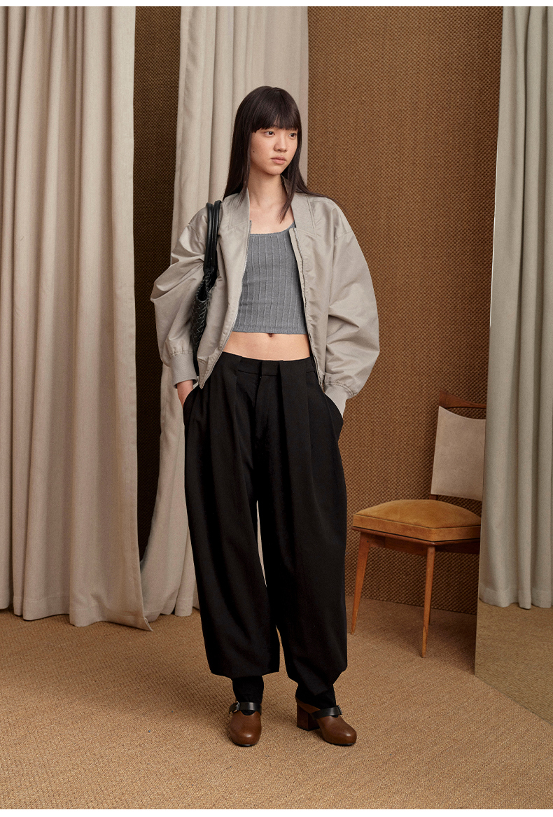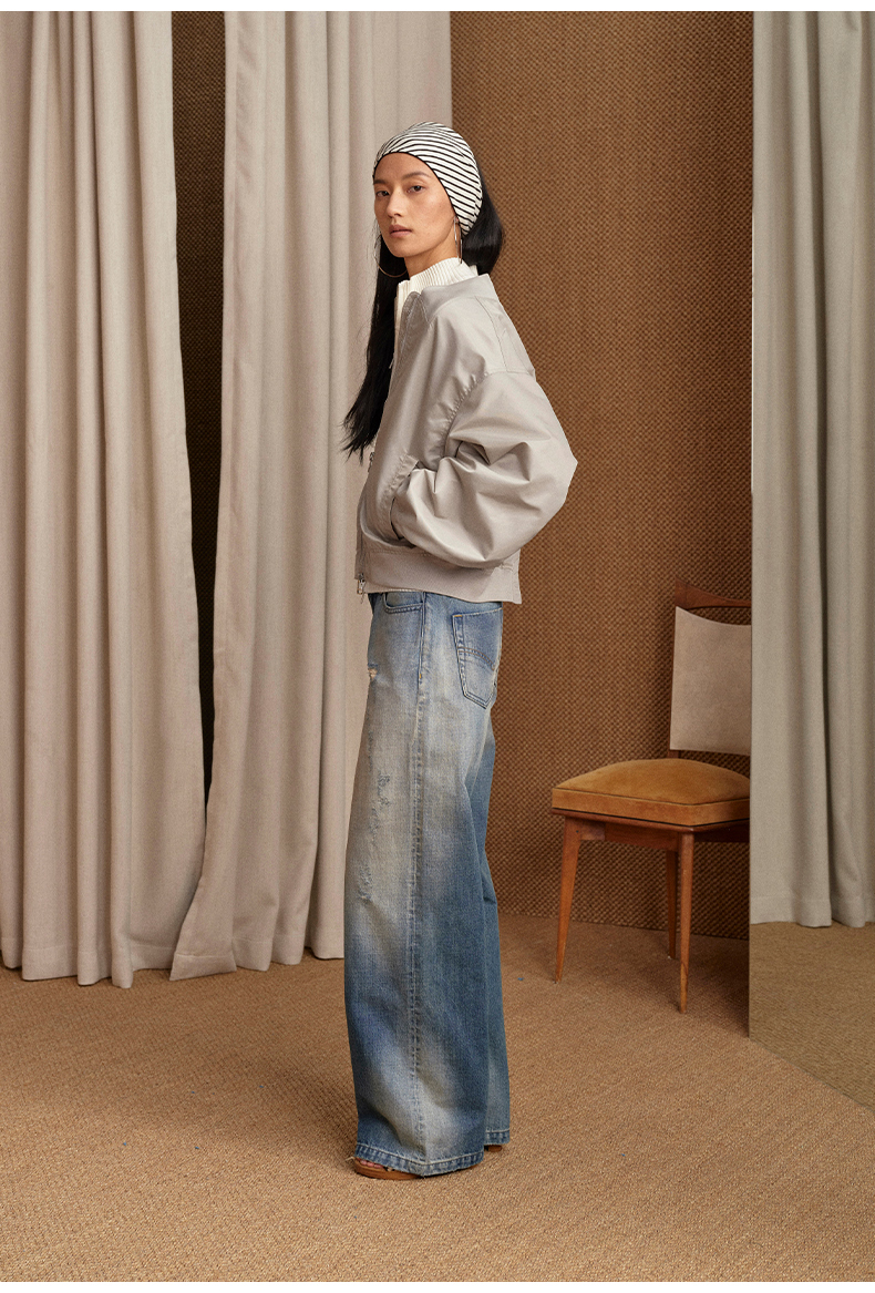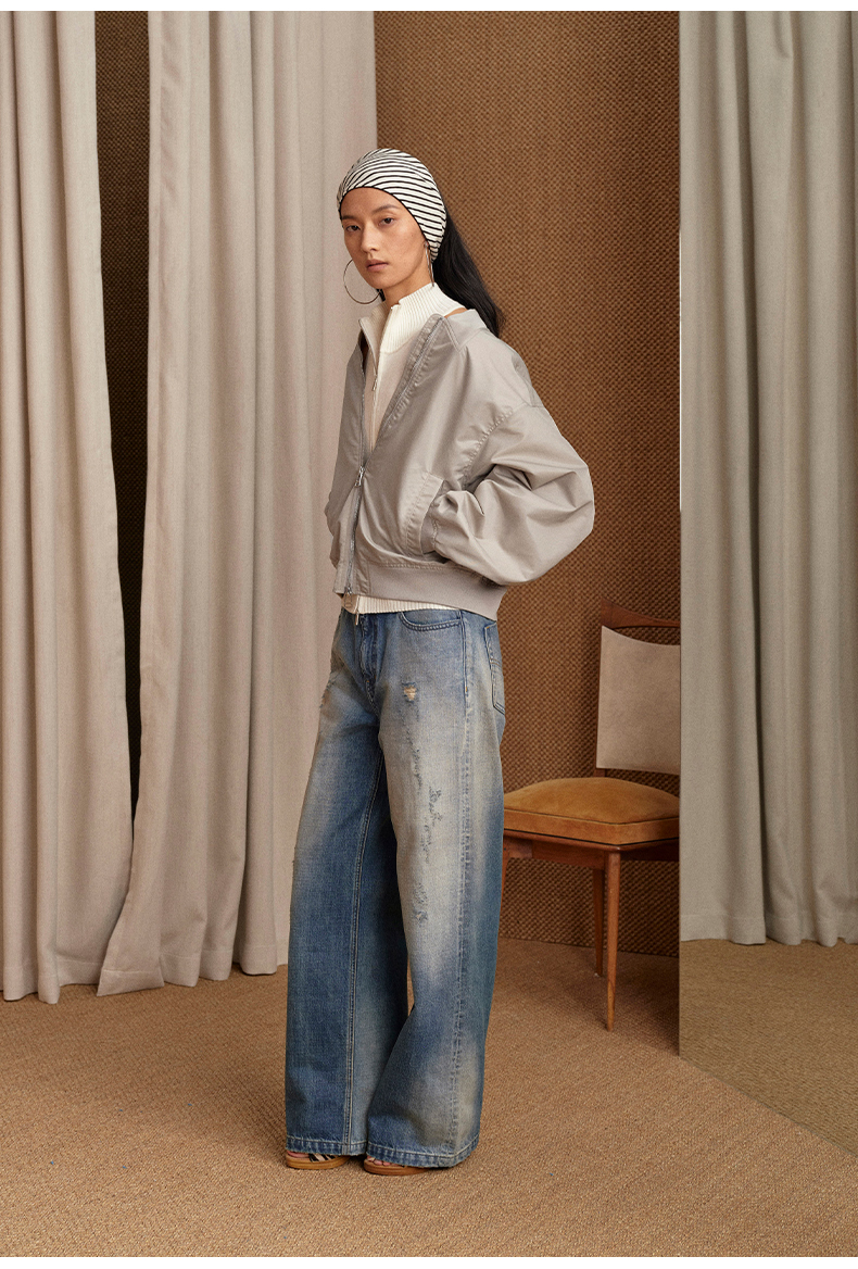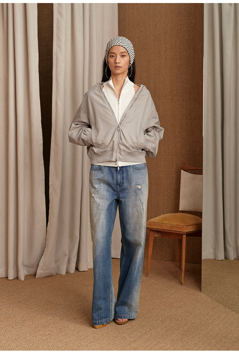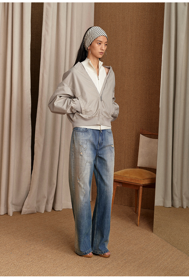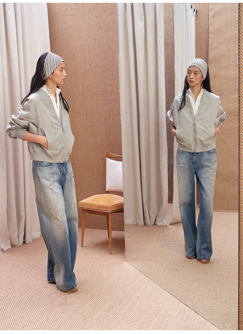 NUTH 宽松短款bomber夹克后拉链廓形外套女 浅灰豆绿