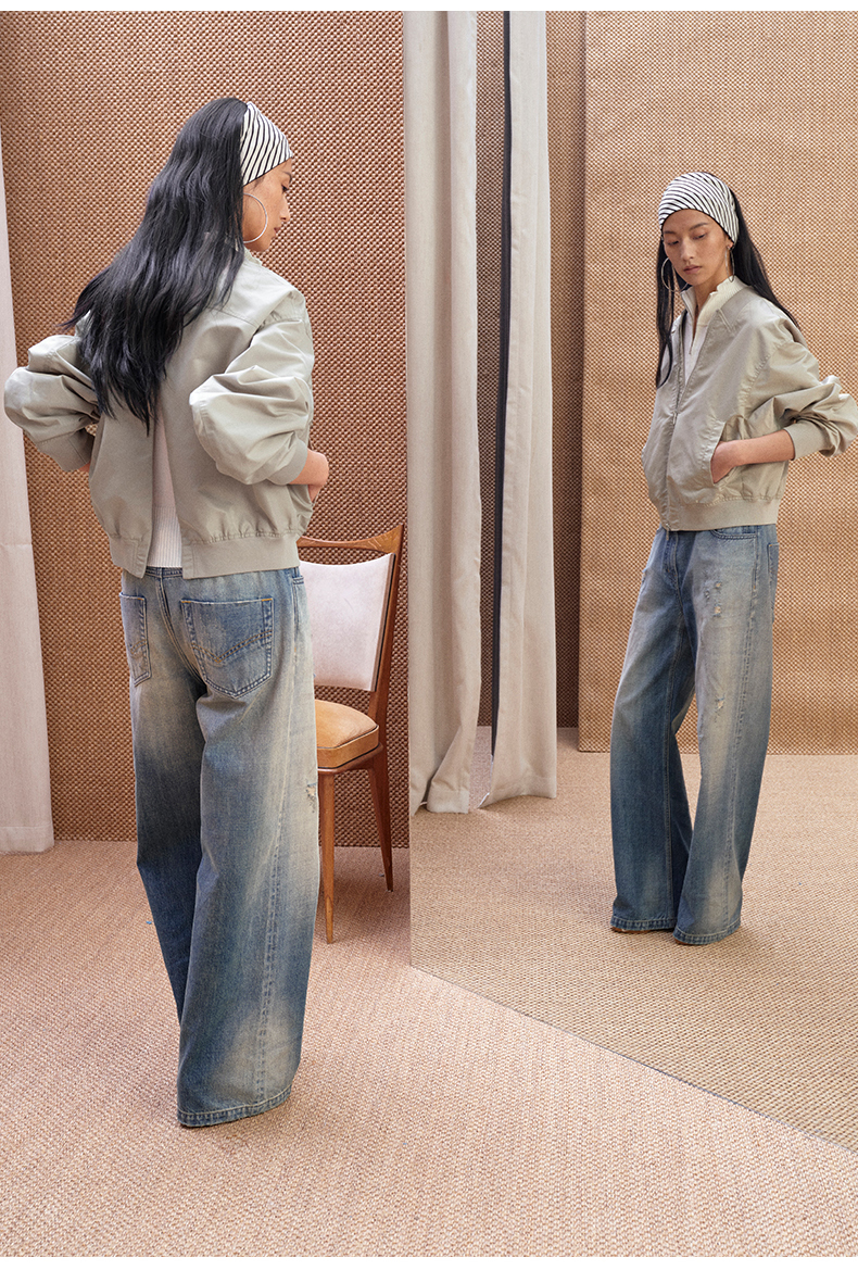 NUTH 立体抓褶设计水洗做旧宽松直筒阔腿牛仔裤
