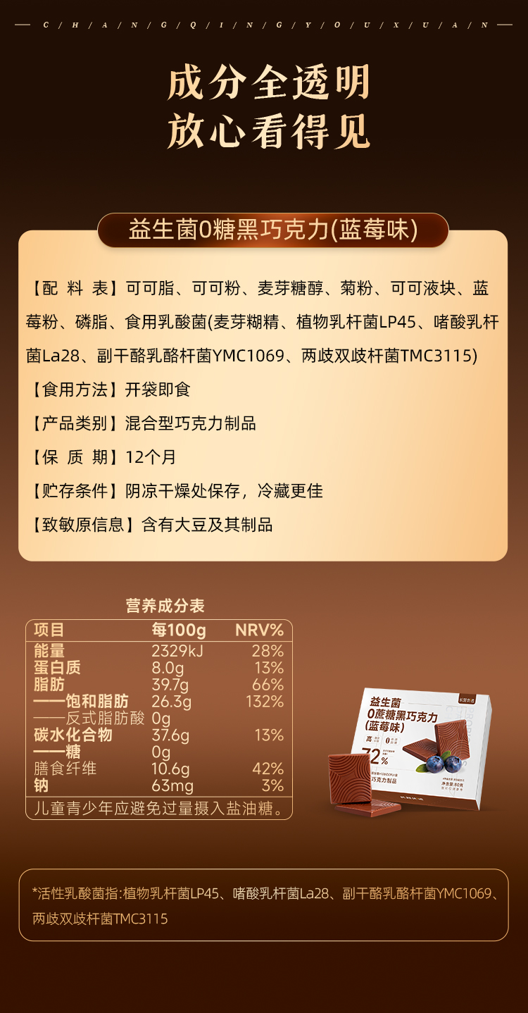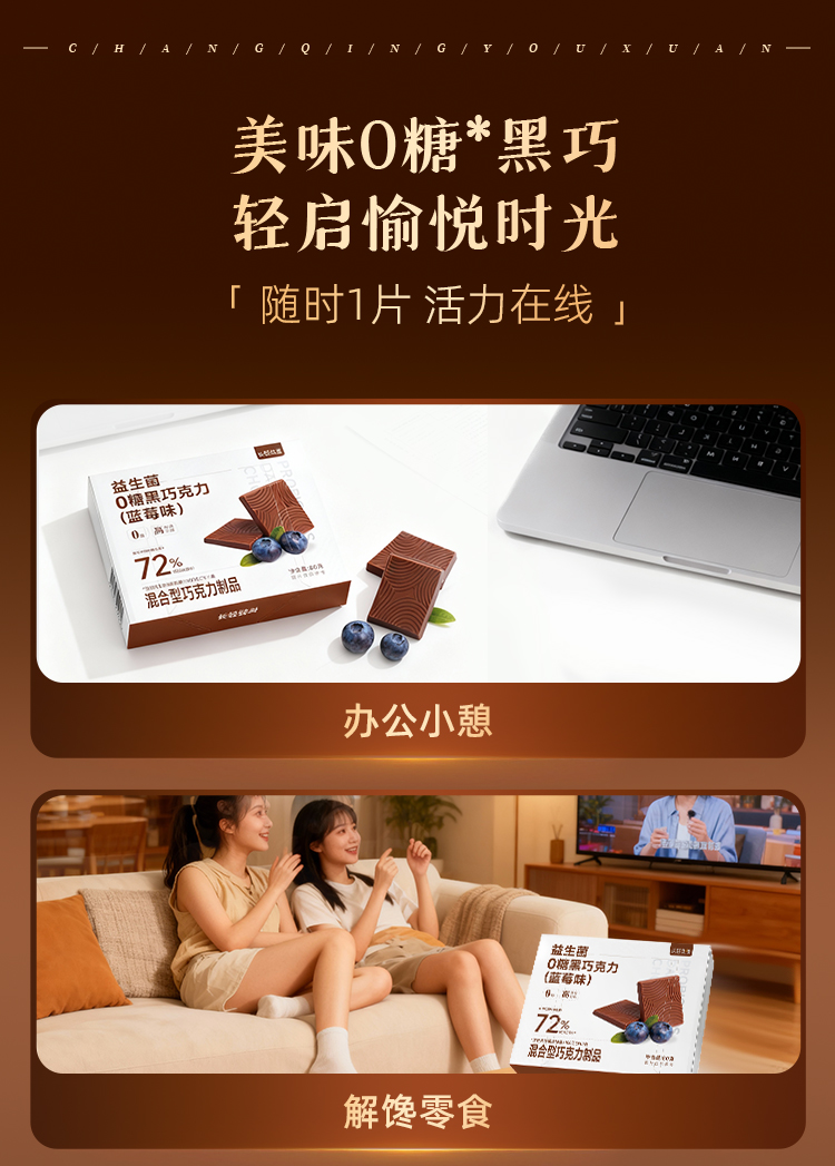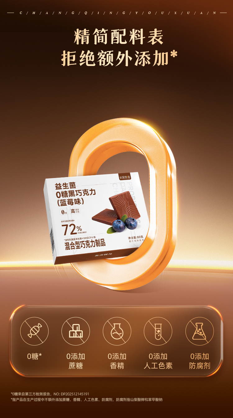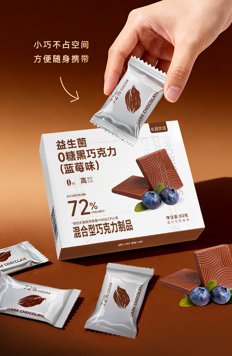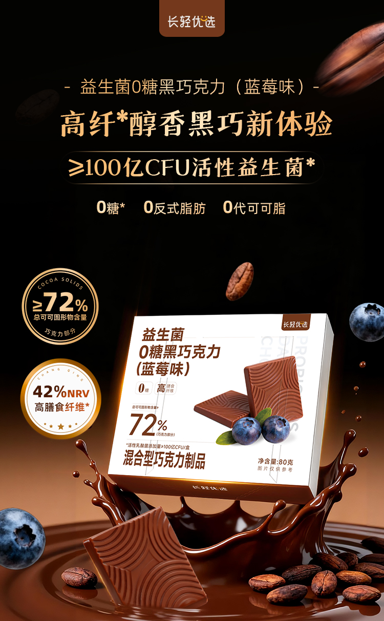 【1216早市直播】【新品】长轻优选 益生菌0糖黑巧克力蓝莓味 80g/盒 入口浓郁黑巧香