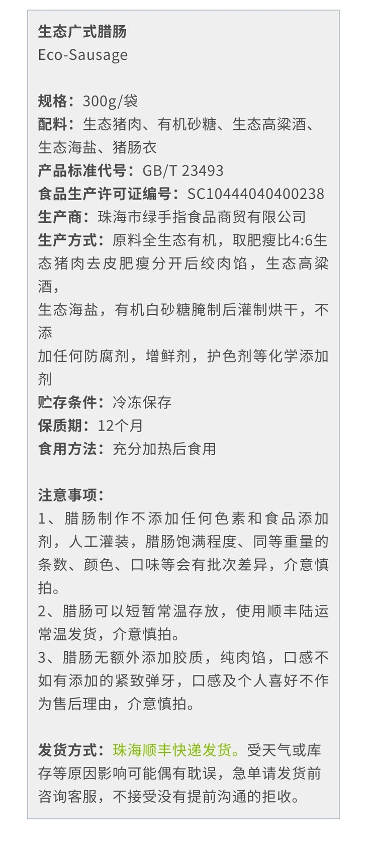 腊肠灌制后用咸水草手工分段,在洁净环的烘房内烘干。腊肠加工,严格按照传统广式腊肠的加工方式,真空包装,因为没有添加防腐剂,所以需要冷冻保存,可保存12个月。