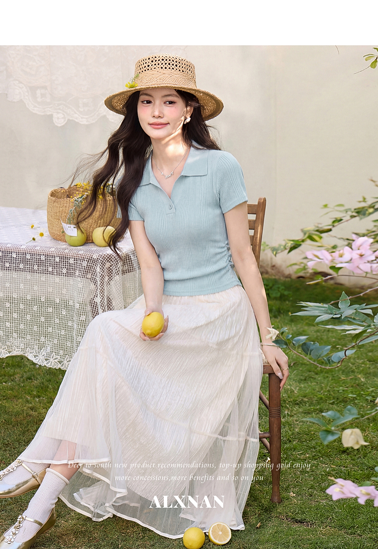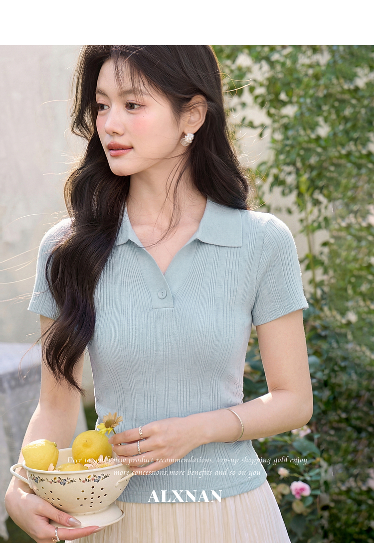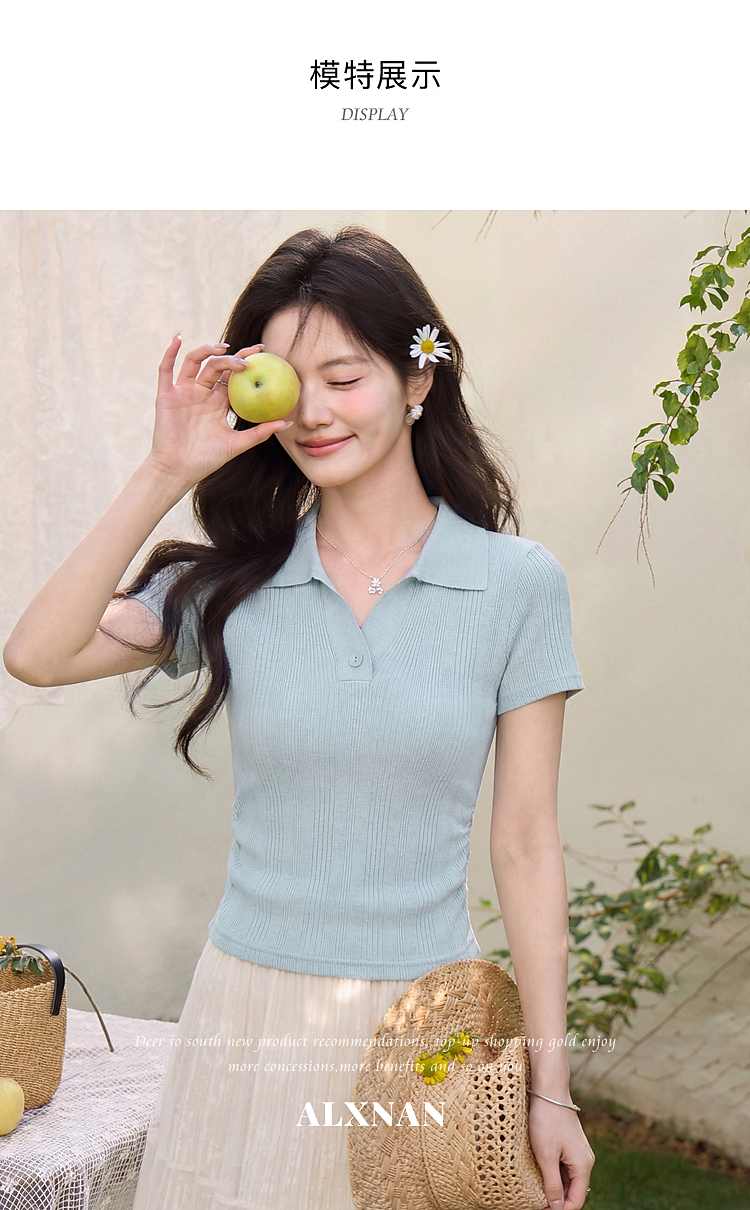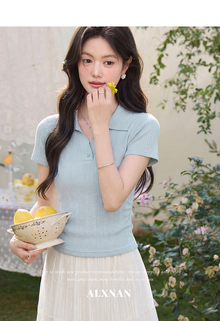 鹿向南「静夏时光」浅蓝色针织衫女夏季新款气质舒适修身短袖上衣