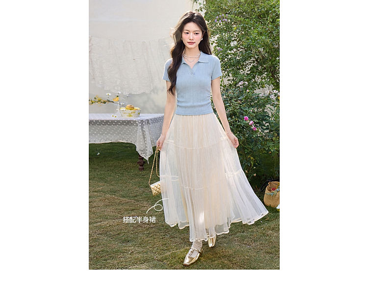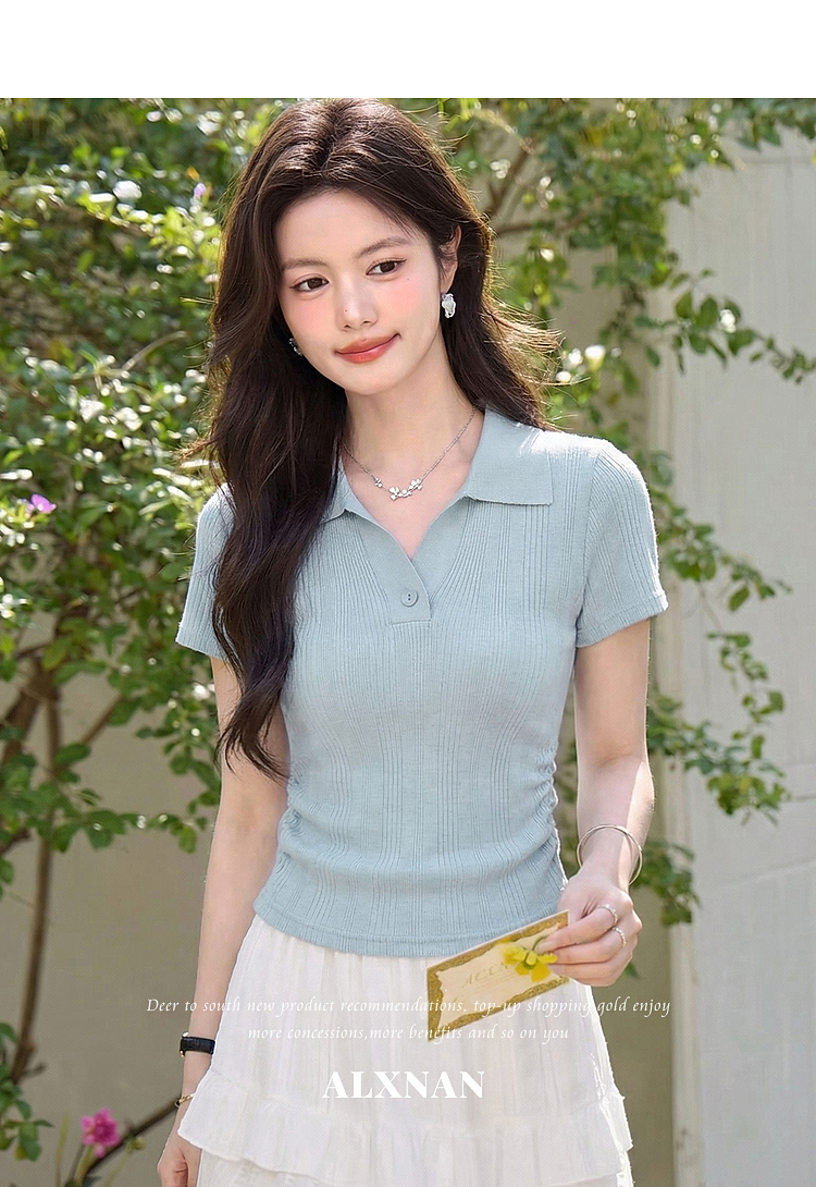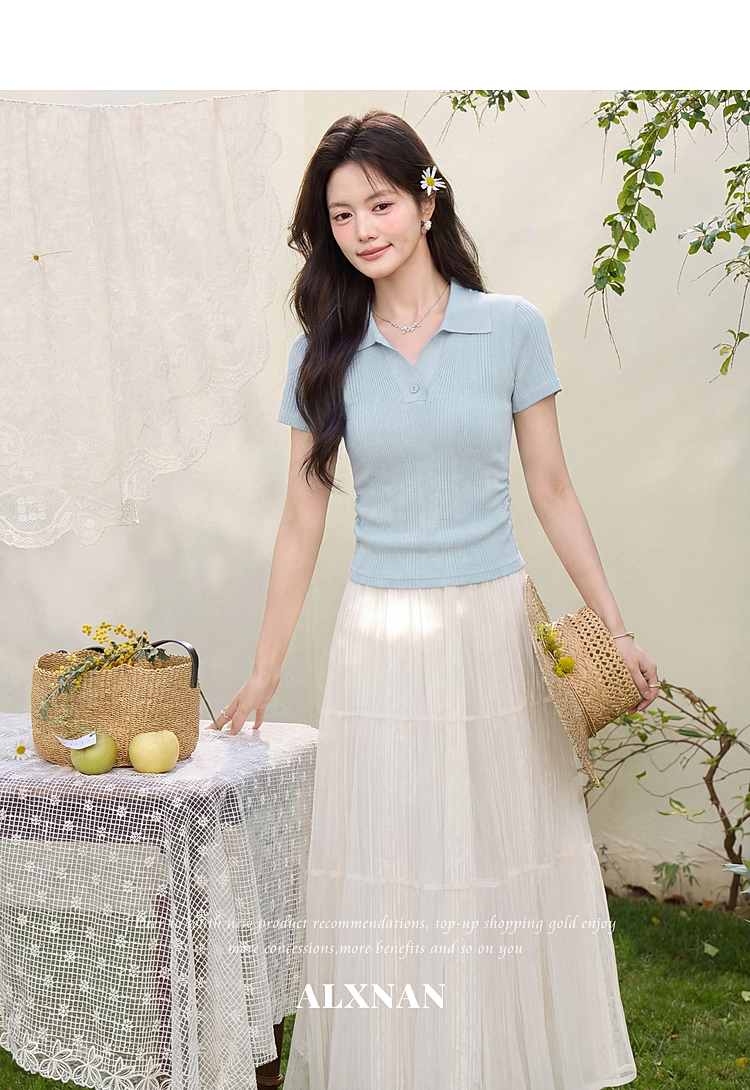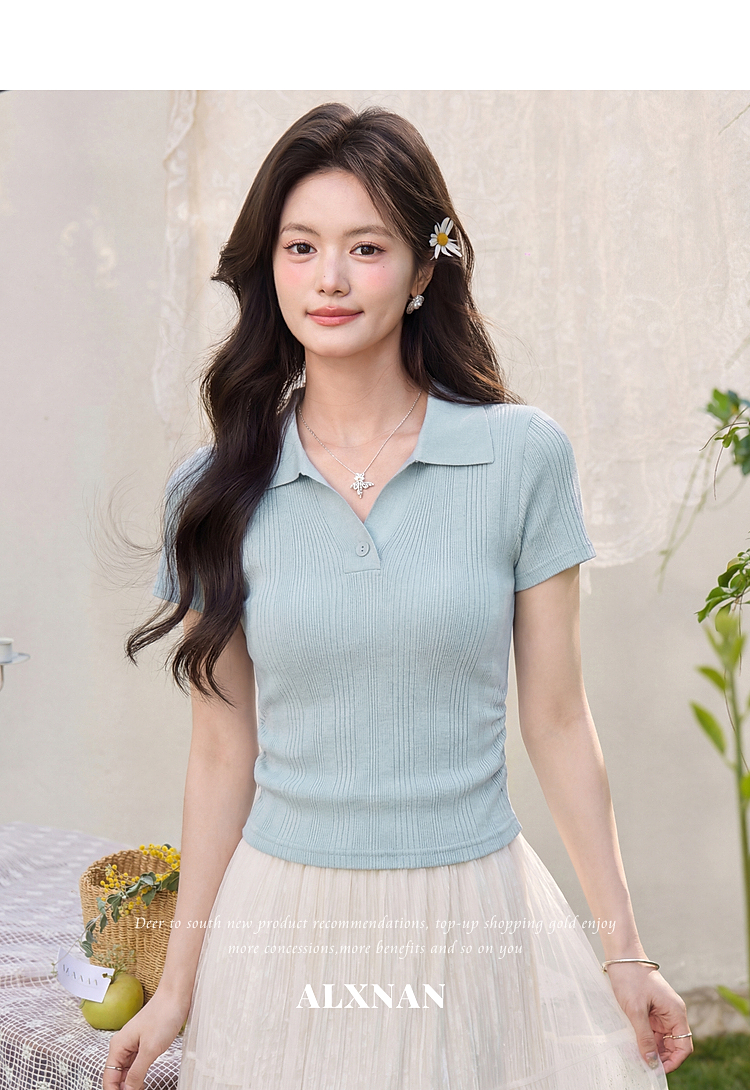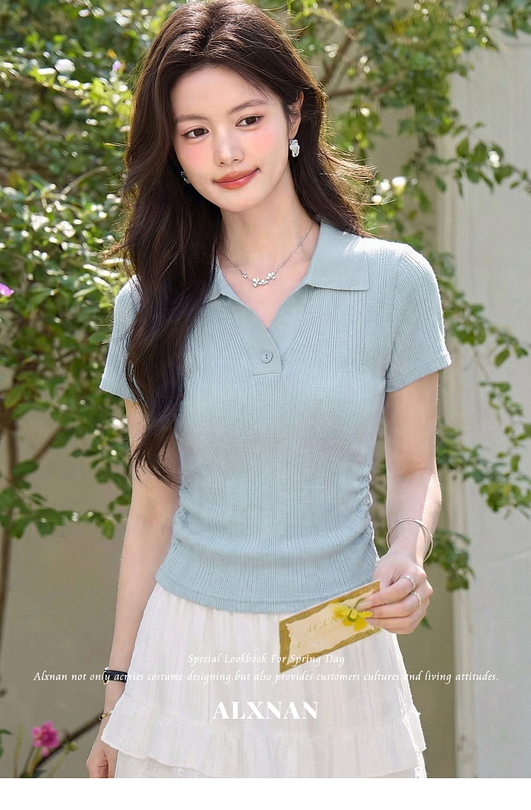 鹿向南「静夏时光」浅蓝色针织衫女夏季新款气质舒适修身短袖上衣