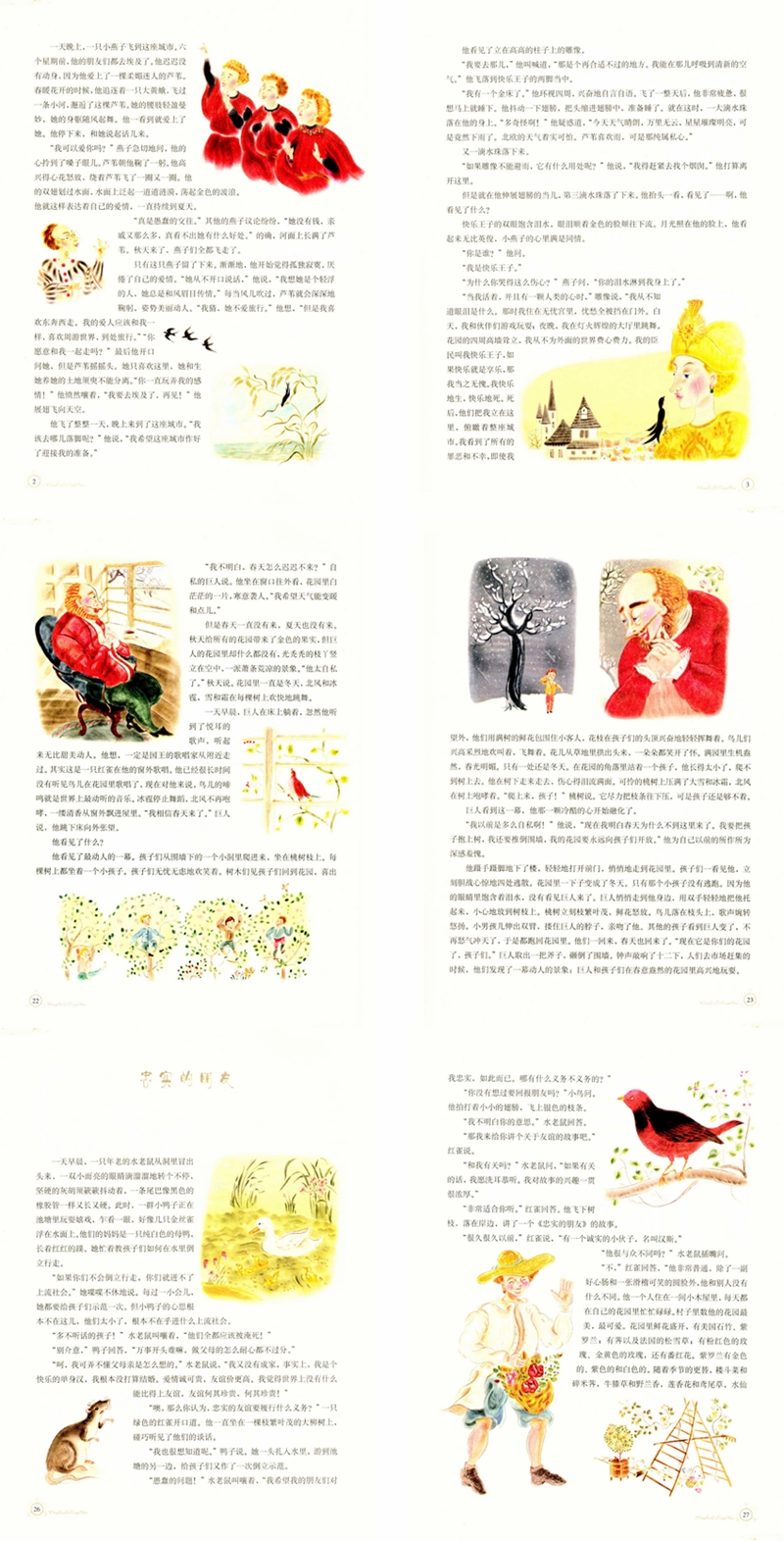 奥斯卡·王尔德是19世纪英国唯美主义运动的创始人和代表作家,他的童话被视为儿童文学的瑰宝,他的如诗如画的风格对后世童话创作有着深远的影响。本书收录了王尔德《快乐王子》等全部9篇童话。《快乐王子》讲述的是快乐王子和小燕子为帮助穷人而牺牲自己的故事。快乐王子活着的时候,在王富里每天都过得非常开心,从不知道忧愁和贫穷是什么。在他死后,被塑成雕像站在城市的上空,却看到了城市中的一切丑恶与苦难。于是,他拜托小燕子把自己身上所有值钱的东西全送给了穷人。后来,小燕子被冻死了,快乐王子也因心碎死去,但他们永远生活在天堂中了。