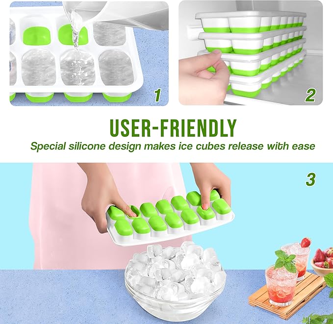 坚固耐用:我们的冰格由硅胶和PP材料制成,足够坚固,能承受长期低温保存而不易损坏。不再担心轻易崩溃。此外,我们的硅胶底部足够柔软,可以轻松释放冰块,因此不再需要扭转,这使得冰格更加耐用。