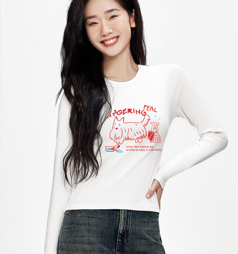 「棉的美学」萌趣小狗长袖打底印花T恤女慵懒休闲风日常百搭上衣