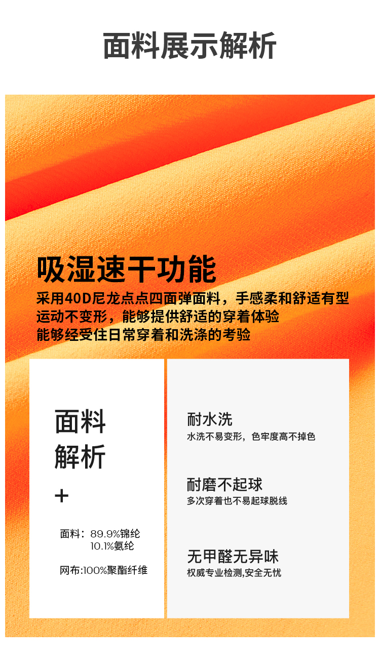 采用40D尼龙点点四面弹面料,手感柔和,舒适有型,运动不变形,能够提供舒适的穿着体验。面料具有吸湿速干功能,能够经受住日常穿着和洗涤的考验