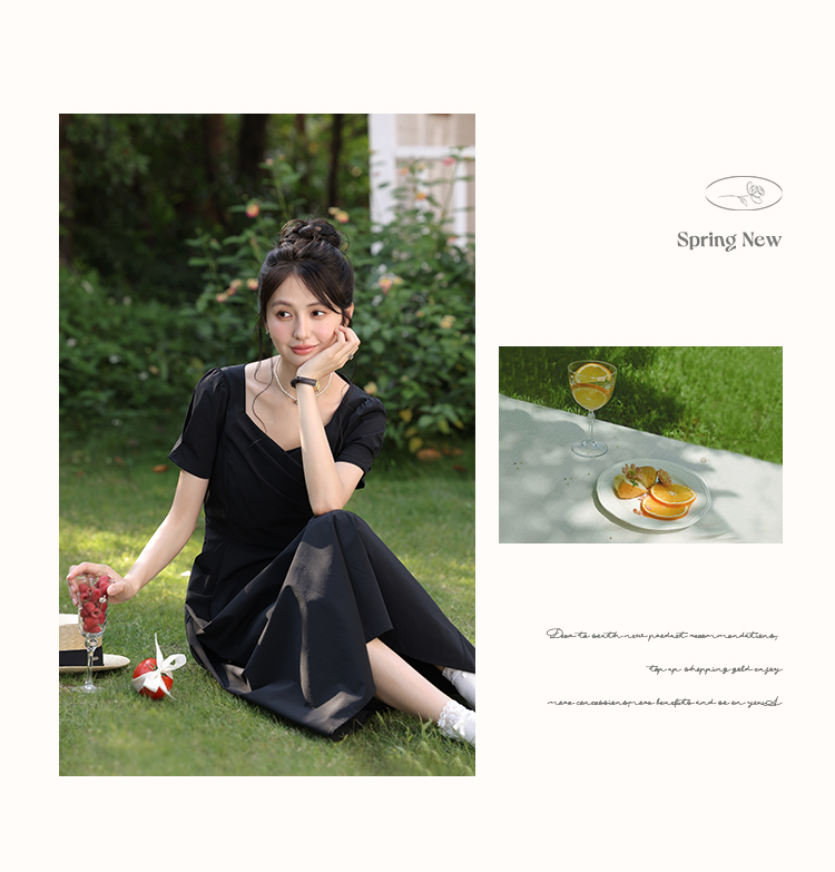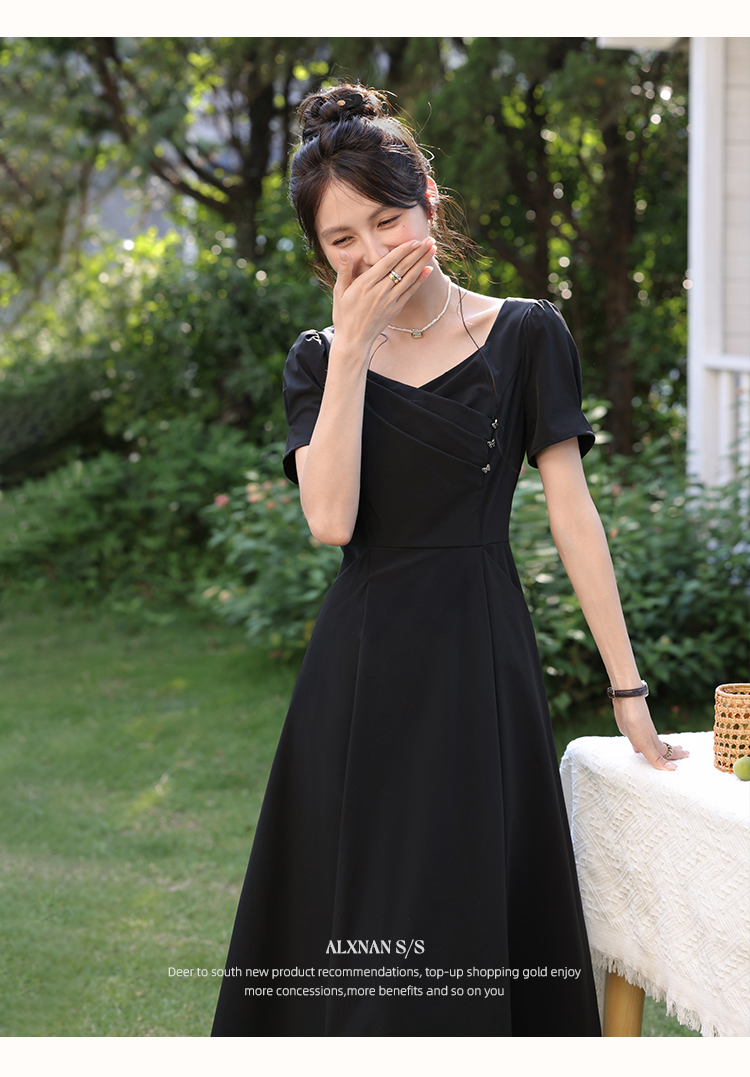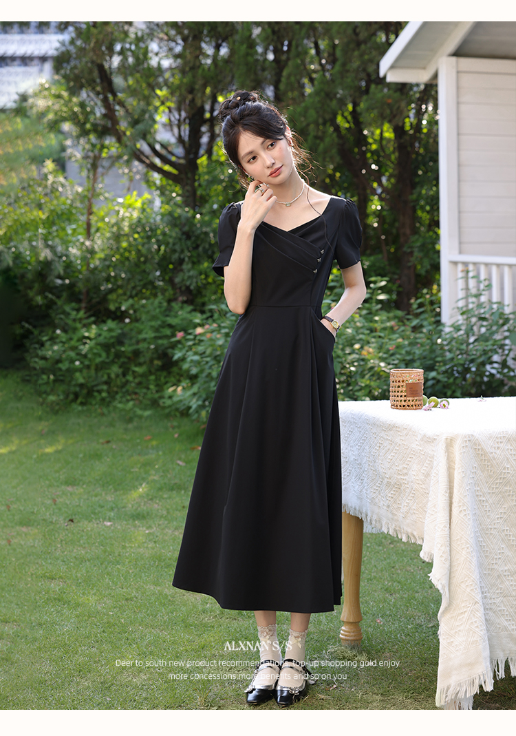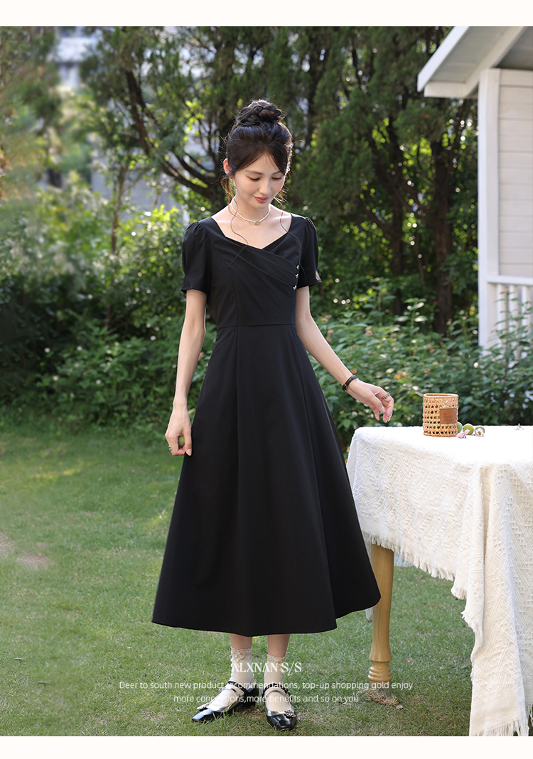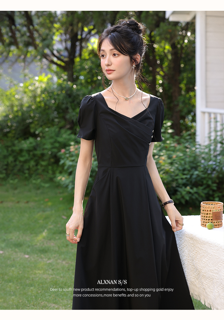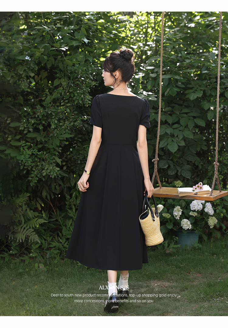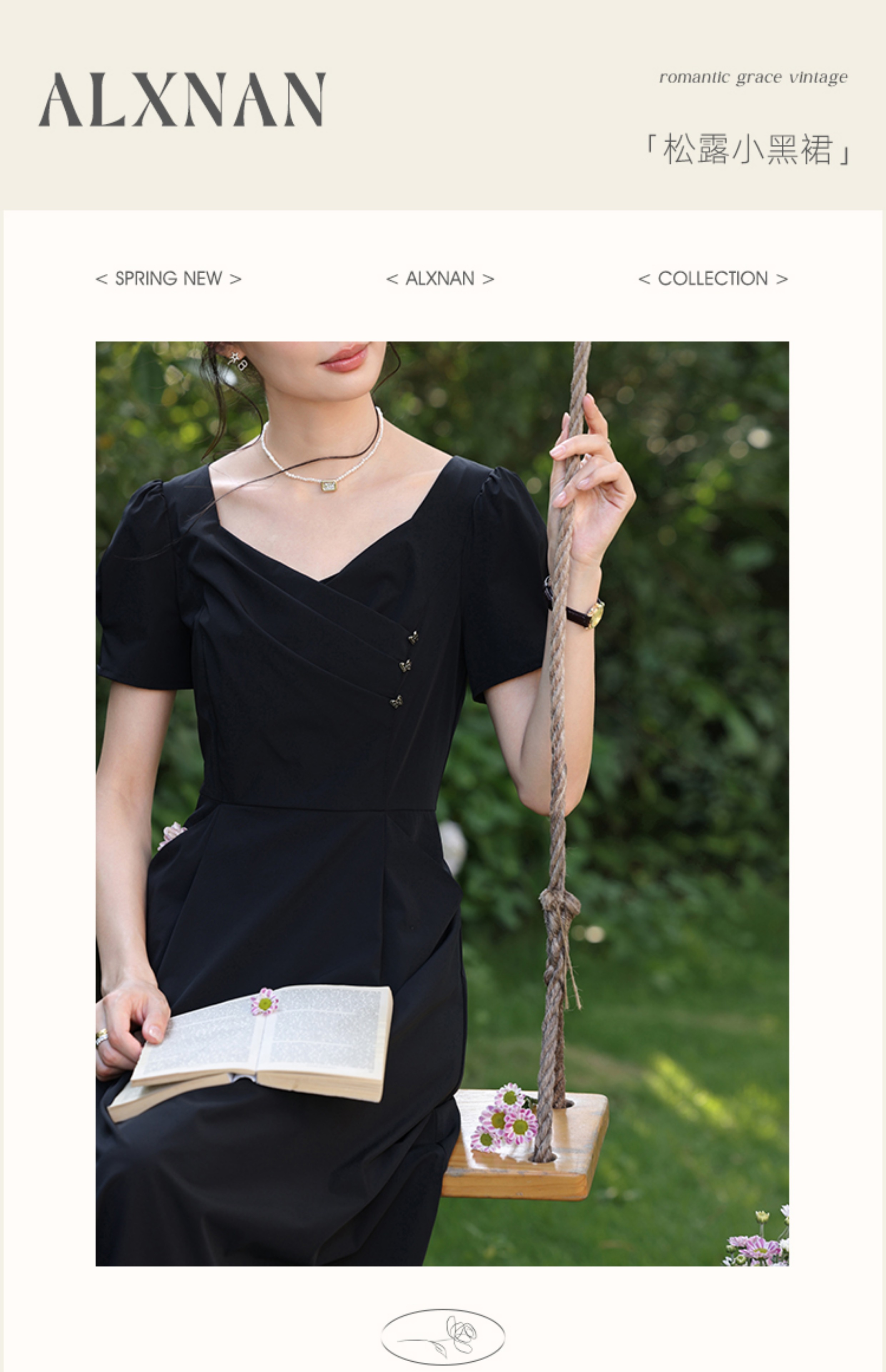 【6折秒杀】鹿向南「松露黑裙」法式气质黑色短袖连衣裙女夏A字收腰显瘦长裙L55861
