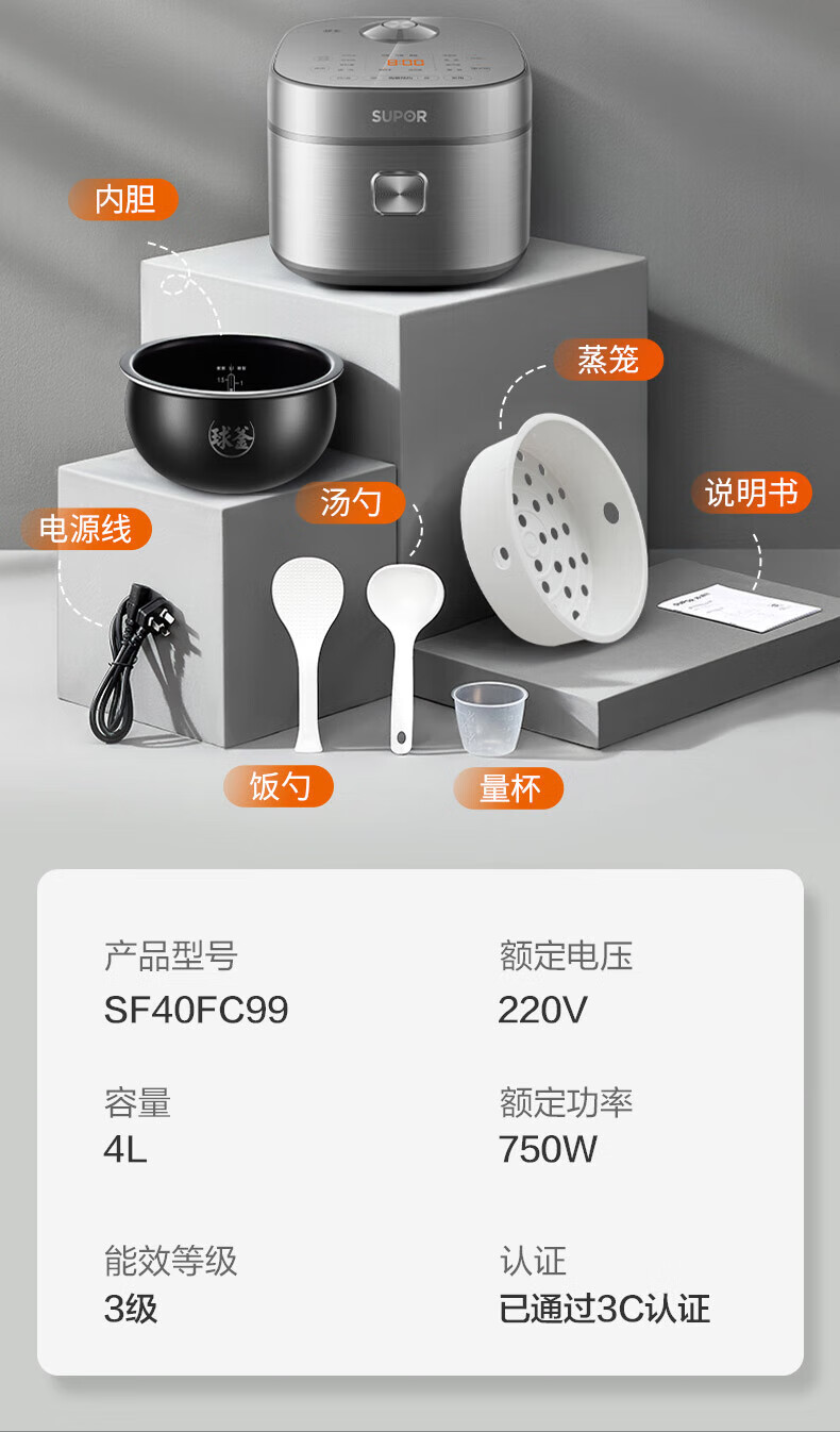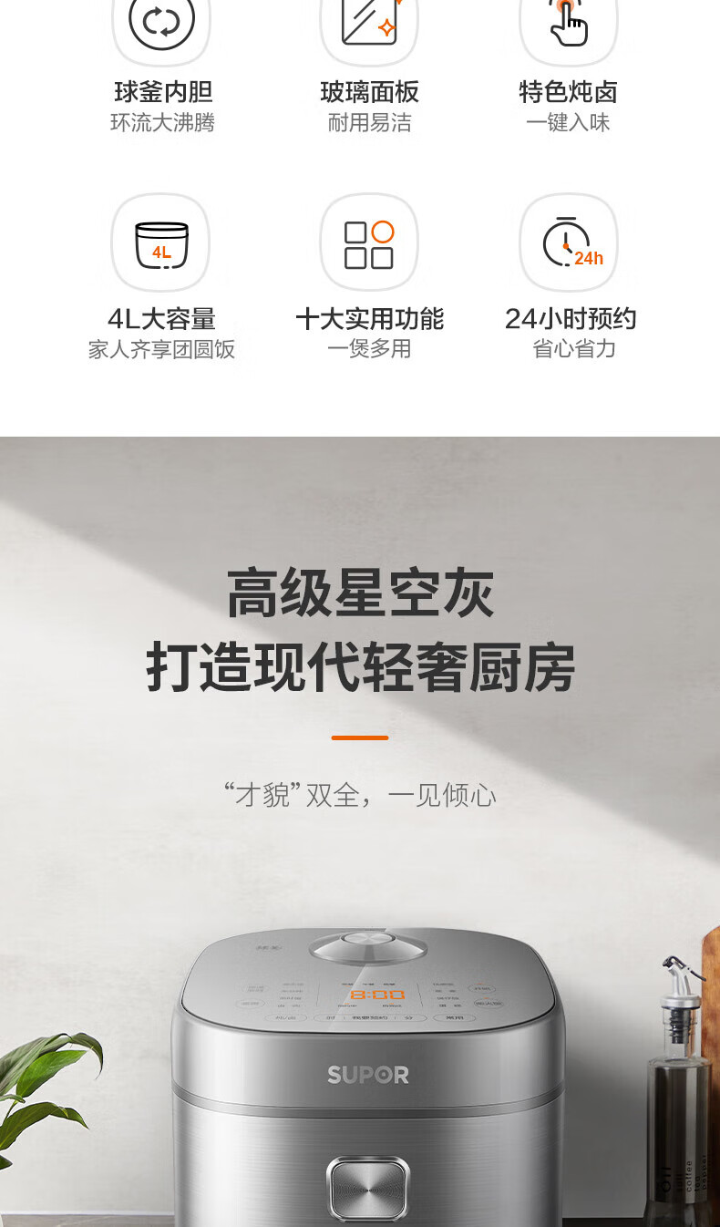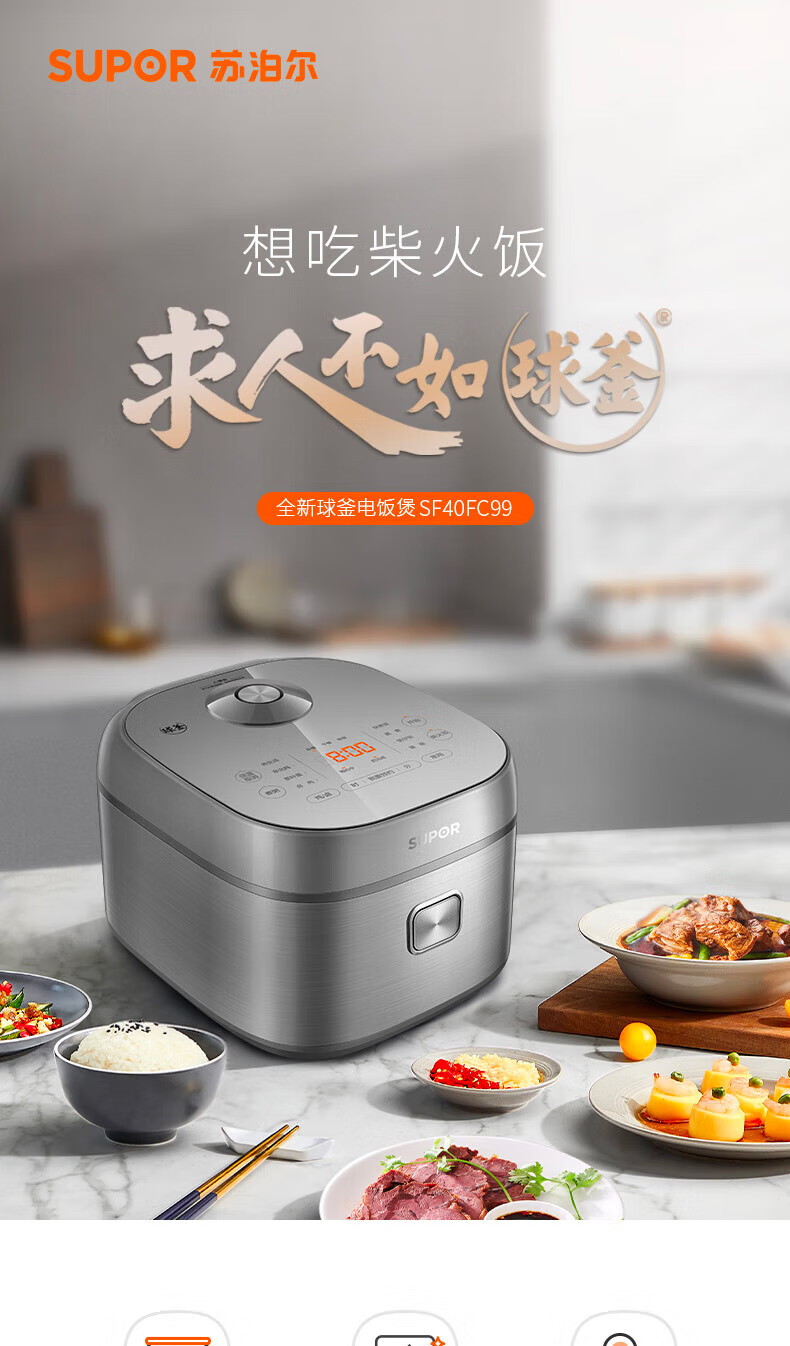 苏泊尔(SUPOR)电饭煲4L家用球型厚釜多功能智能预约2-8人大容量柴火饭煮饭锅 SF40FC99