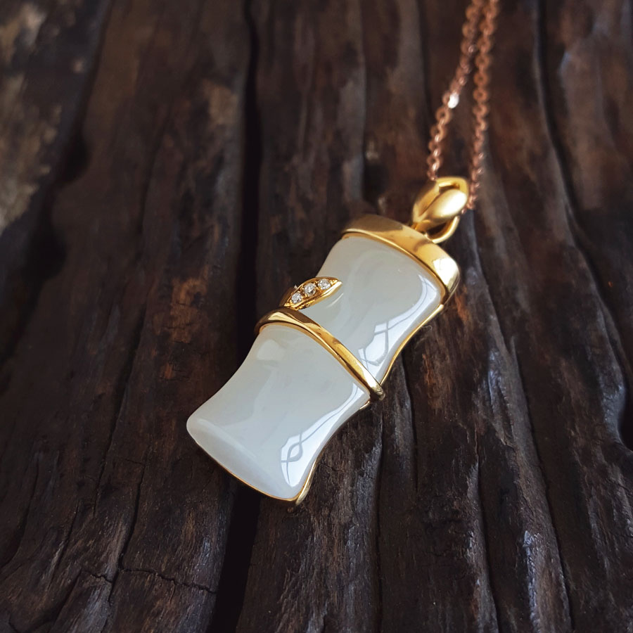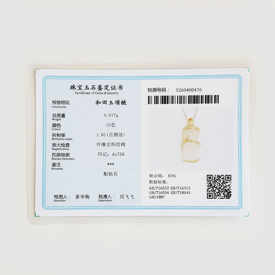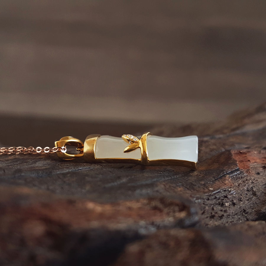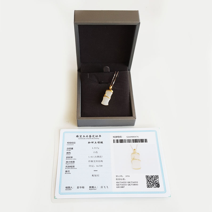 名称 | 老凤祥AU750黄金镶钻镶天然青海料细腻竹节造型和田玉吊坠项链 |