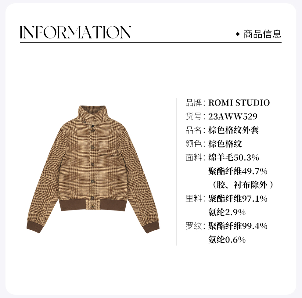 ROMI STUDIO“old money”精纺羊毛短款立领格纹夹克外套23AWW529