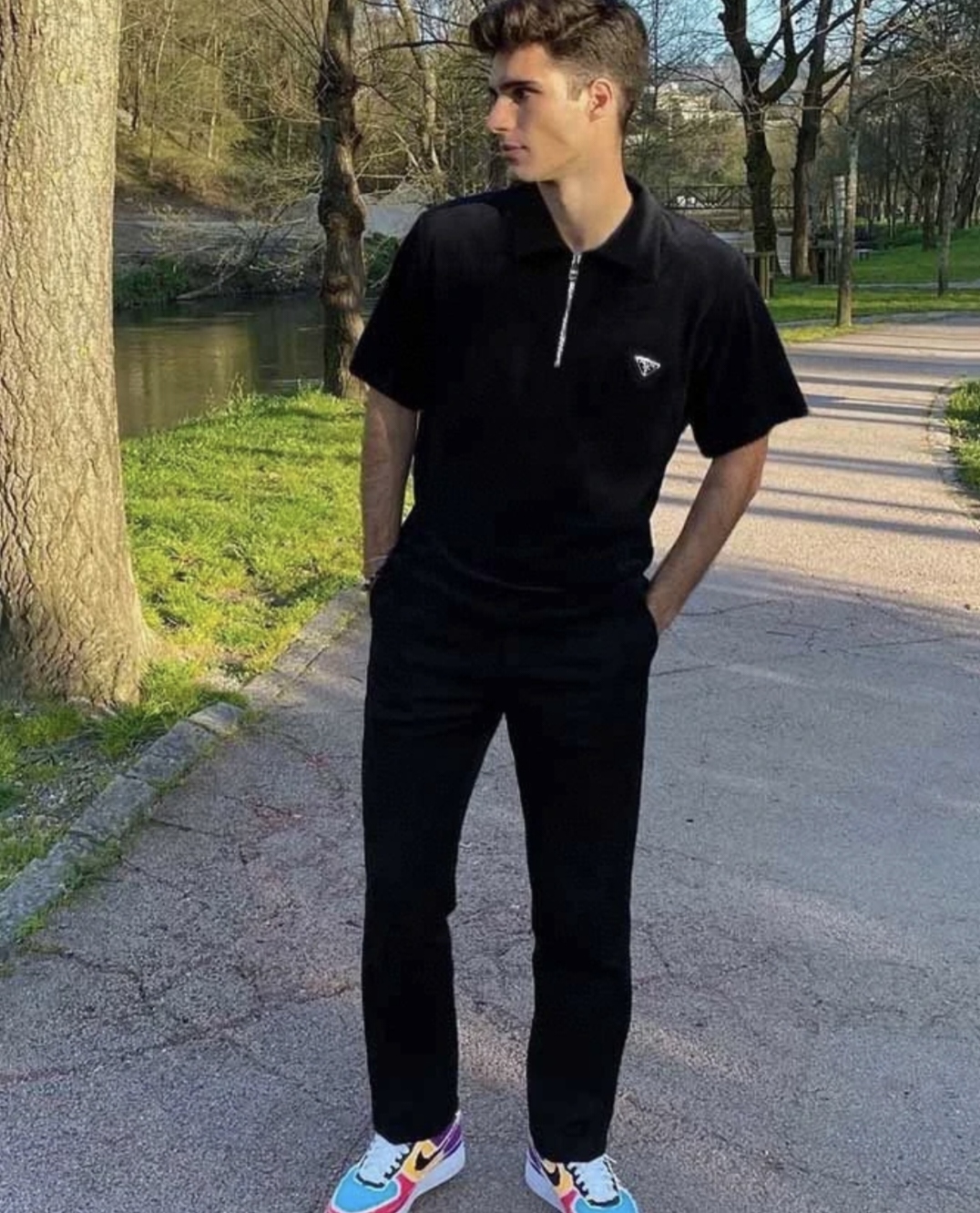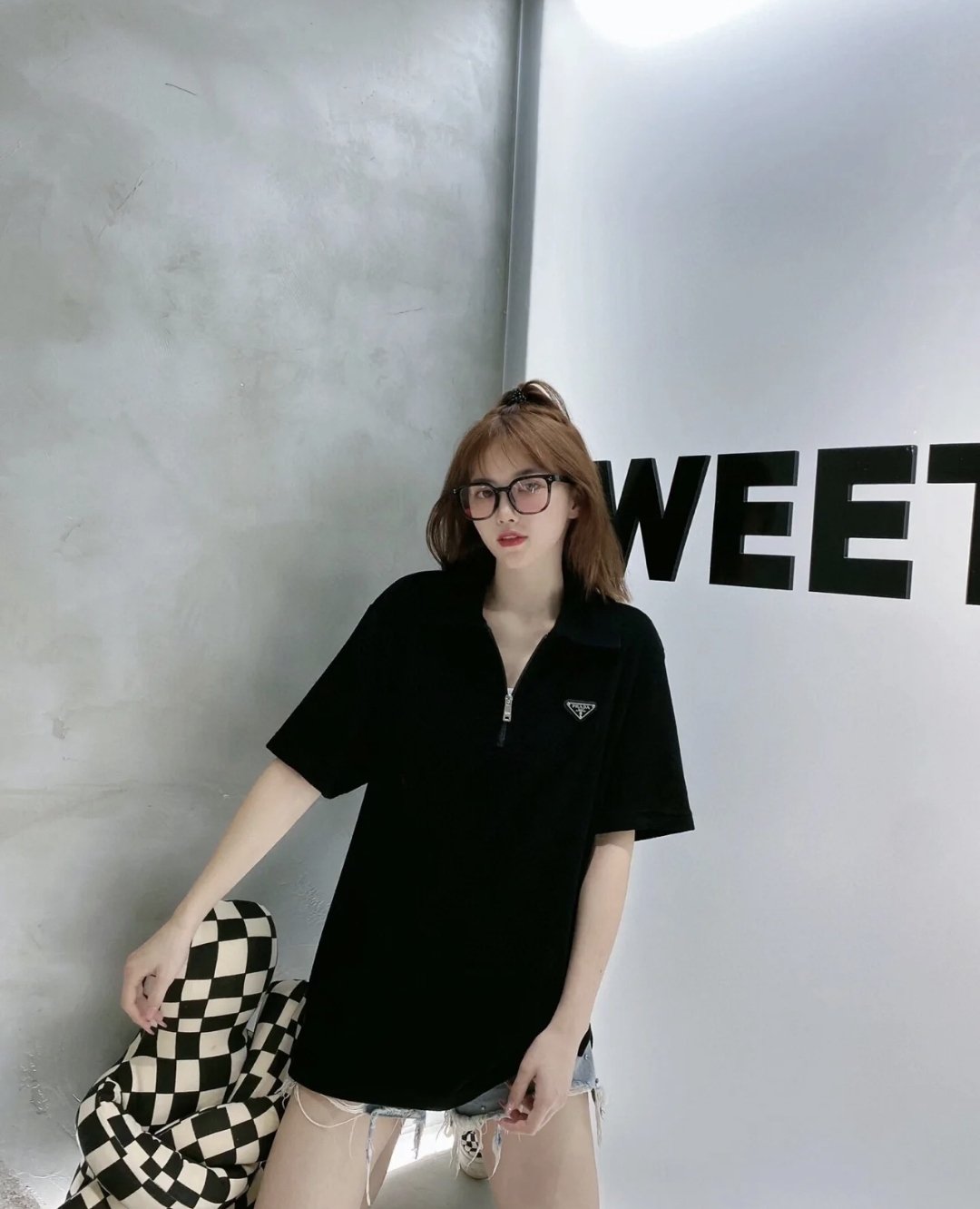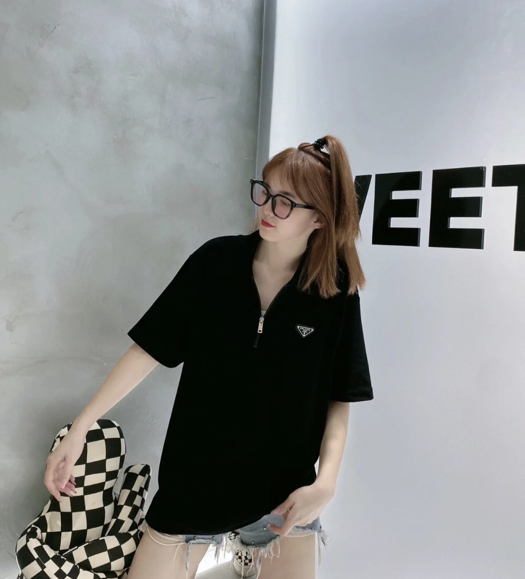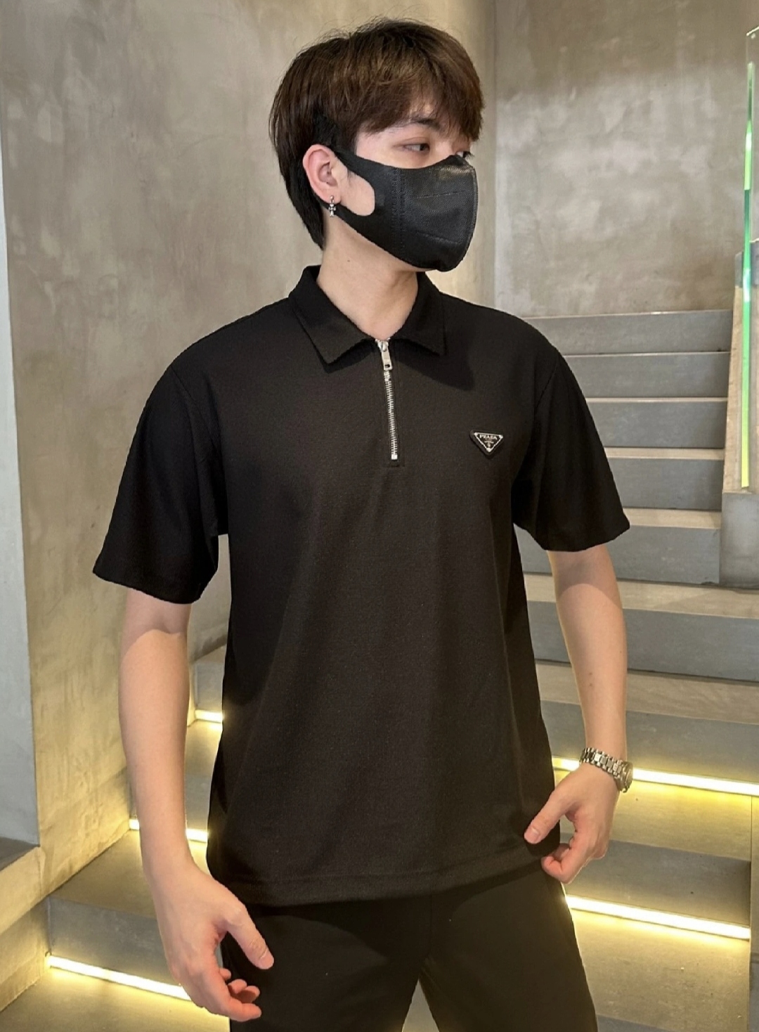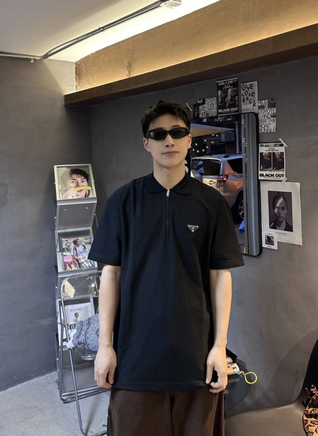 PRADA半拉链三角标polo衫‼️整件衣服7600购买ZP拆解打造,定制黑色珠地棉面料,做到100%全棉进口纱线,定制标志性罗纹polo领, 袖口 下摆双层高密度走线,开模定制字母logo拉链,拉链处采用再生尼龙面料,胸前开模定制最新三角标,真正做到1:1copy 闭眼入 码数:S M L XL