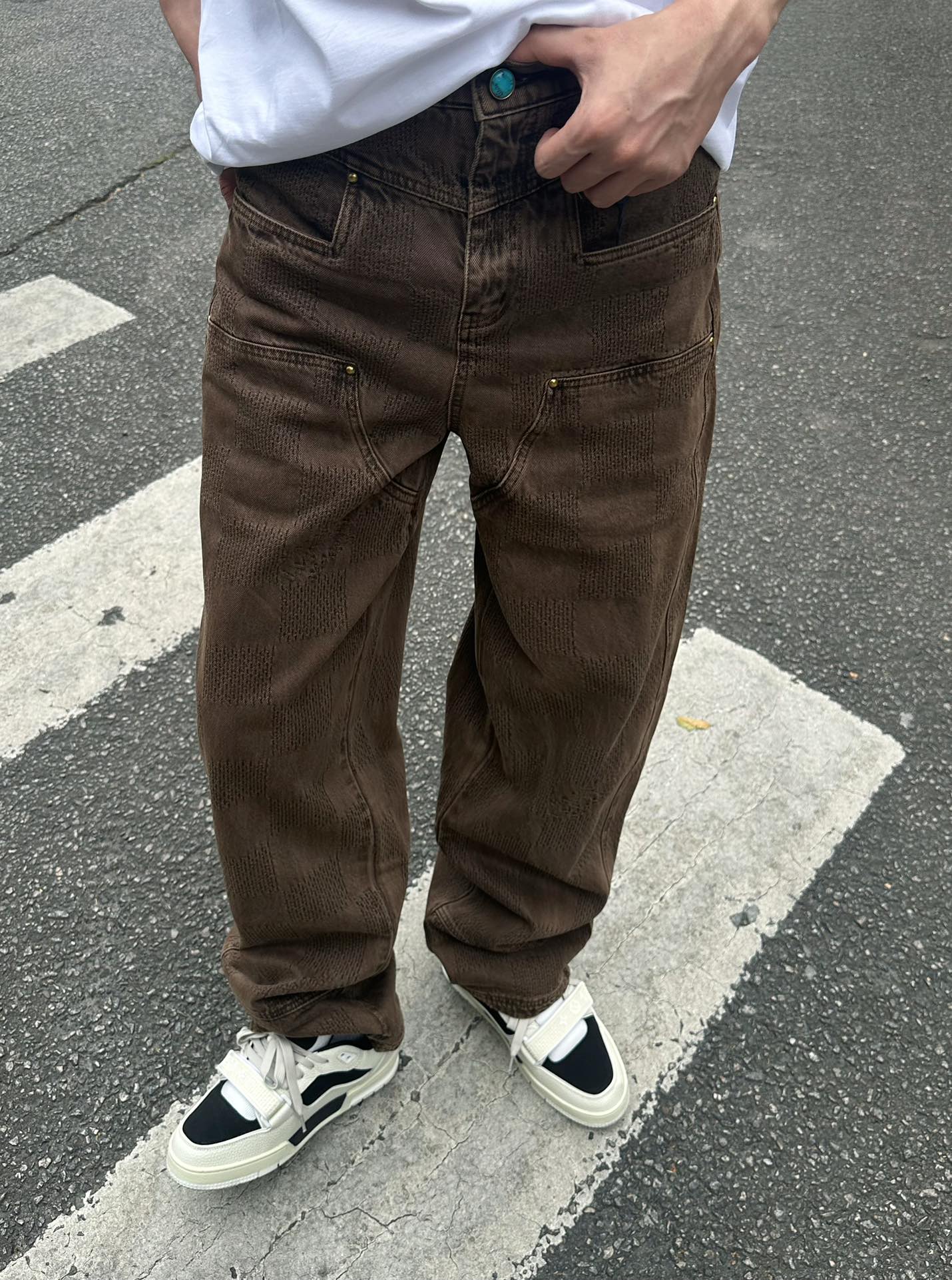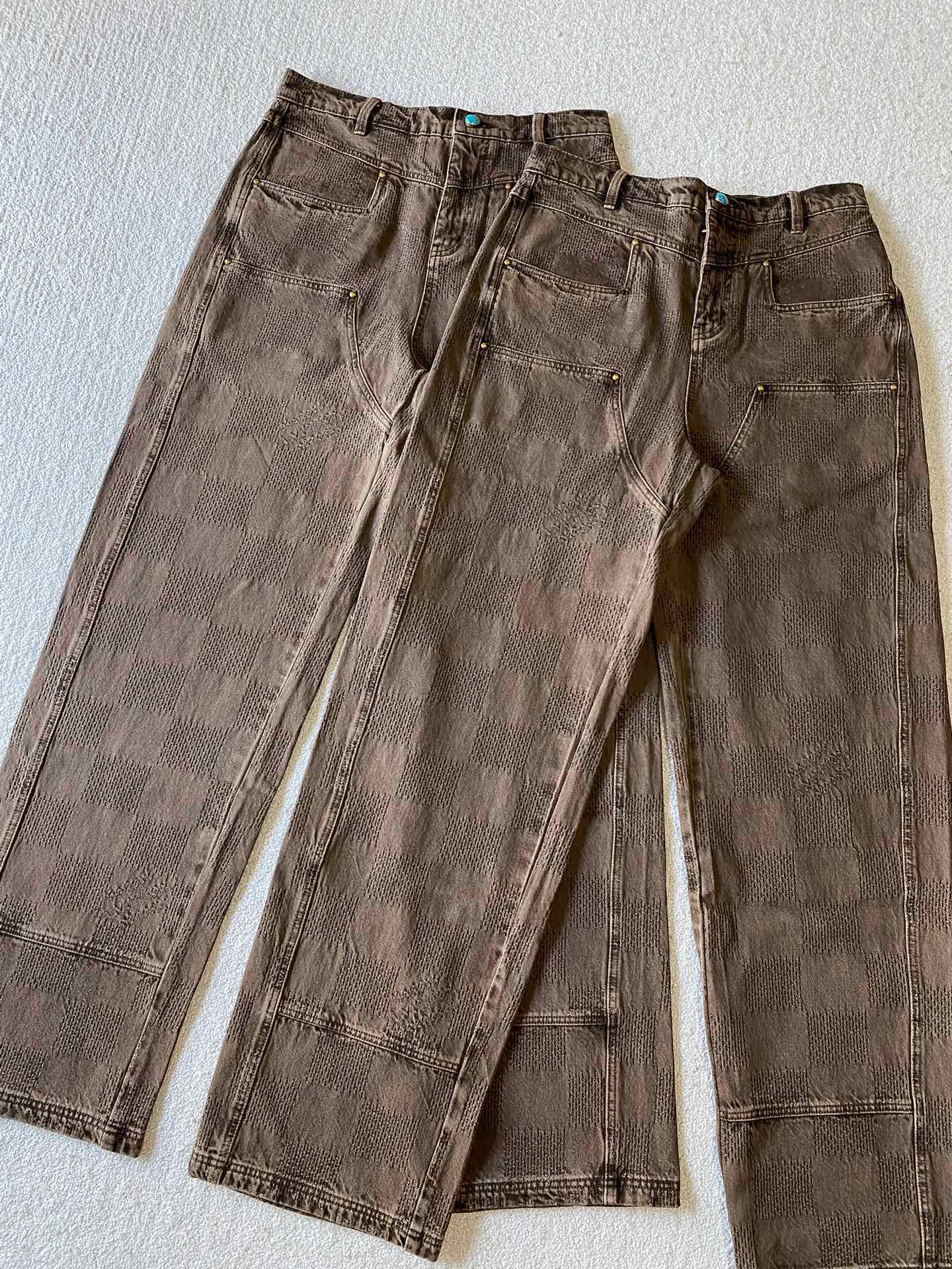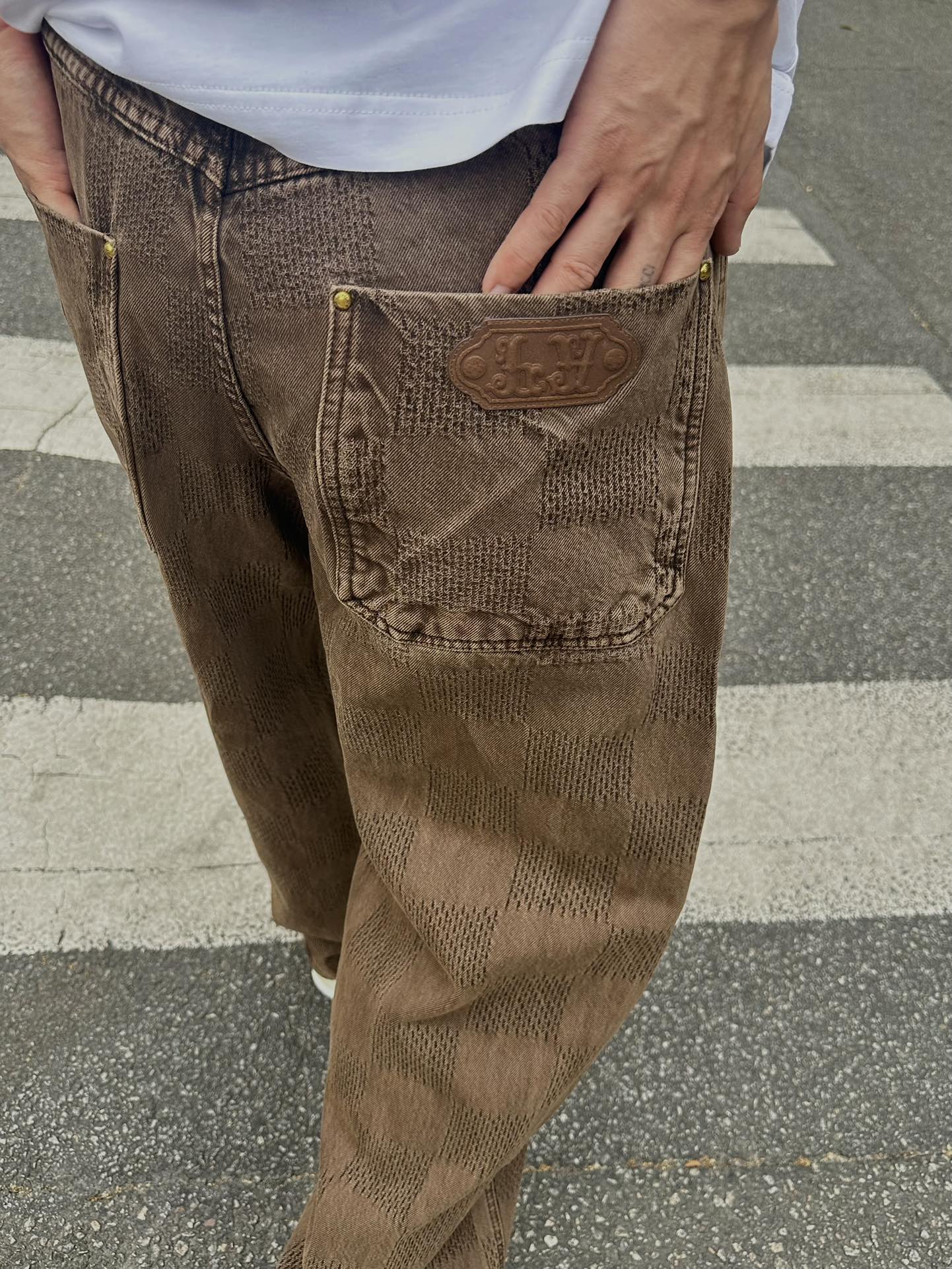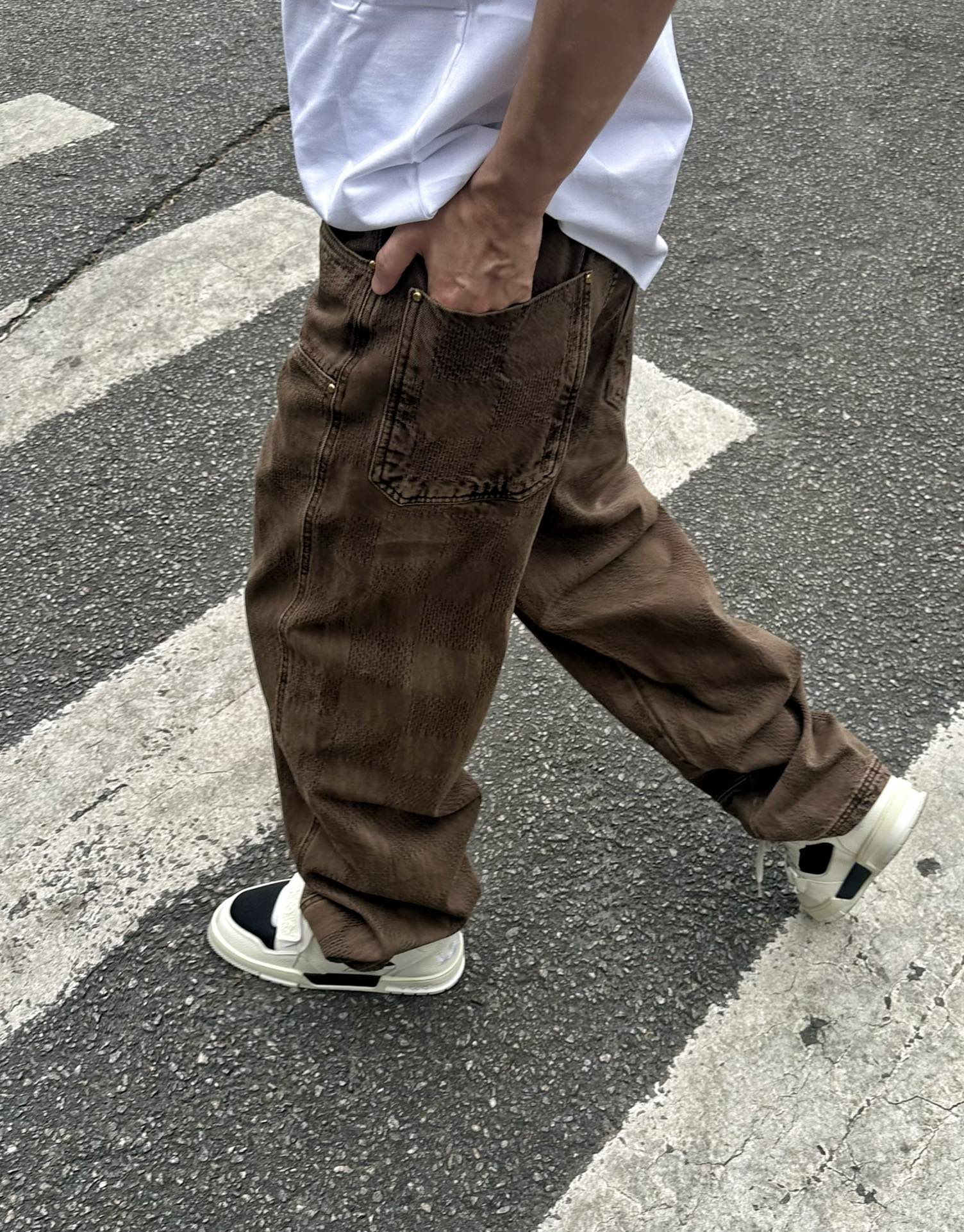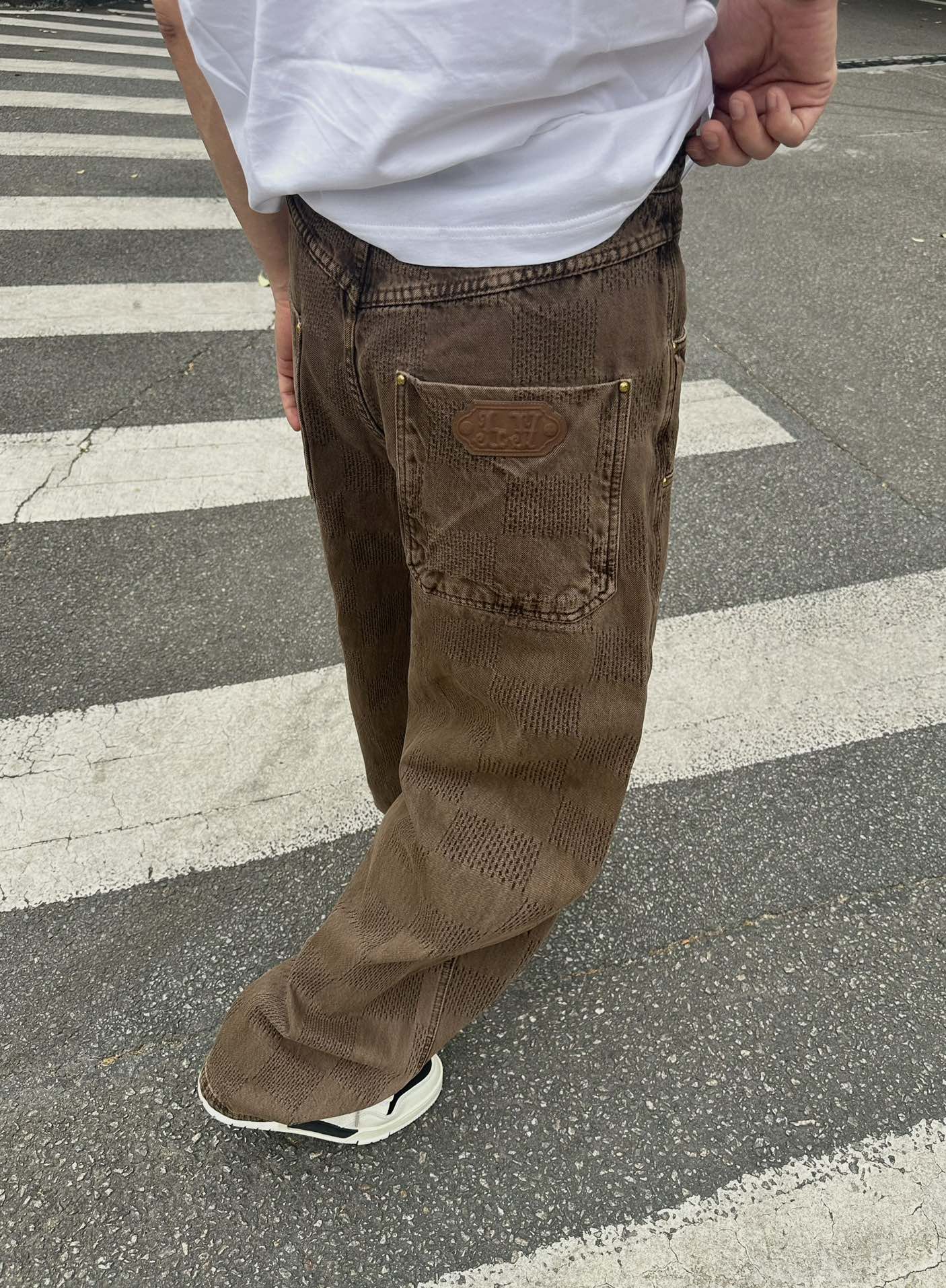 驴家 棕棋盘牛仔直筒长裤(JN)