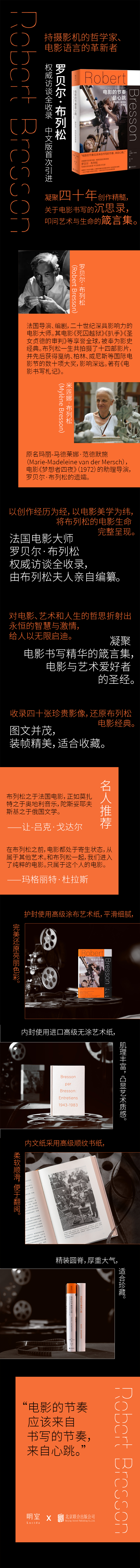 1.二十世纪法国电影大师、电影语言的变革者。罗贝尔·布列松是横跨整个二十世纪的电影传奇,以其极简主义的电影语言和独树一帜的美学革新电影艺术,受到戈达尔、塔可夫斯基等大师的一致推崇,也深受巴赞、桑塔格、杜拉斯等大家的喜爱。布列松一生仅留下十四部电影作品,但他创造了众多影史经典,屡次获得国际电影节大奖,影响深远。 2.罗贝尔·布列松权威访谈全收录,凝聚四十年创作精华的箴言集,电影与艺术爱好者的圣经。本书收录布列松在四十余年的电影生涯中参与的重要谈话,由布列松遗孀米莲娜·布列松亲自整理编纂。布列松在其中谈论电影创作、文学改编、电影声带等,阐释他独特的电影美学。字字箴言充满激情与智慧,凝聚着他对电影、艺术和人生的哲思。对想追随布列松脚步的电影人、想探求大师艺术生命的电影艺术爱好者来说,书中闪烁的思想将给予启迪。 3.收录四十张珍贵影像,还原布列松电影经典,精美装帧设计适合收藏。本书收录四十张布列松经典影像,包括布列松电影剧照、拍摄现场工作照、电影节海报等。装帧由著名设计师山川操刀,带来审美享受。护封使用电影《温柔女子》片场工作照,尽显秩序与美感。