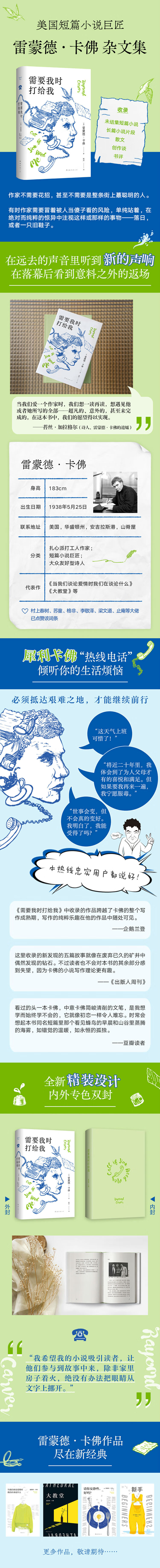 《需要我时打给我》是雷蒙德·卡佛杂文集,收录作者生前未结集短篇小说、长篇小说片段、散文等,全面而立体地呈现出卡佛的文学生涯:不仅仅是一个短篇小说家,还是书评人、文学理论家、散文家、创意写作教师。