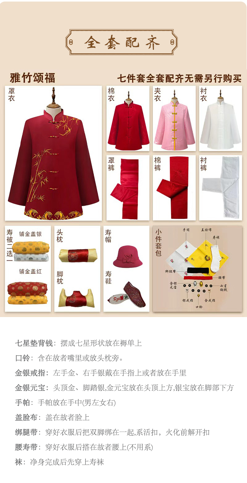 男士薄款织锦唐装金色福团6件套寿衣寿服套装