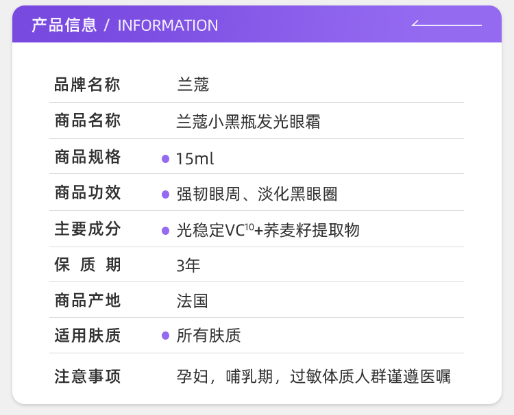 兰蔻小黑瓶发光眼霜 保湿滋润修护淡纹抗初老15ml(注:美妆为特殊商品,下单后不支持退货)