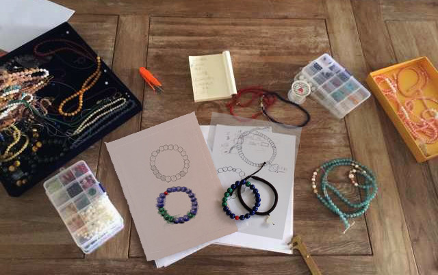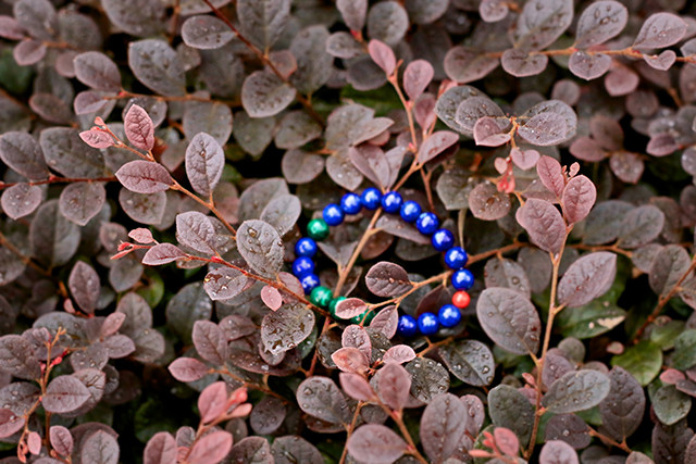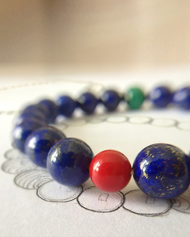 串好这条链子后,间断地戴了将半年来体会它的能量,才推荐出来——先用阿富汗青金石来提升洞察力,再精挑赞比亚孔雀石来对应“四绿木”,最后将台湾过来的辰砂(朱砂)珠子点缀当中,要的是水(蓝色青金石)——木(绿色孔雀石)——火(红色的朱砂)整个磁场循环起来,果然带来了很好的提升作用。