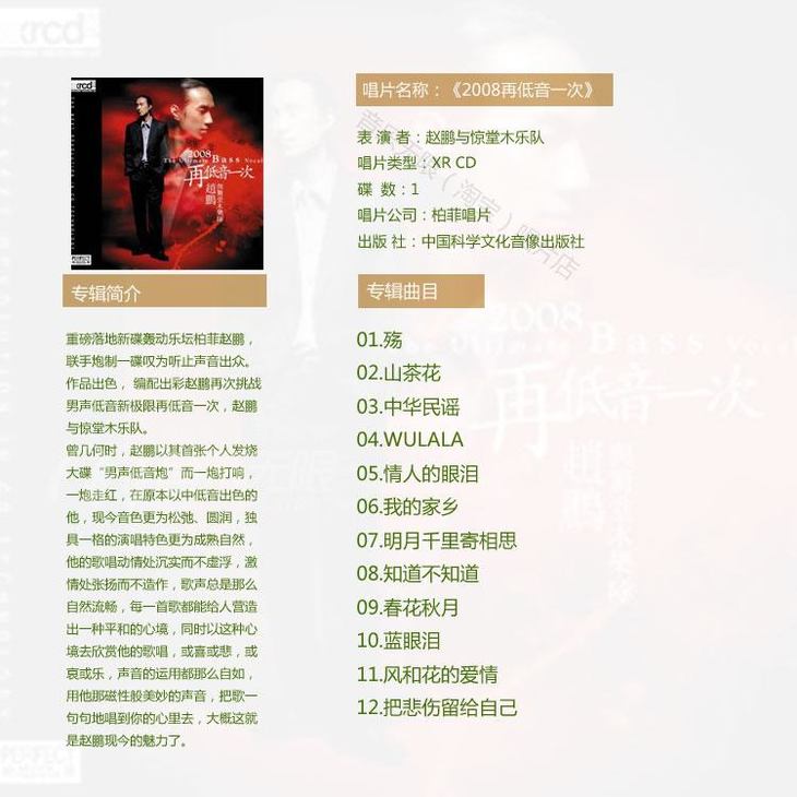 柏菲正品 经典发烧男声 男低音 赵鹏 《2008再低音一次》CD
