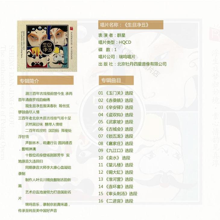 瑞鸣正品 京剧戏曲选段《生旦净丑》HQCD