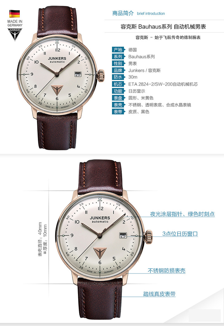 Junkers容克斯德国原产包豪斯系列机械男士腕表(瑞士ETA机械机芯)