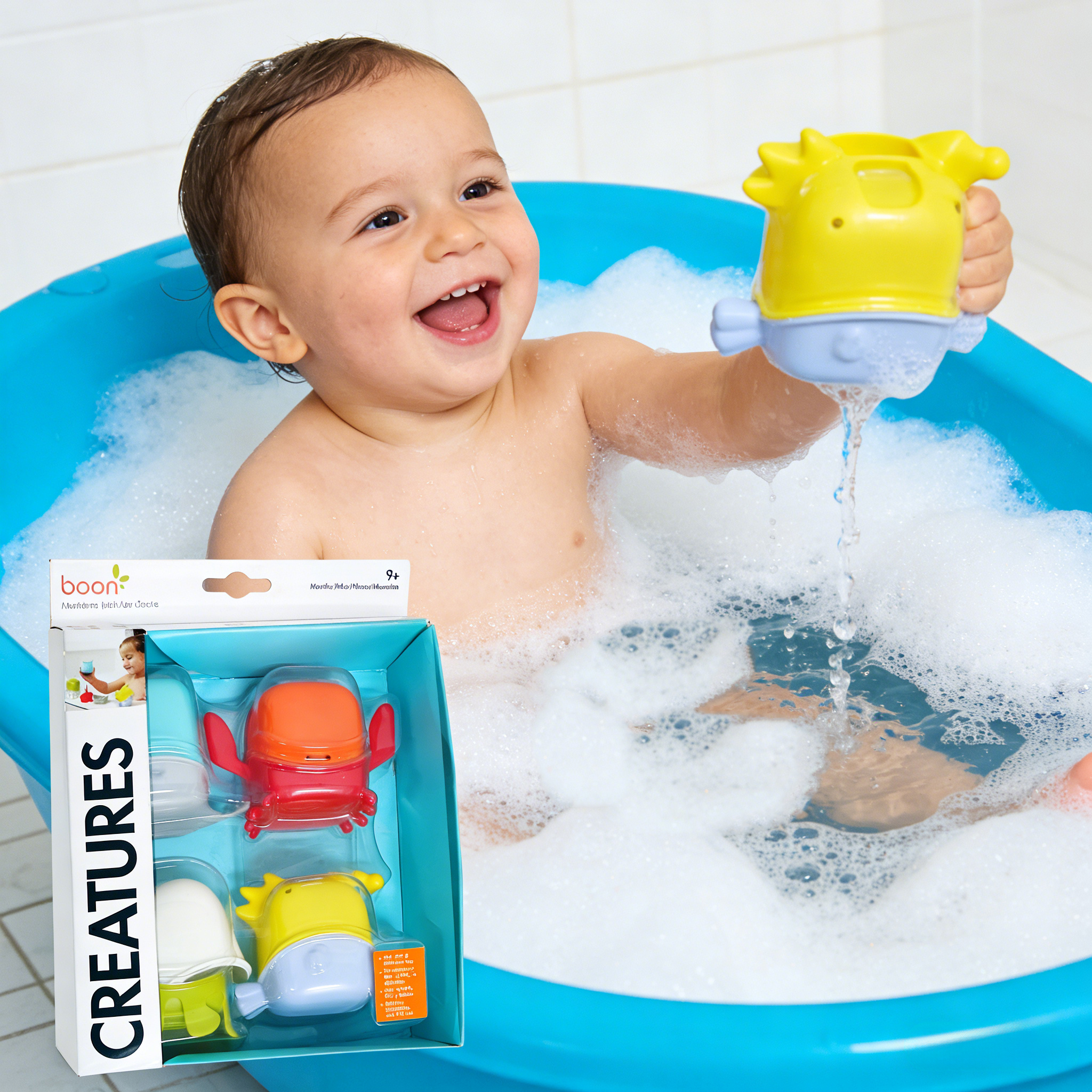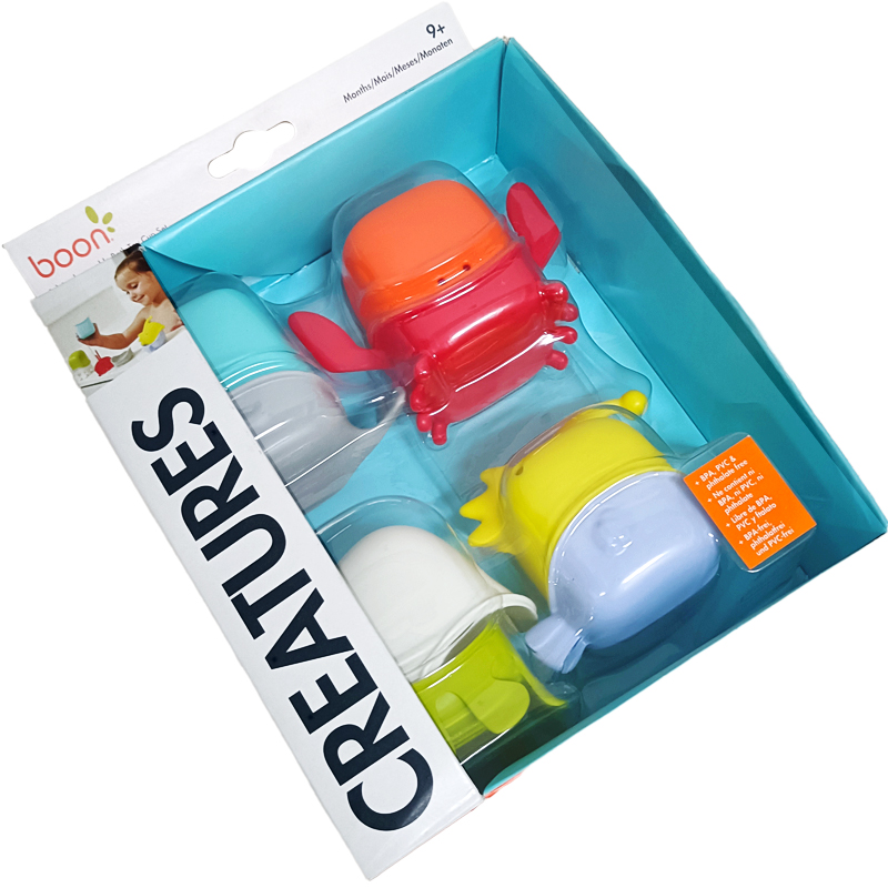 这套来自Boon的洗澡玩具,包含4个可爱的海洋小动物玩具杯——章鱼、小鱼、海豚、小鲸鱼,每一个都软萌有趣,宝宝一眼就会爱上~
