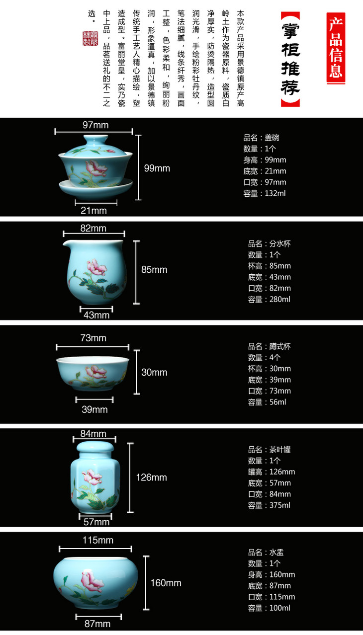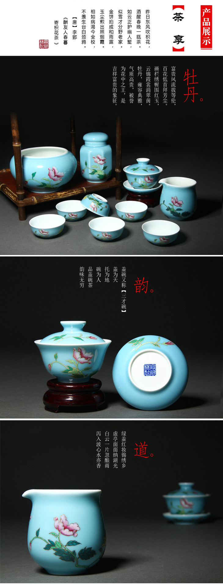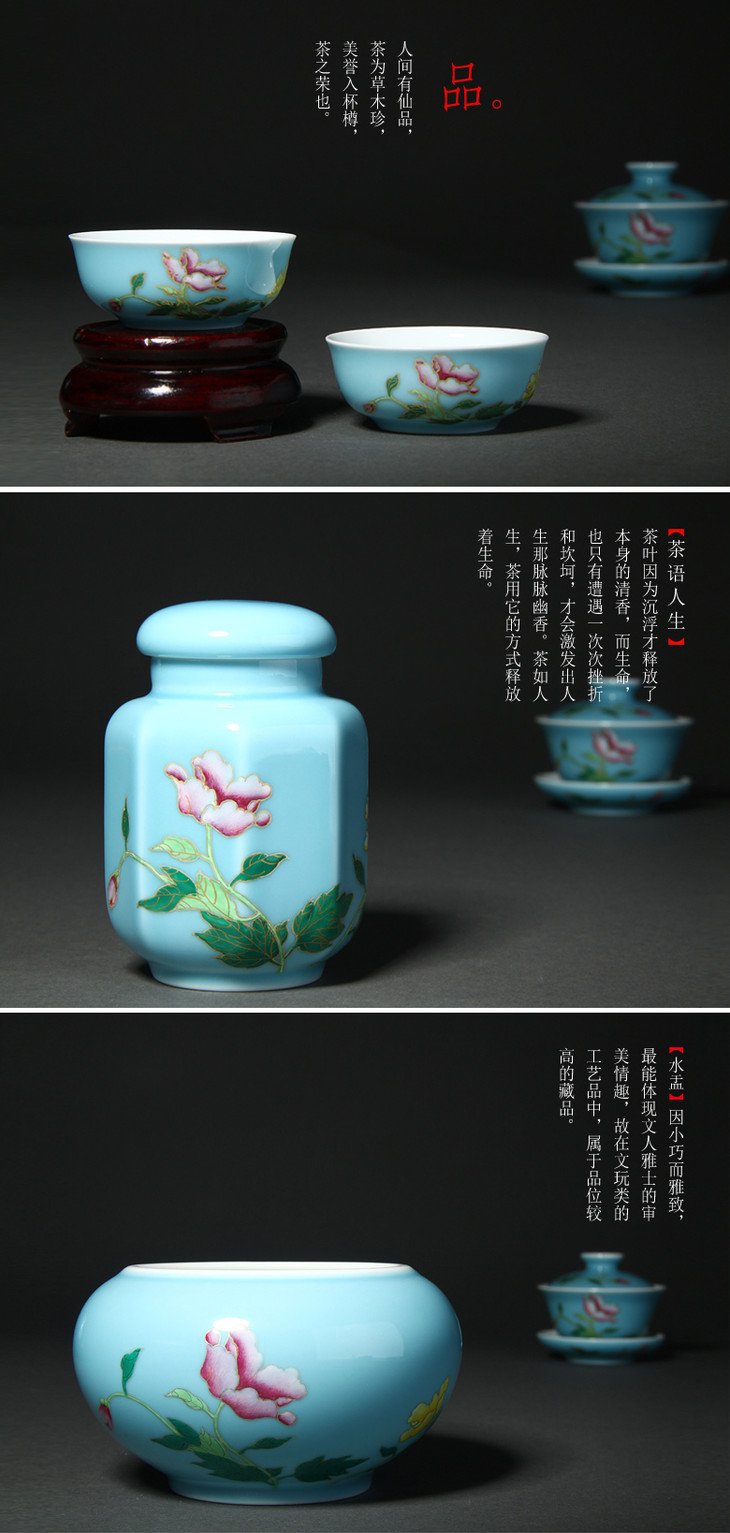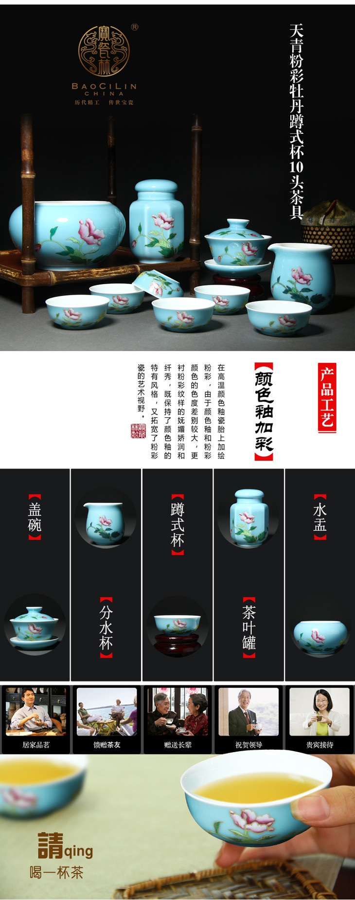 【宝瓷林】天青粉彩牡丹蹲式杯10头茶具