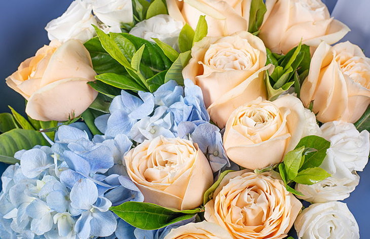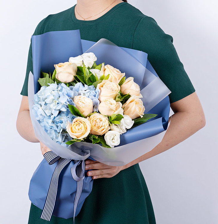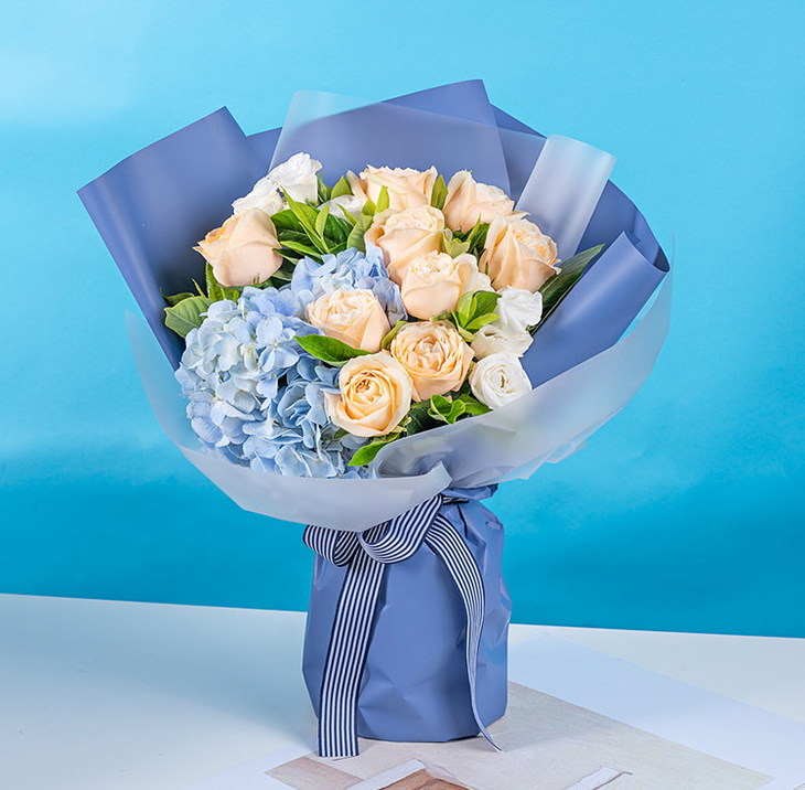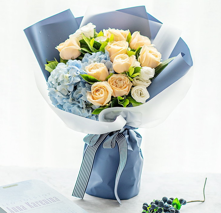蓝绣球1枝,香槟玫瑰9枝,白色洋桔梗2枝,栀子叶10枝