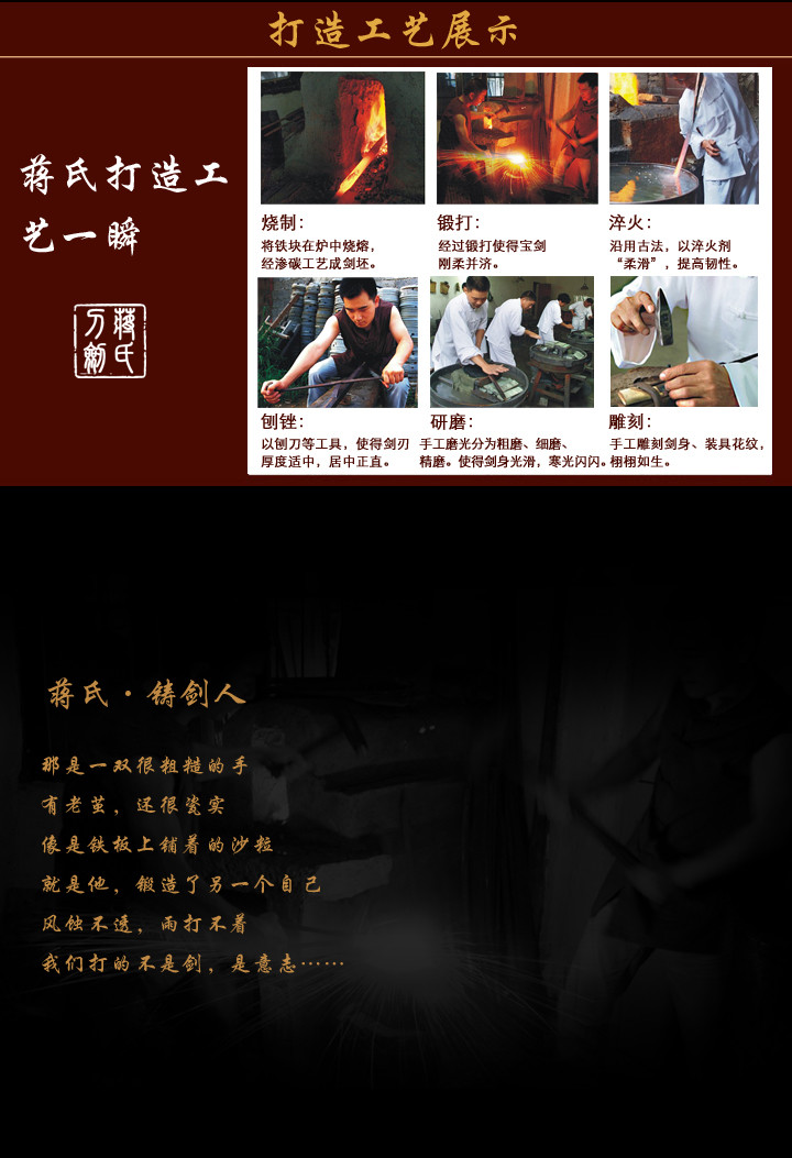 浙江蒋氏刀剑有限公司坐落在风光优美的中国宝剑之都龙泉市,是生产刀、剑及武术器械的专业性企业,是龙泉市刀剑行业的重点龙头企业。