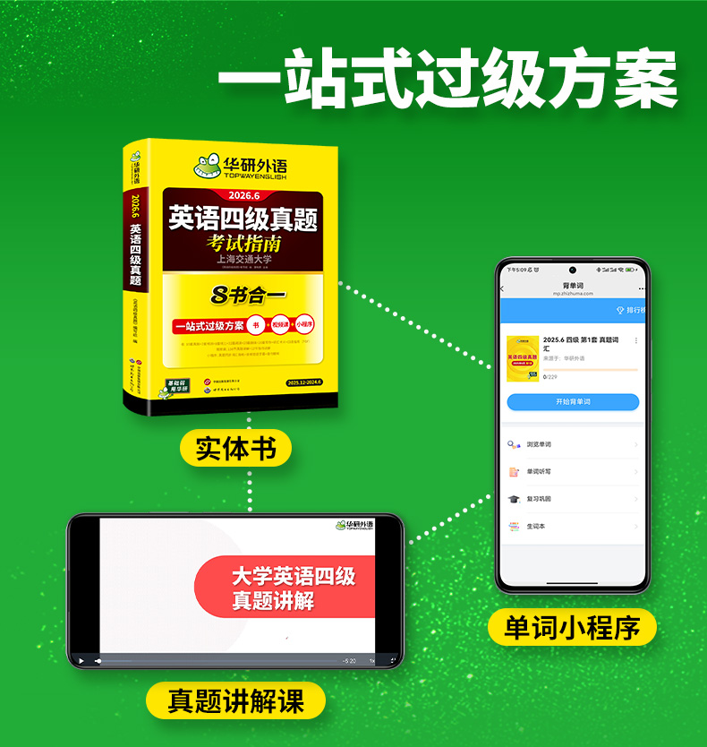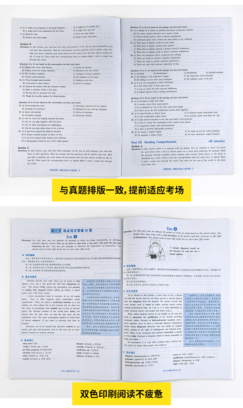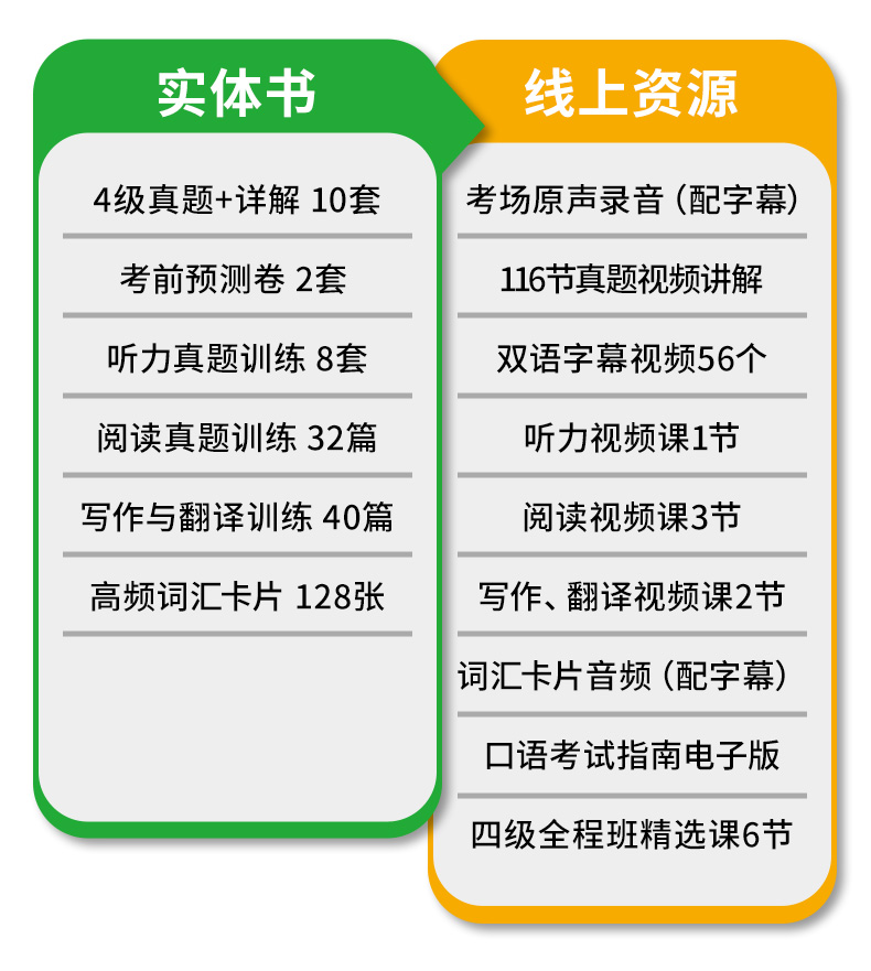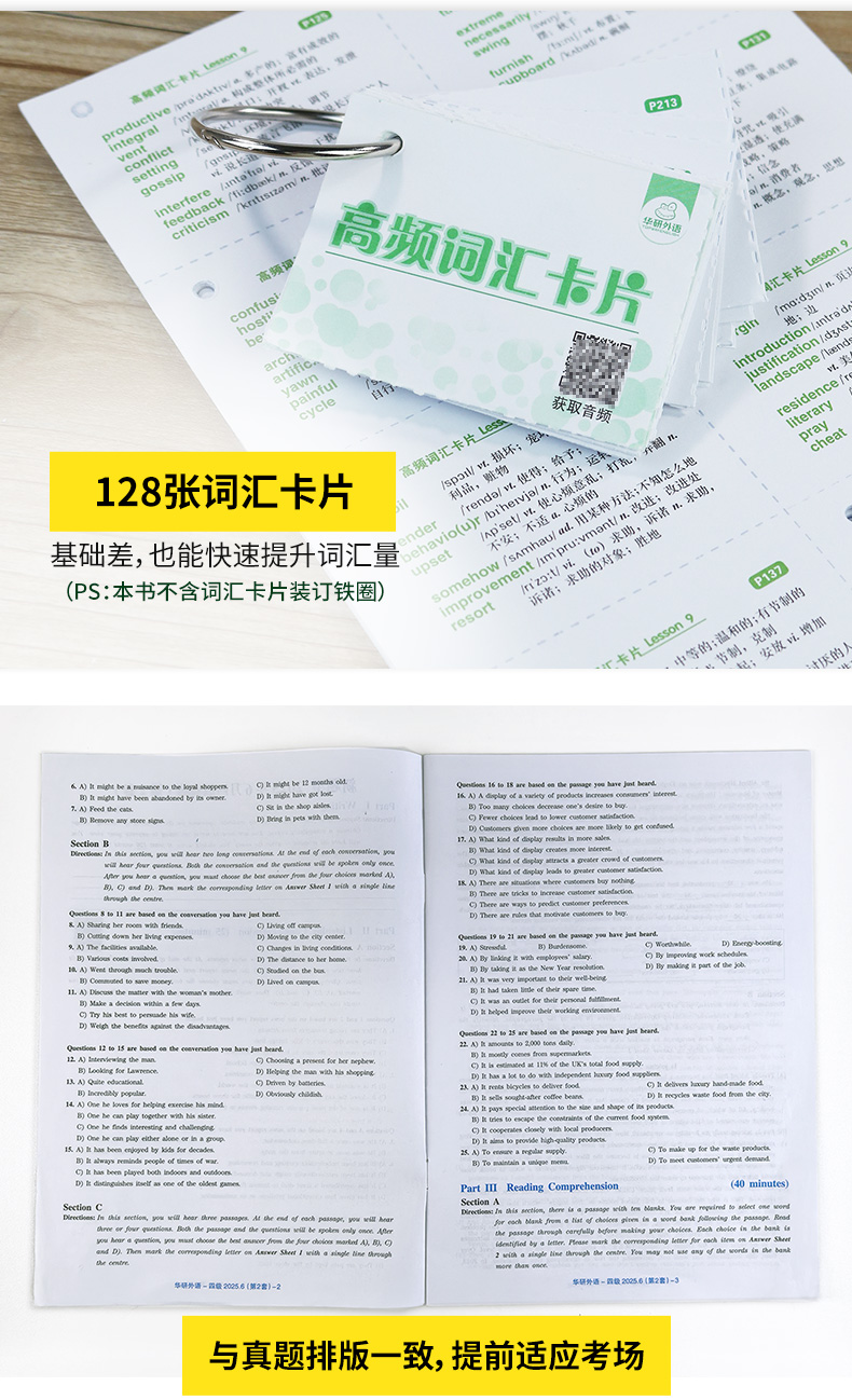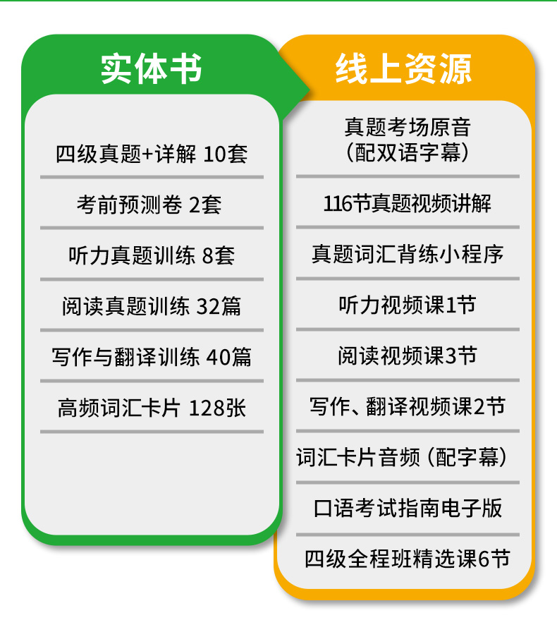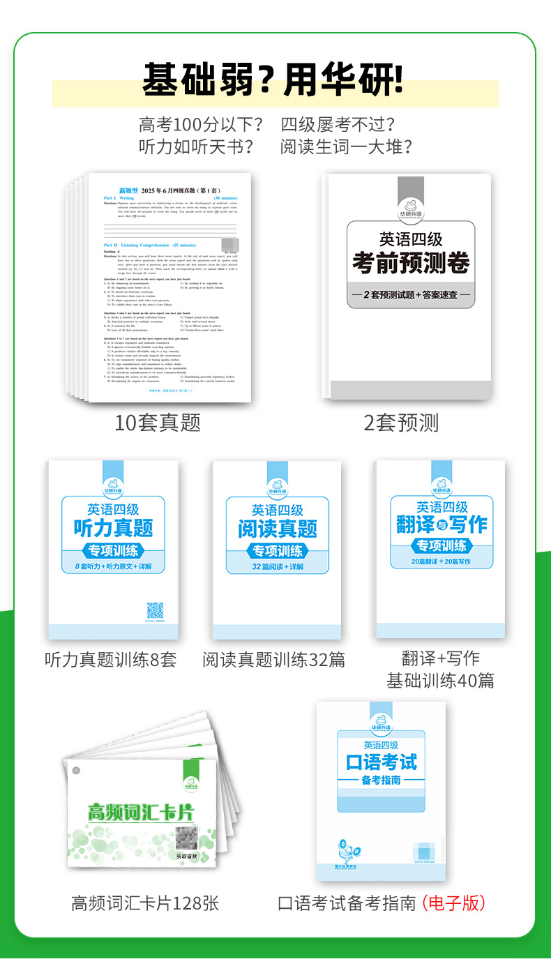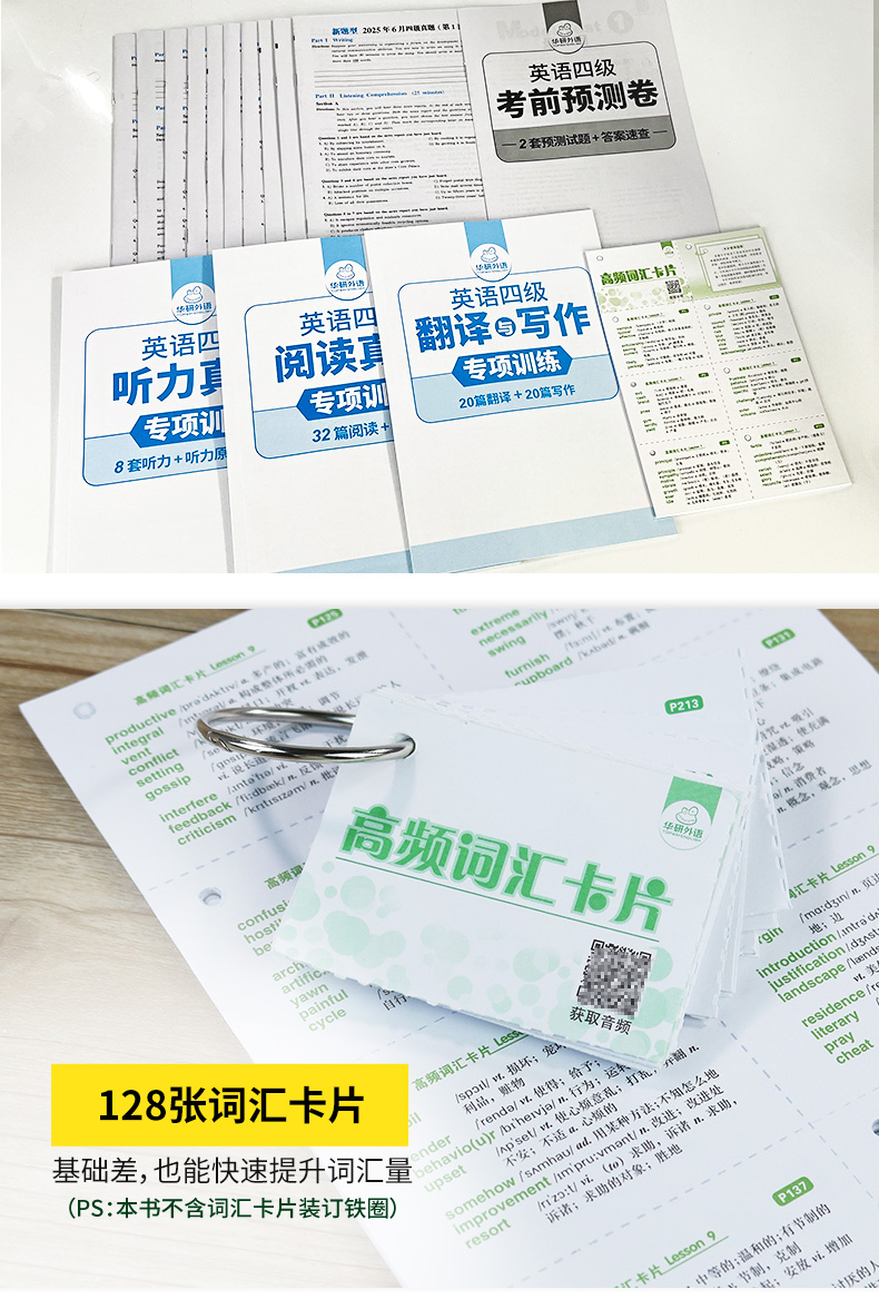 音频:英语四级真题试卷、预测试卷、词汇、四级口语样卷、听力真题专项训练分册(内文相应页码扫码获取)