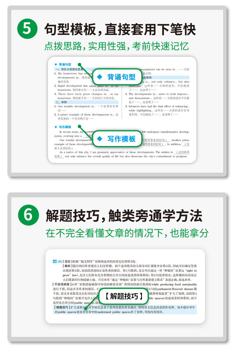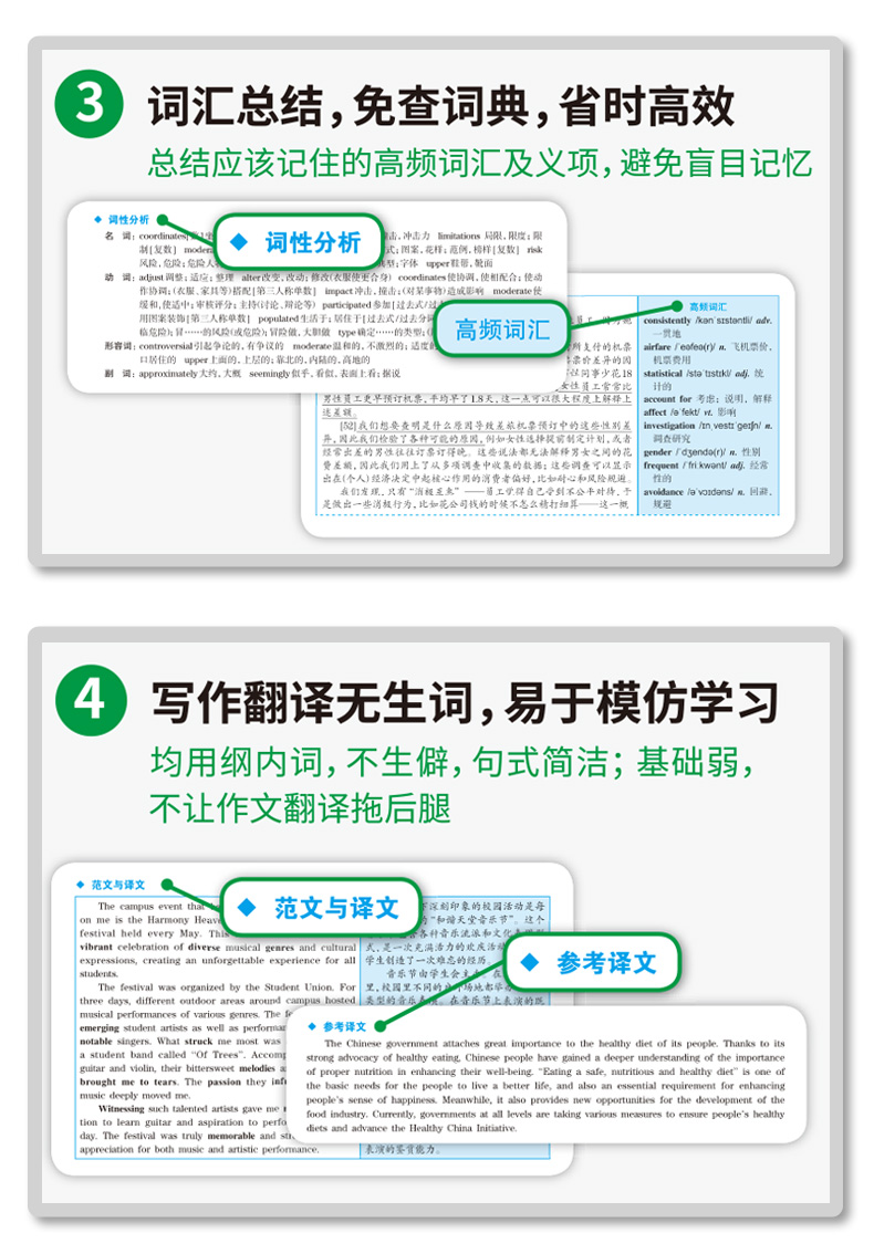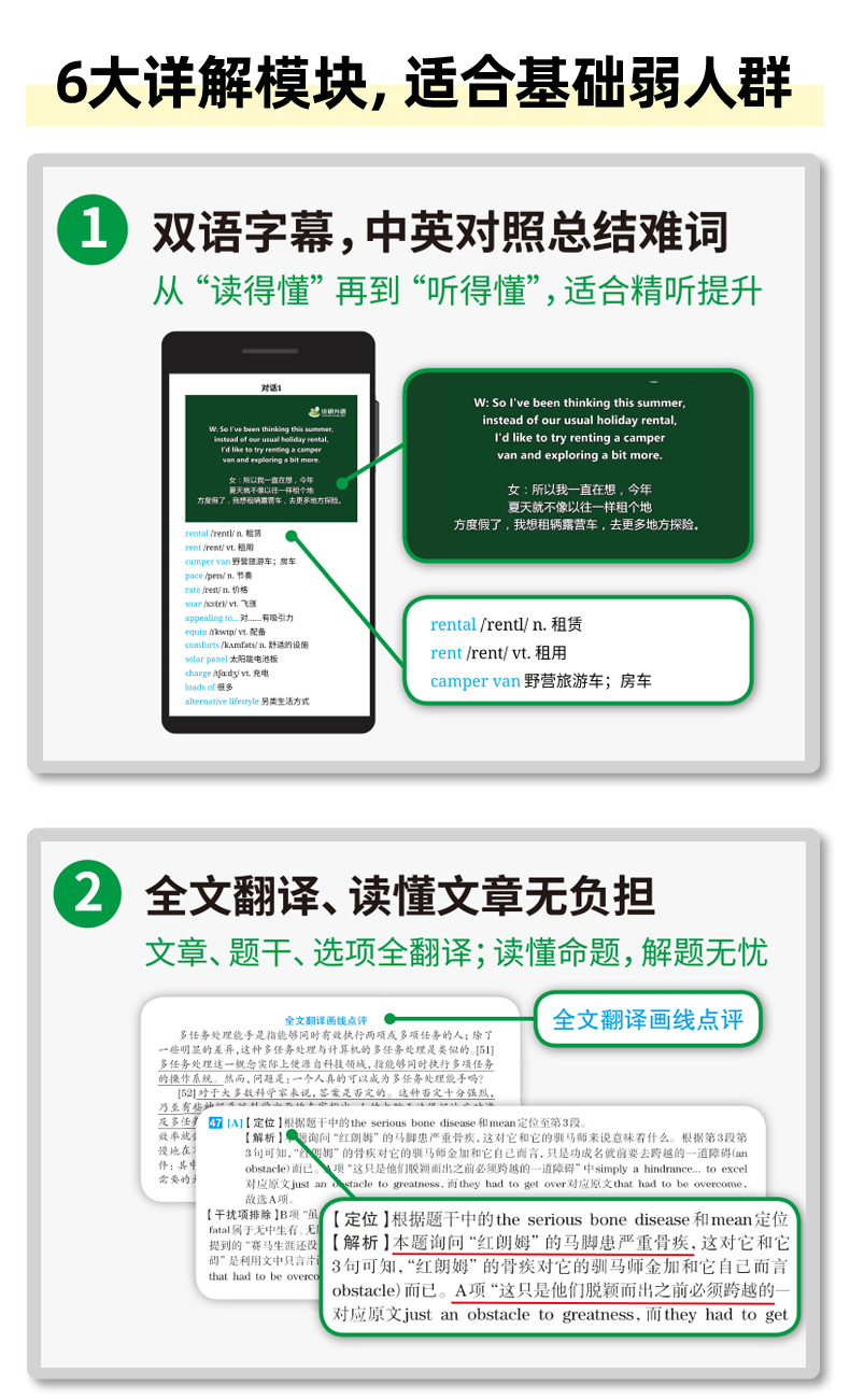 2. 解析6大详解模块,适合基础薄弱者使用:听力双语字幕、阅读全文翻译、词汇总结、写作翻译无生词、句型模板、解题技巧。