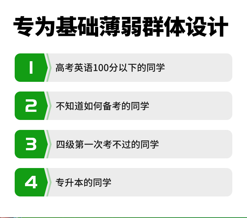 英语基础薄弱,备考方向不明确的考生;高考英语100分以下的考生;四级屡考不过的考生;做真题遇到较多生词的考生。