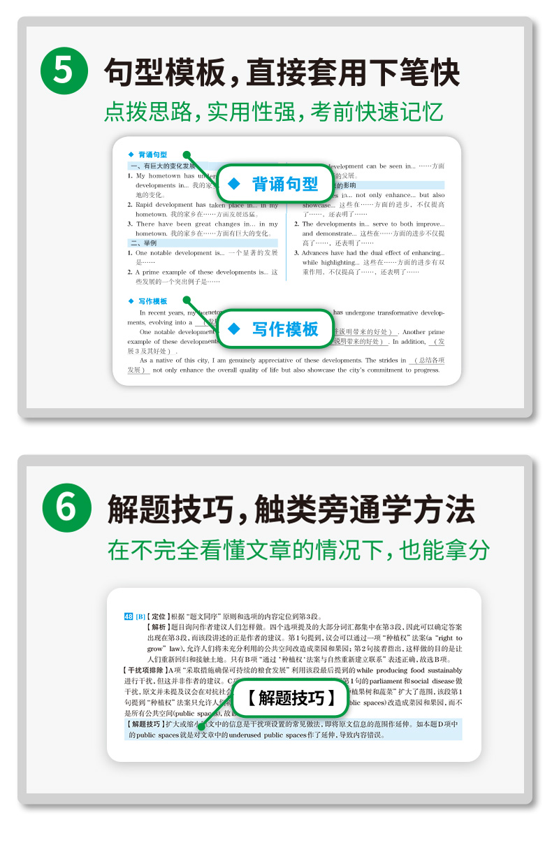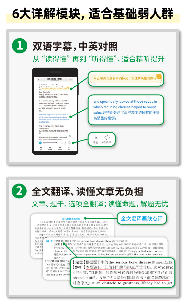 5. 解析6大详解模块,适合基础薄弱者使用:听力双语字幕、阅读全文翻译、词汇总结、写作翻译无生词、句型模板、解题技巧。