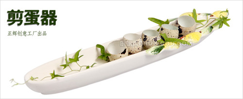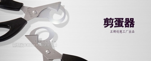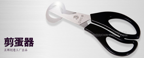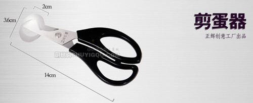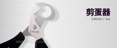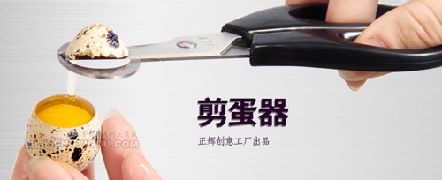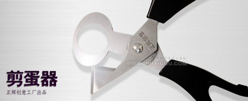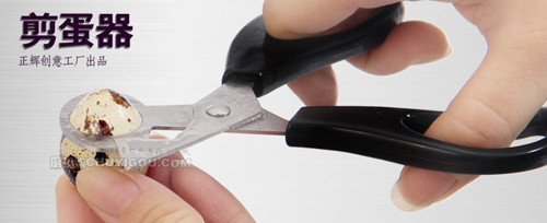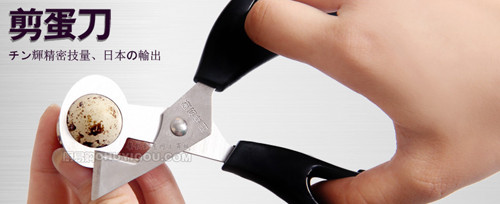 先把鸽蛋或鹌鹑蛋之类的小型蛋由剪蛋器下方放入到剪蛋器的圆环内,左手拿住鹌鹑蛋的下部,向上用力顶住,右手拿住剪蛋器握把,把左侧刀片的尖头顶住鹌鹑蛋的侧面中心,然后用力剪下去,即可迅速地把蛋壳上端剪下,剪切口非常光滑平整,没有碎壳掉入蛋中。