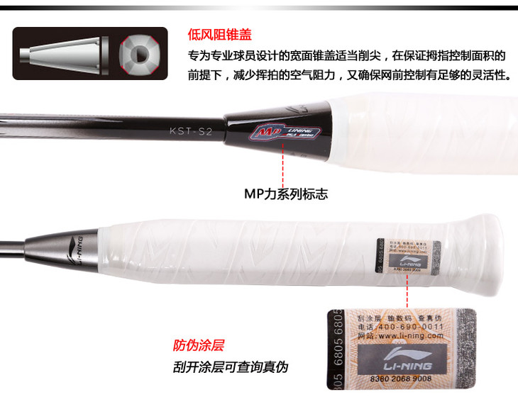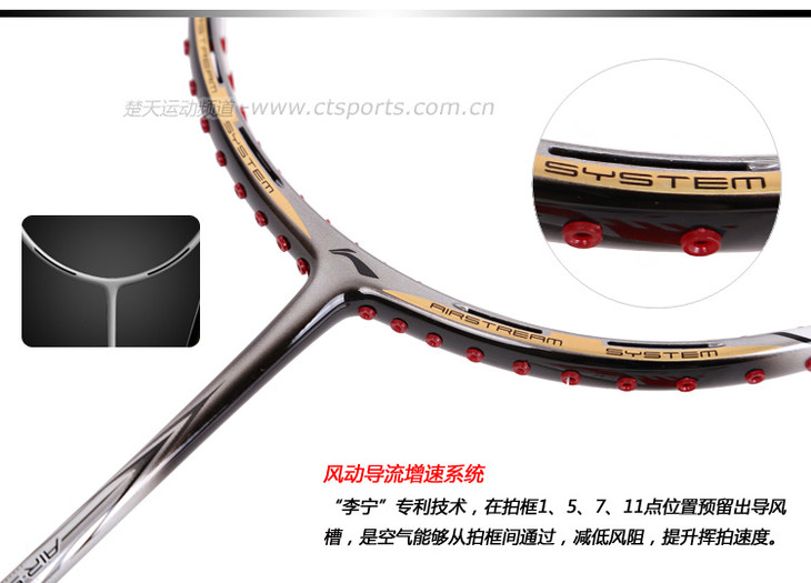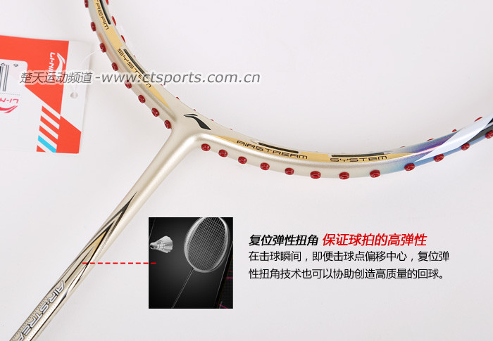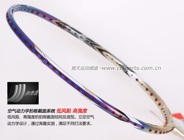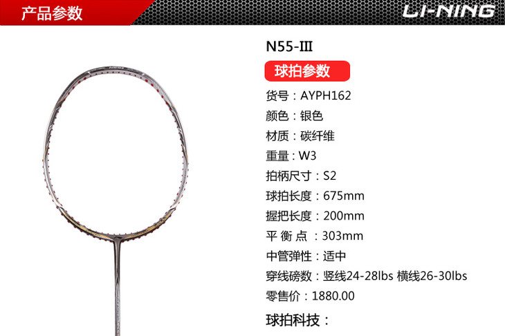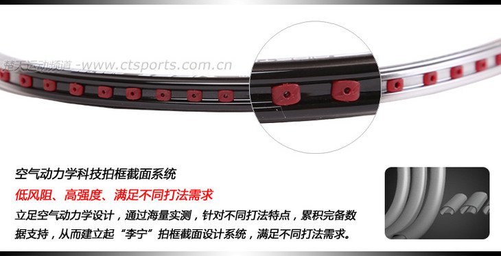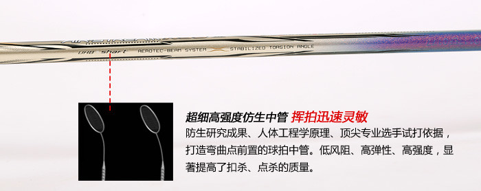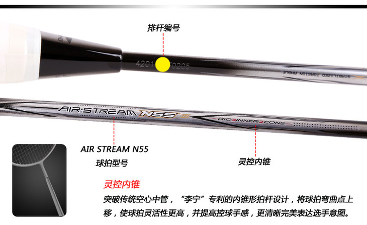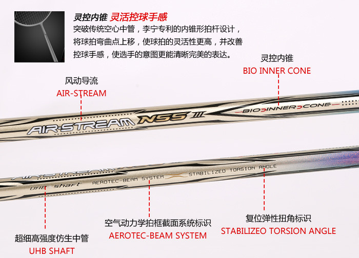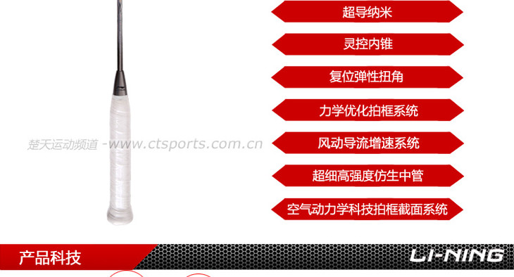 科技:第三代李宁风动导流增速科技 + 力学优化拍框 + 机翼恒定系统 + 超细高强度仿生中管 + 超导纳米 + 灵控内锥 + 空气动力学拍框截面系统 + 复位弹性扭角