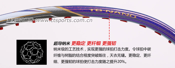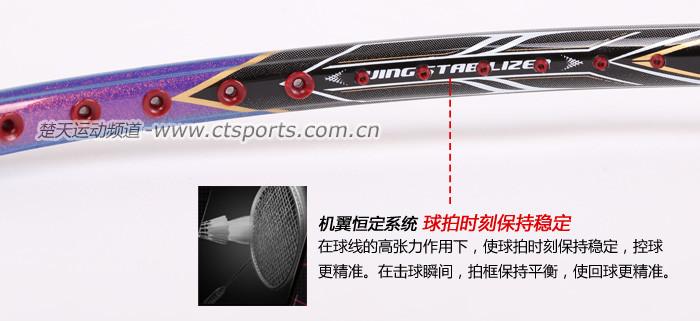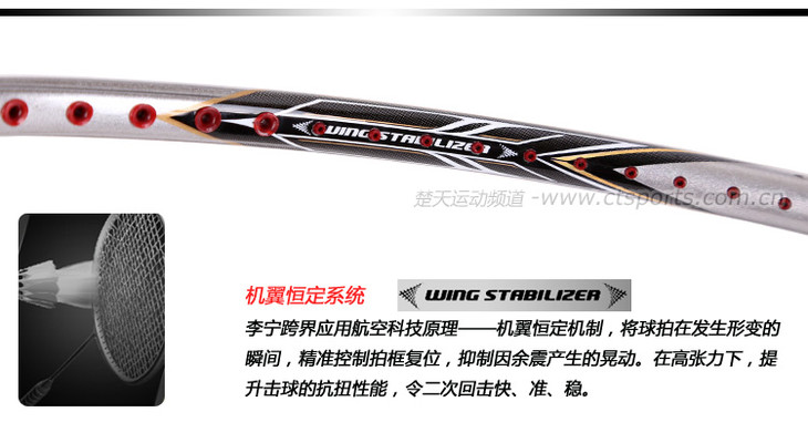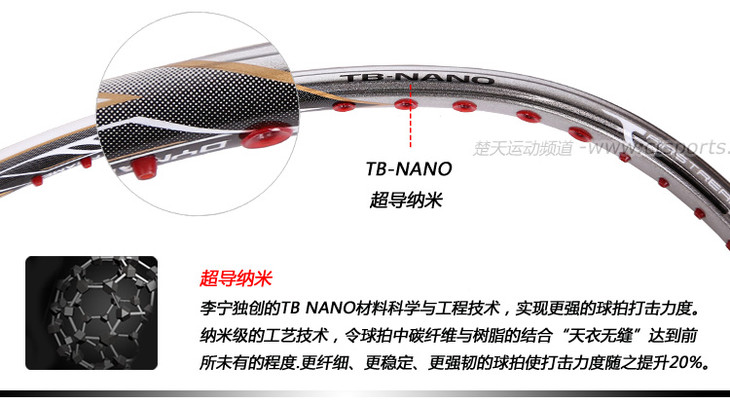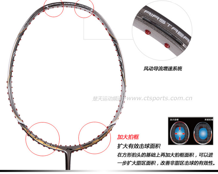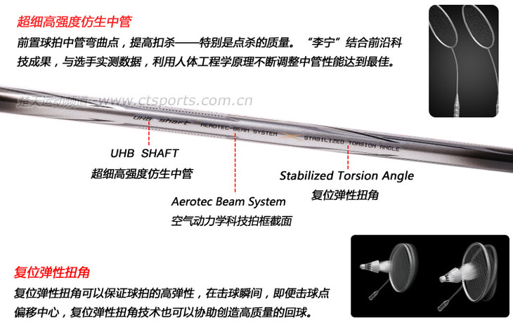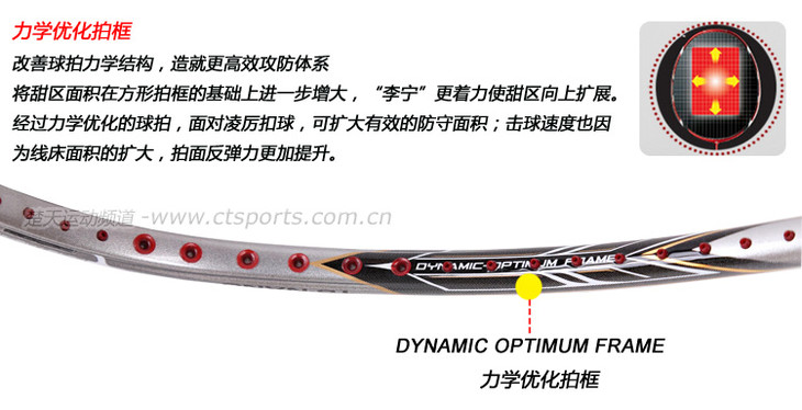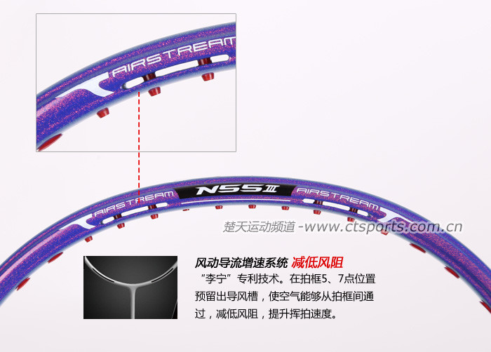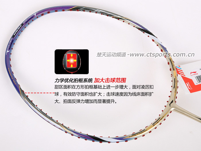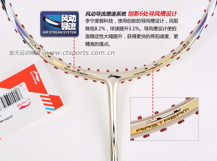 科技:第三代李宁风动导流增速科技 + 力学优化拍框 + 机翼恒定系统 + 超细高强度仿生中管 + 超导纳米 + 灵控内锥 + 空气动力学拍框截面系统 + 复位弹性扭角