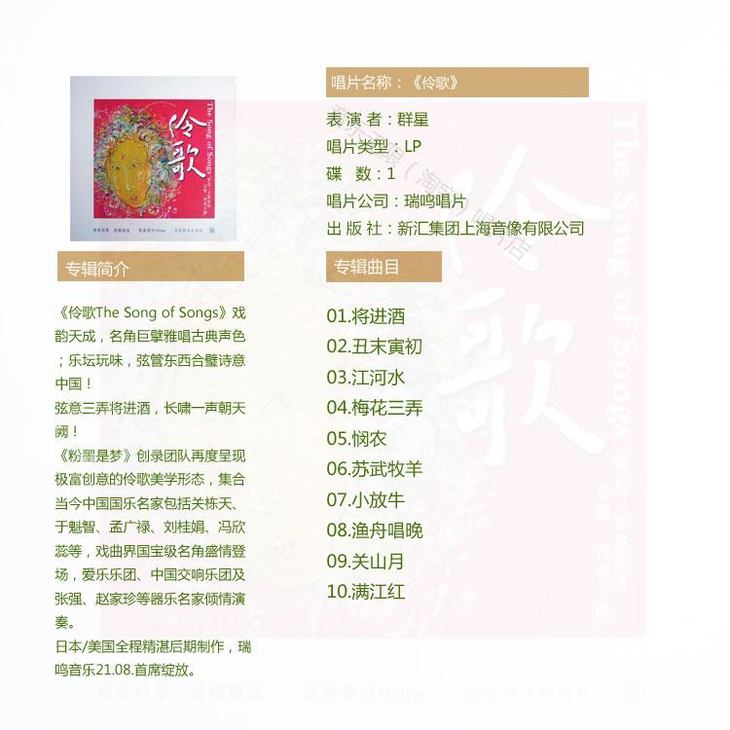 瑞鸣正品 经典发烧唱片 原创戏曲风格《伶歌》全新LP黑胶