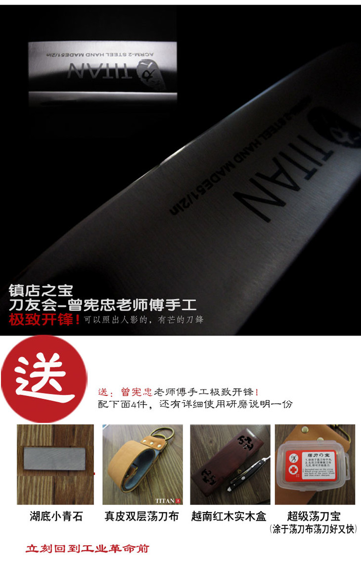 锋口: 由曾宪忠老师傅手工开锋到锋利无比!到手即用(正确使用都100%能满足之前部分顾客的变态要求。1、刮下肉眼难看到的透明毫毛、2.刮下生长10小时的的胡子、等等...)。