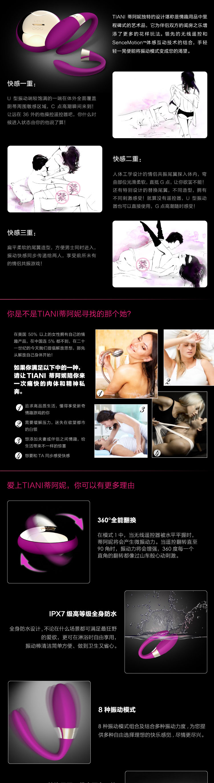 蒂阿妮光滑柔韧,采用安全硅胶材质,100%防水