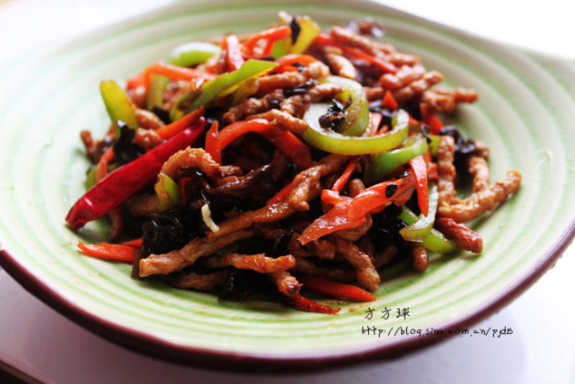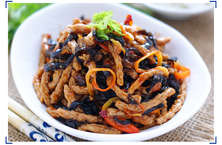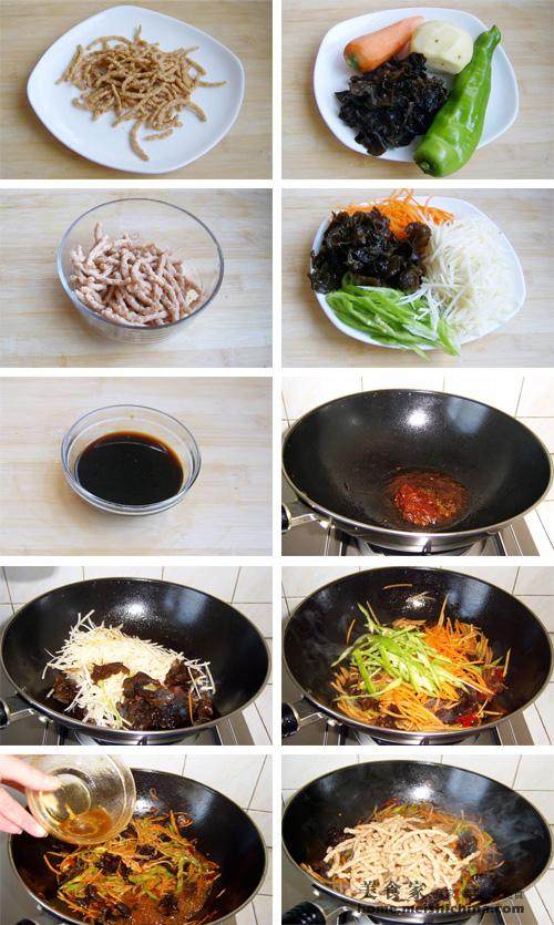 | 做法: | 1、大豆拉丝蛋白丝用凉水泡20分钟,挤干水分。 2、下胡萝卜丝,木耳,青椒丝炒软,同时取一小碗用酱油、精盐、白糖、米醋 |