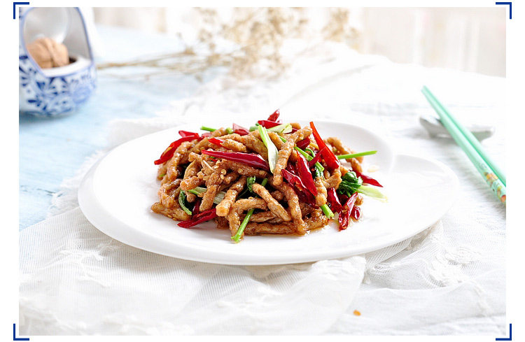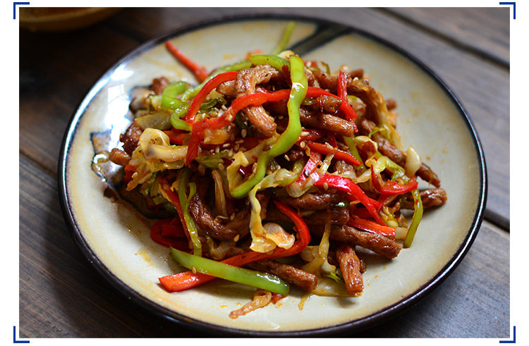 | 材料: | 大豆拉丝蛋白,胡萝卜,青椒,木耳。 |